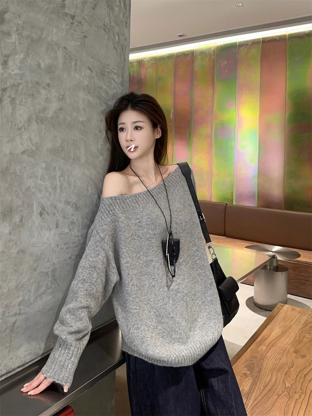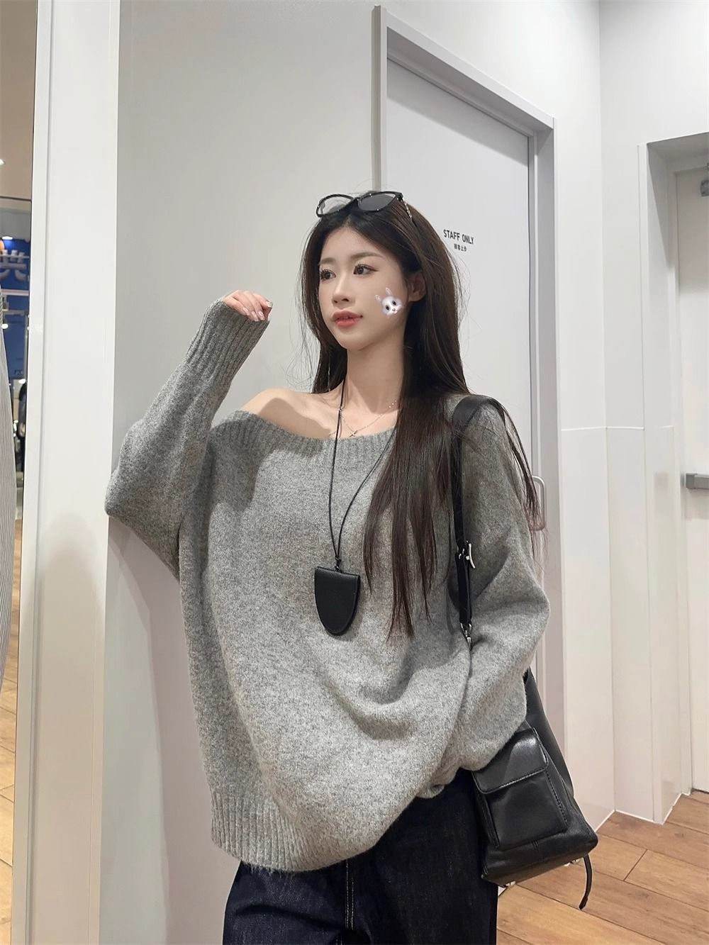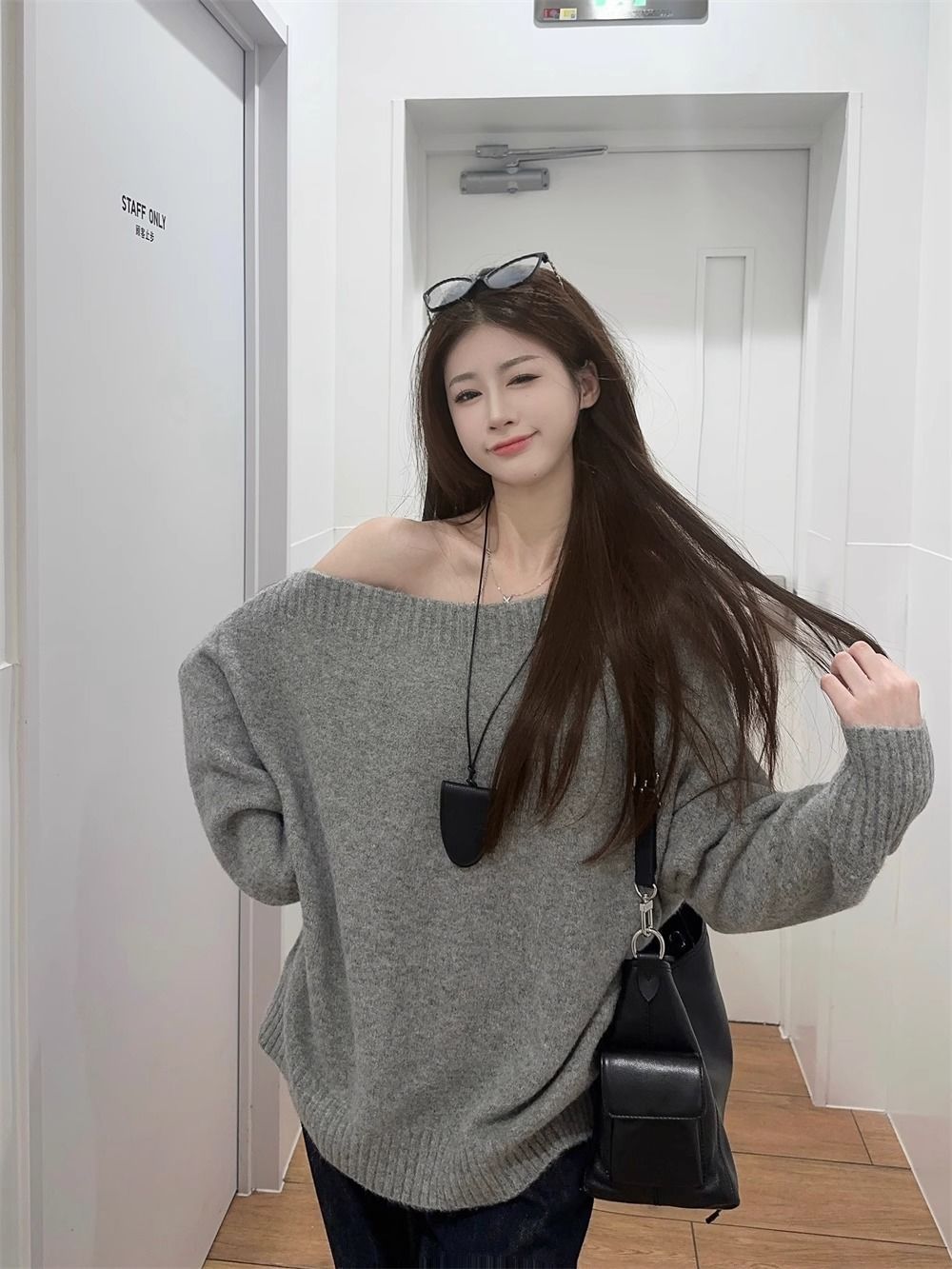 게으른 스타일 부드러운 왁스 슬랜트 어깨 긴팔 니트 스웨터 여성의 가을 시대 감소 가을 및 겨울 사이버 연예인 느슨한 슬리밍 숄더 탑