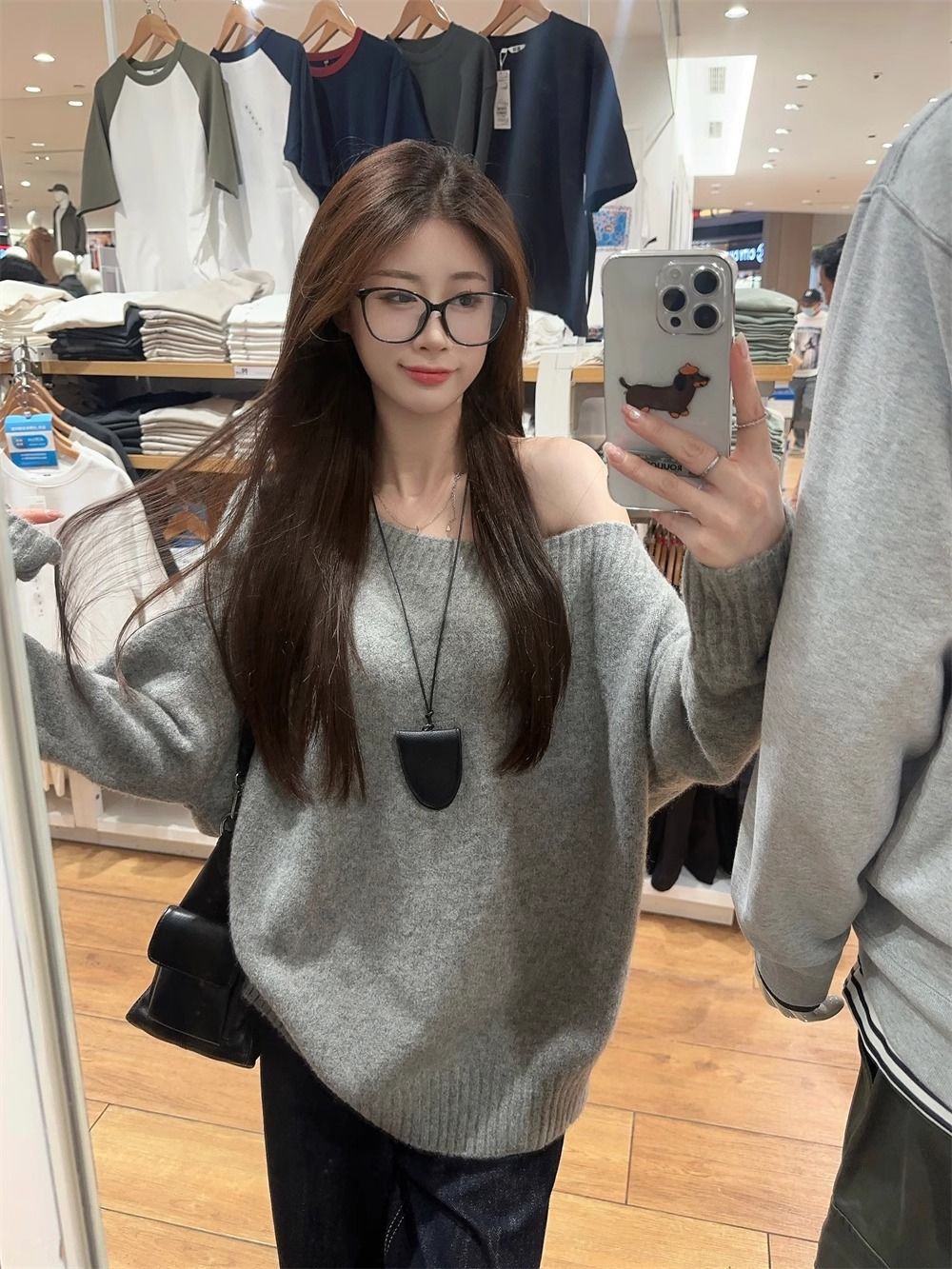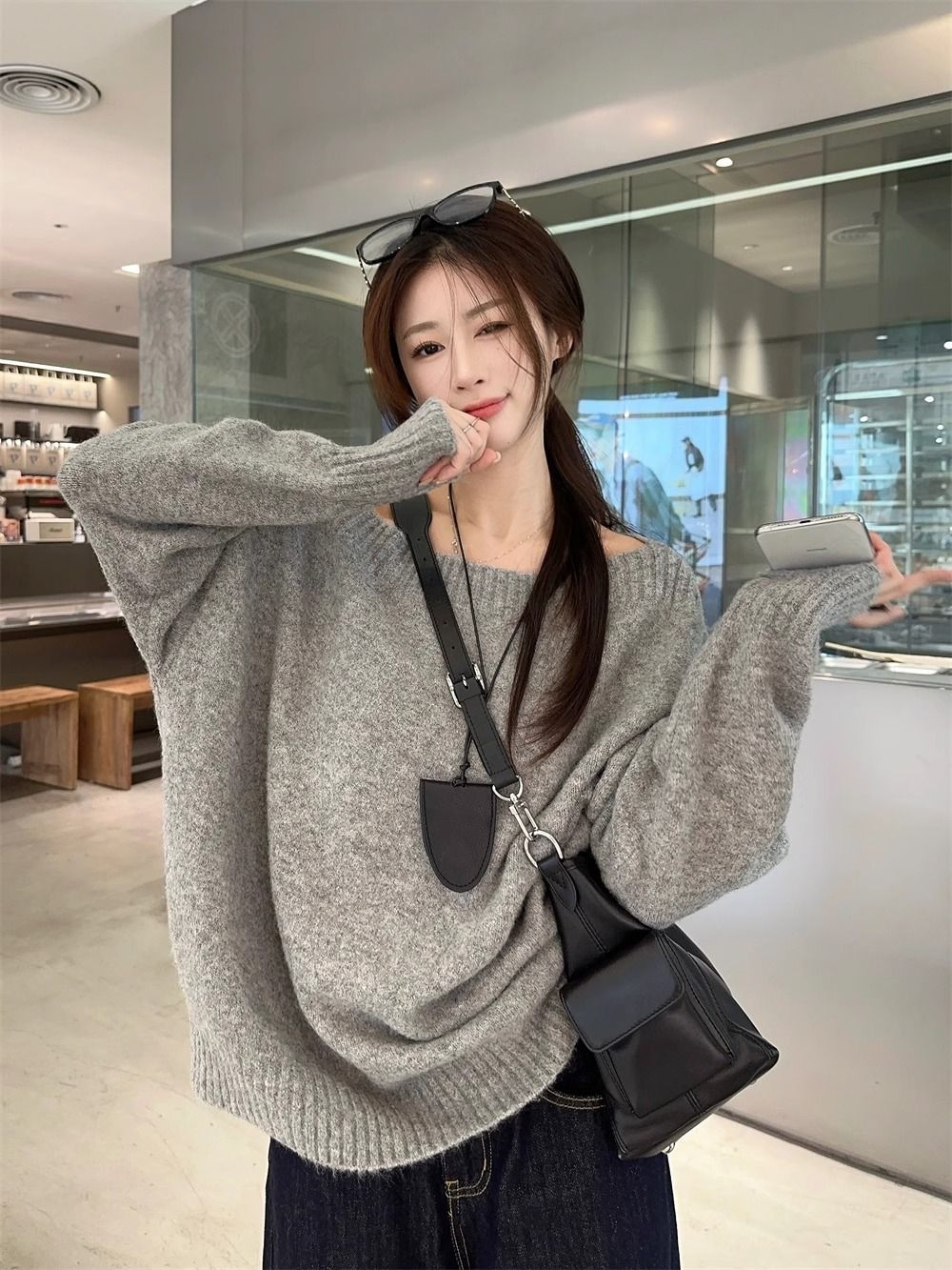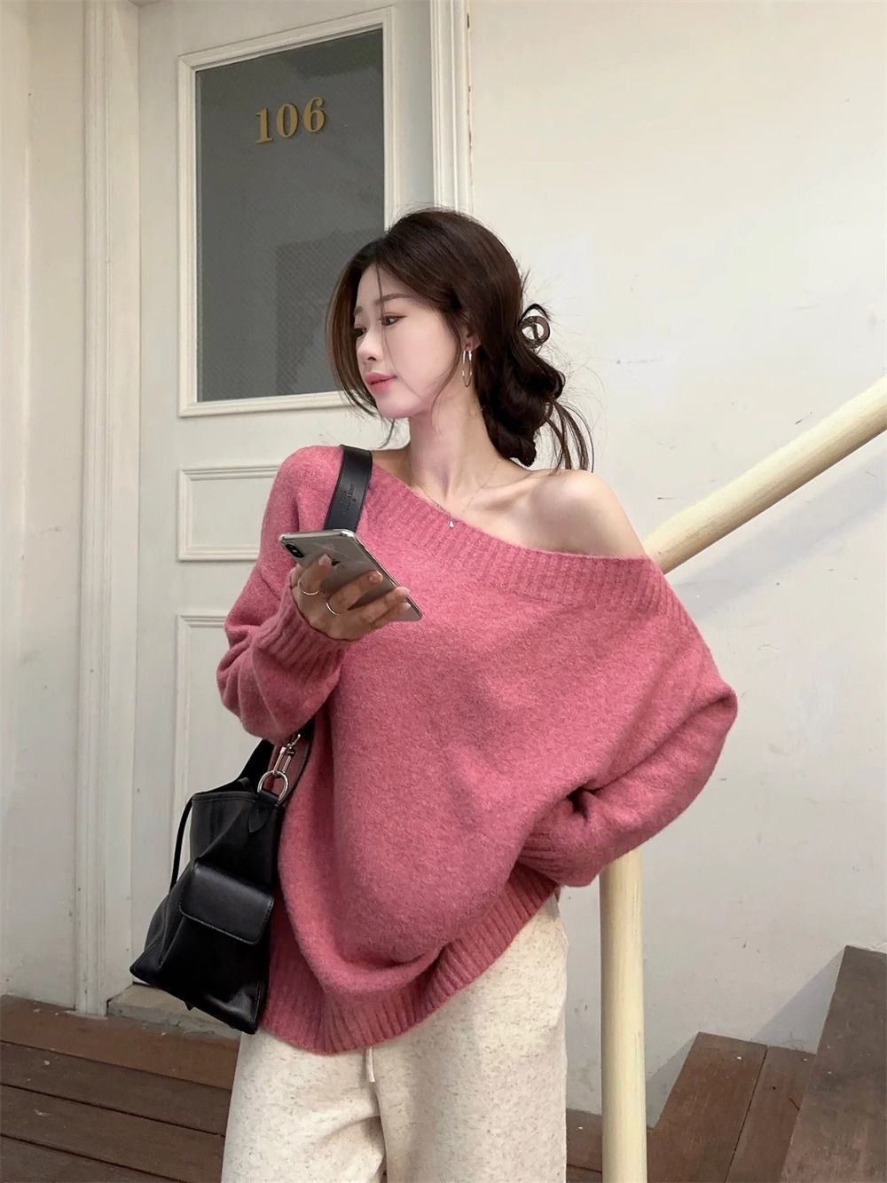 게으른 스타일 부드러운 왁스 슬랜트 어깨 긴팔 니트 스웨터 여성의 가을 시대 감소 가을 및 겨울 사이버 연예인 느슨한 슬리밍 숄더 탑