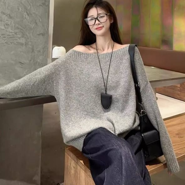 게으른 스타일 부드러운 왁스 슬랜트 어깨 긴팔 니트 스웨터 여성의 가을 시대 감소 가을 및 겨울 사이버 연예인 느슨한 슬리밍 숄더 탑스토어 가기
