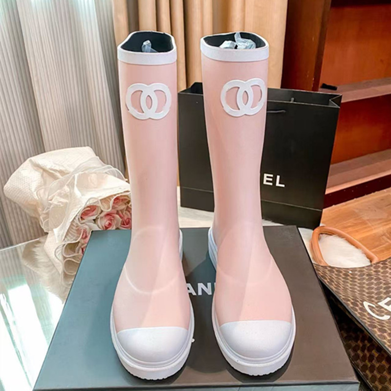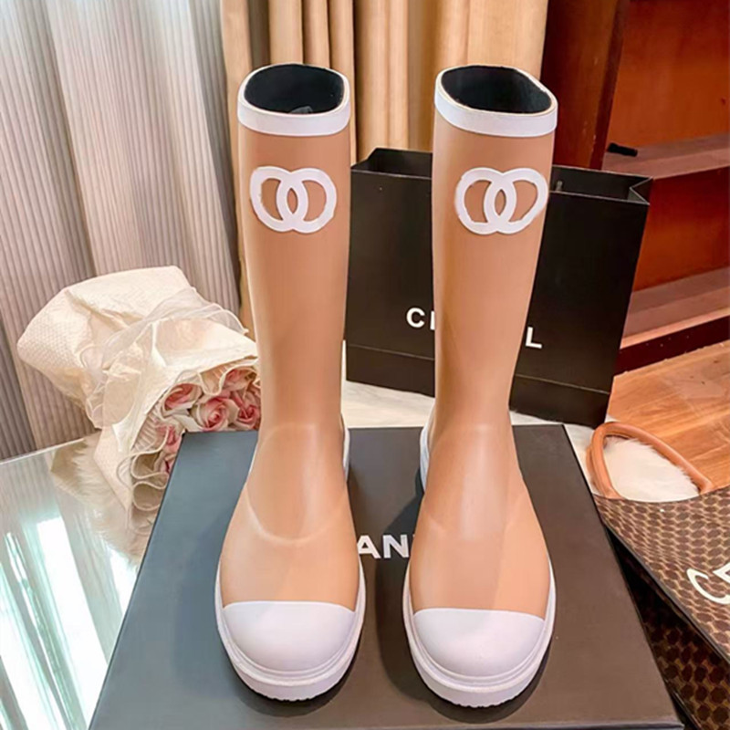 샤넬 스타일 라운드 헤드 두꺼운 하단 중간 높이 방수 장화 여성용 라이더 부츠 사이버 인기 유행 유행 블랙 그러나 무릎 롱 부츠
