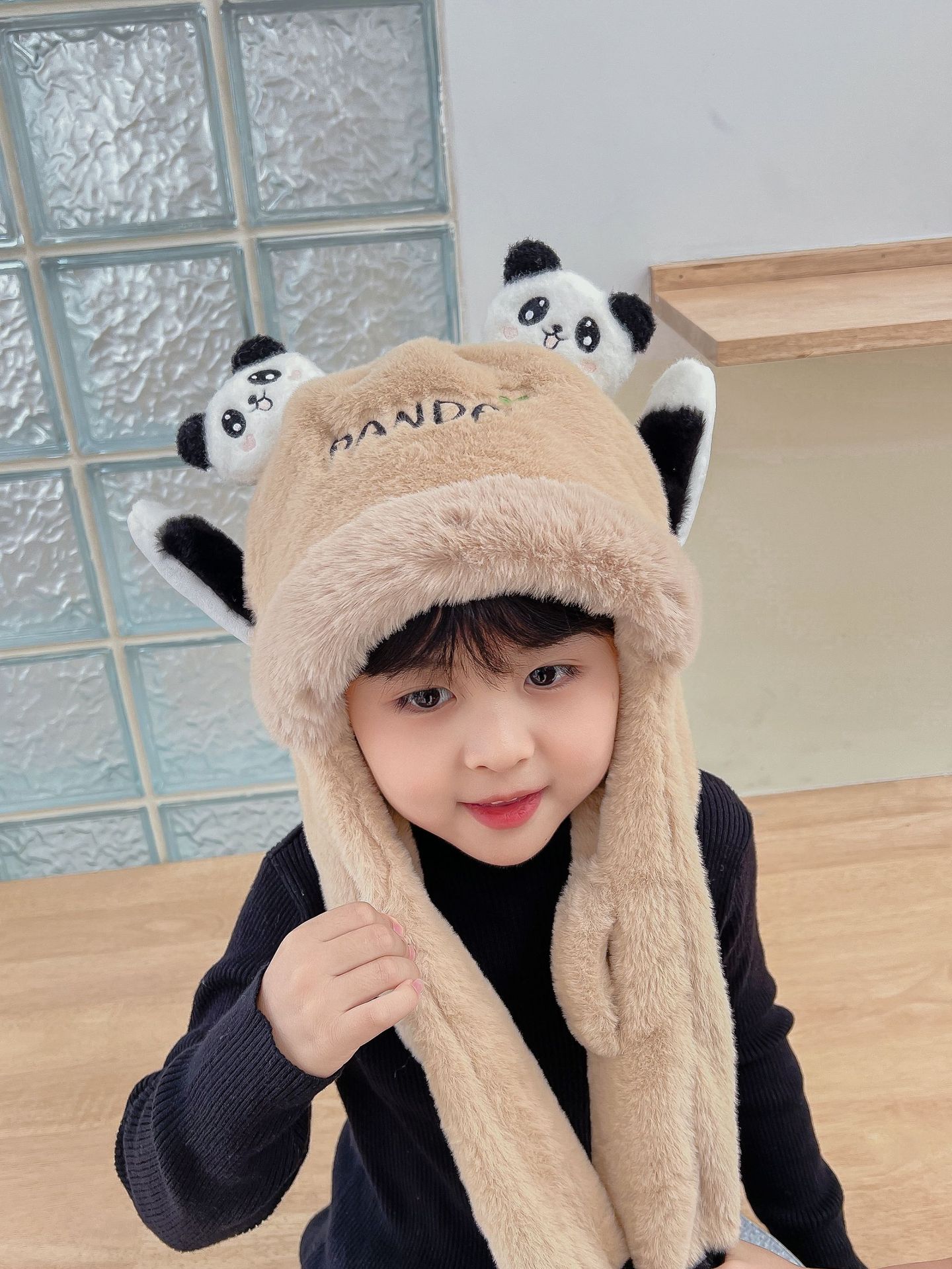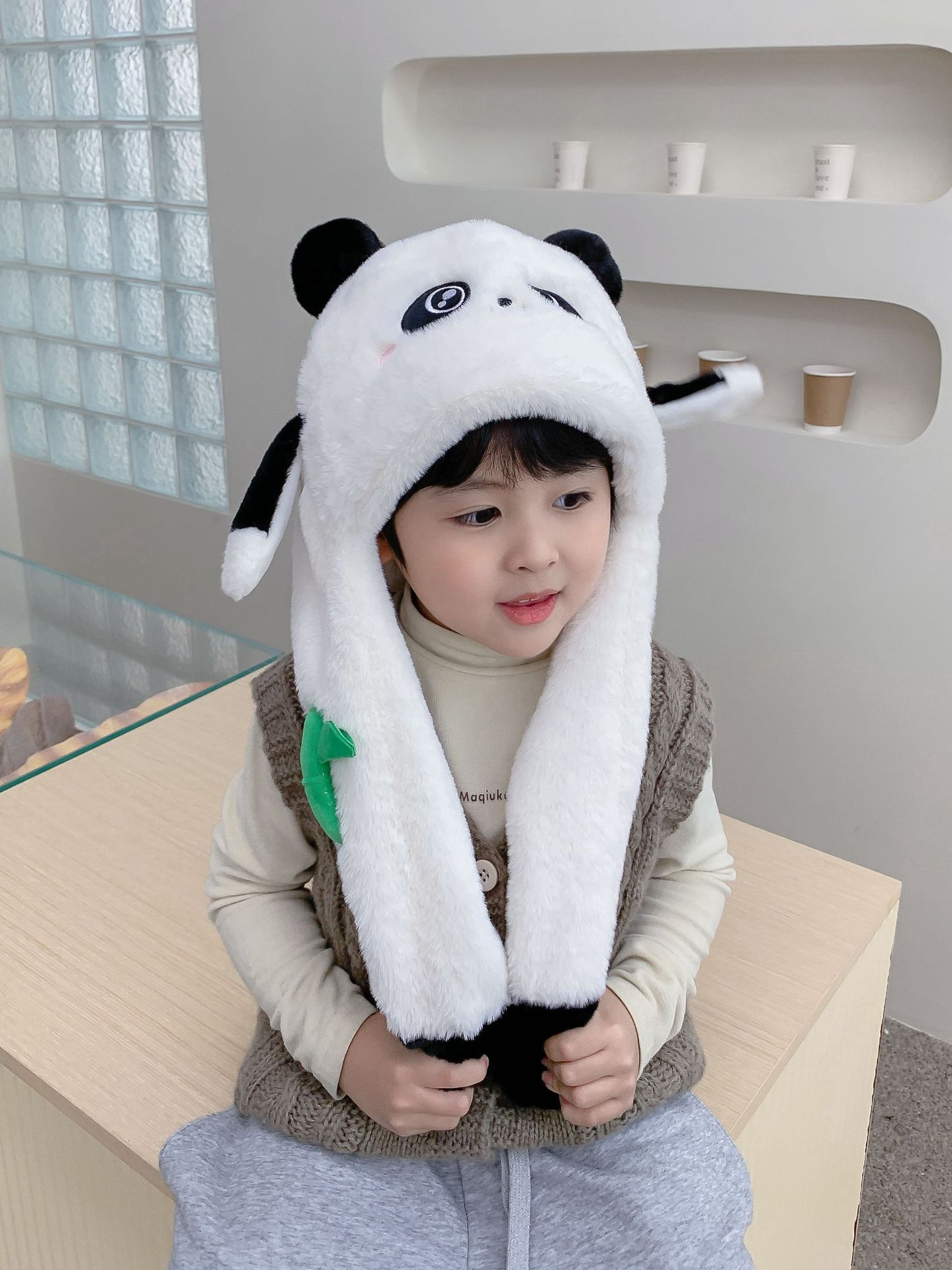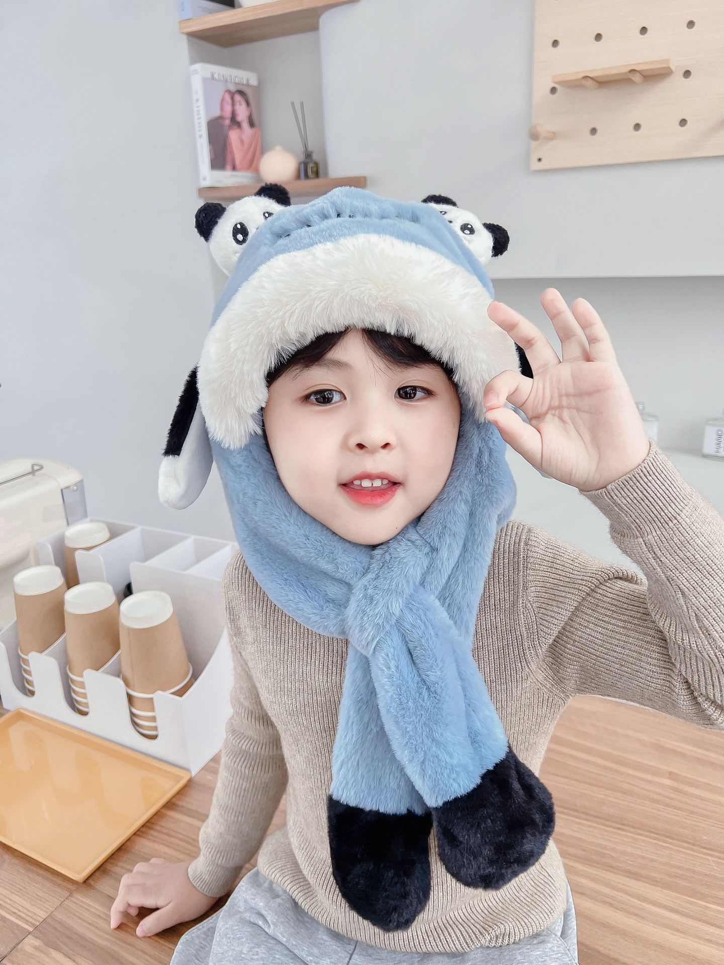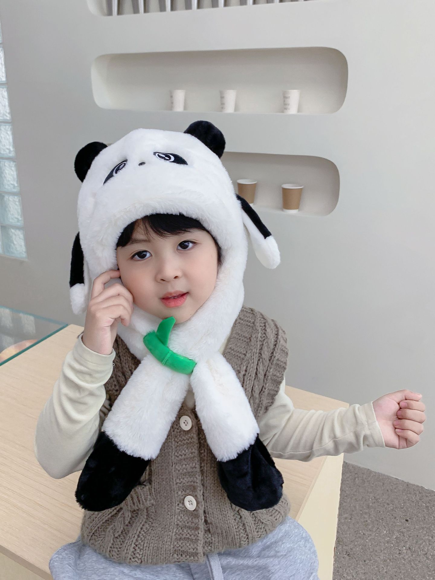 자이언트 팬더 모자와 스카프 통합 어린이 어린 소년 아기의 귀 이동 기모 두꺼운 가을과 겨울 목스토어 가기
