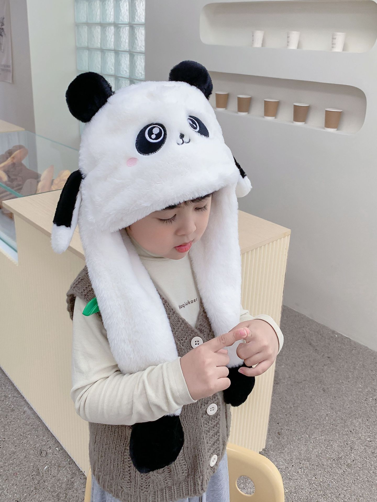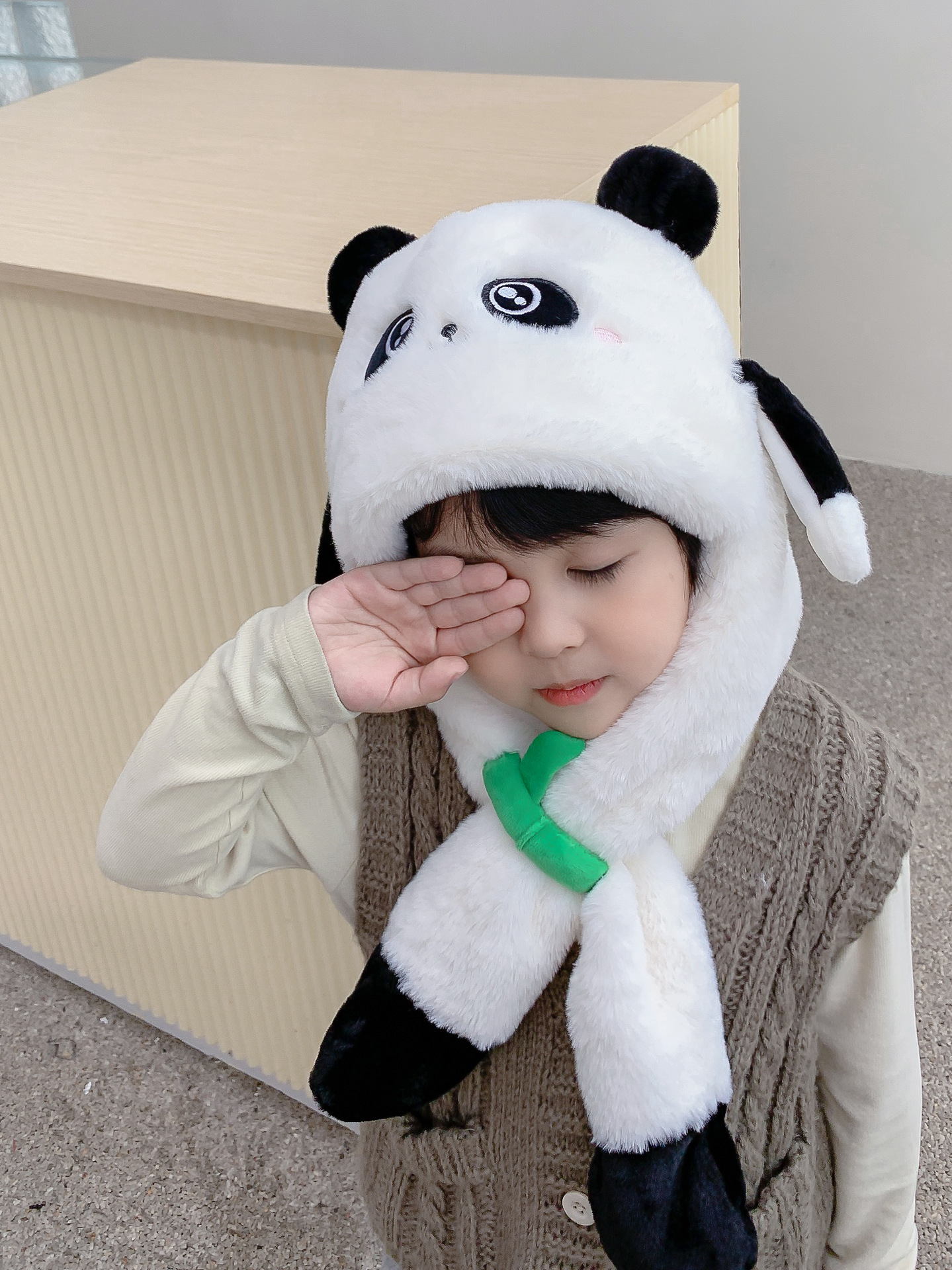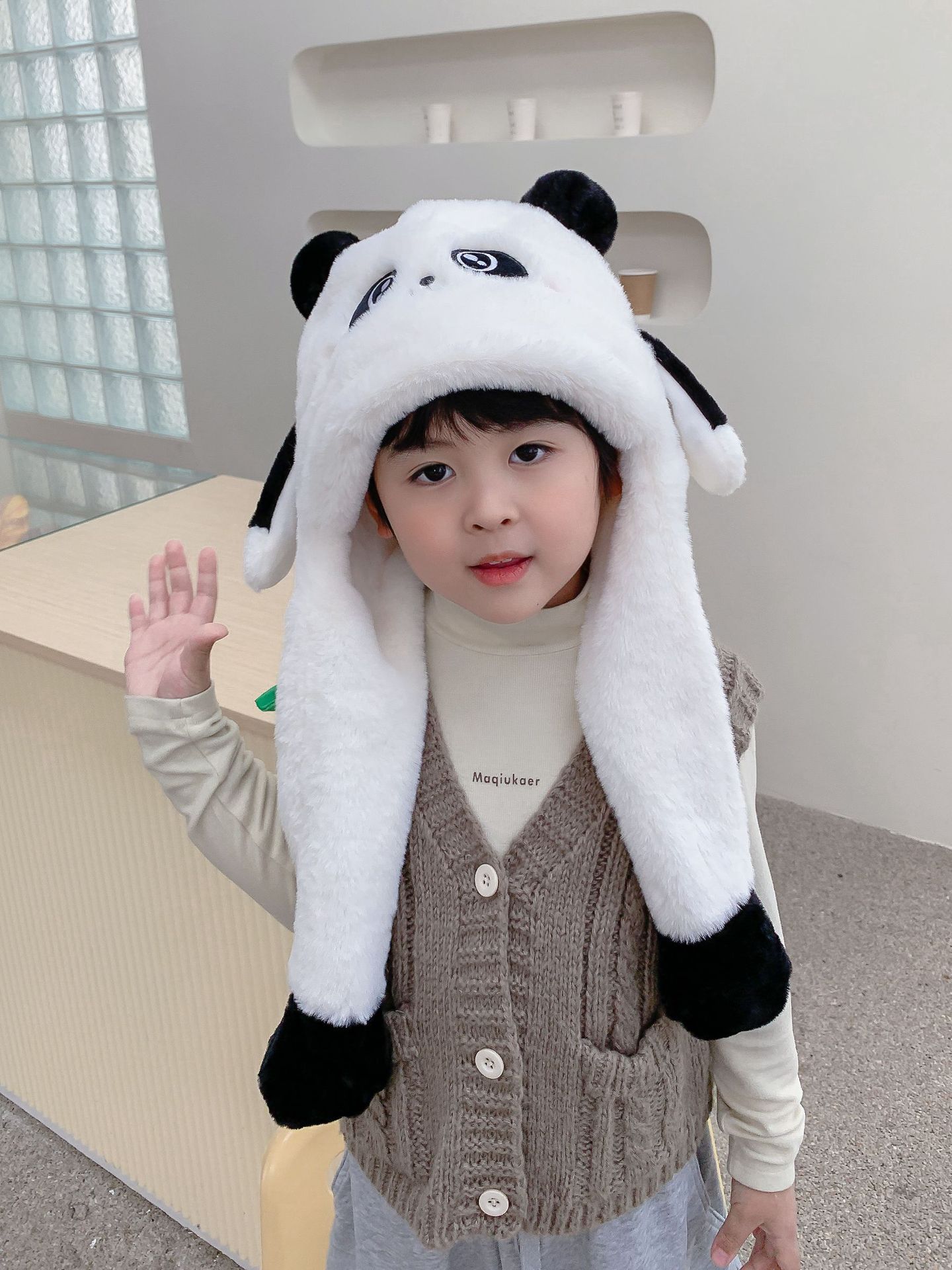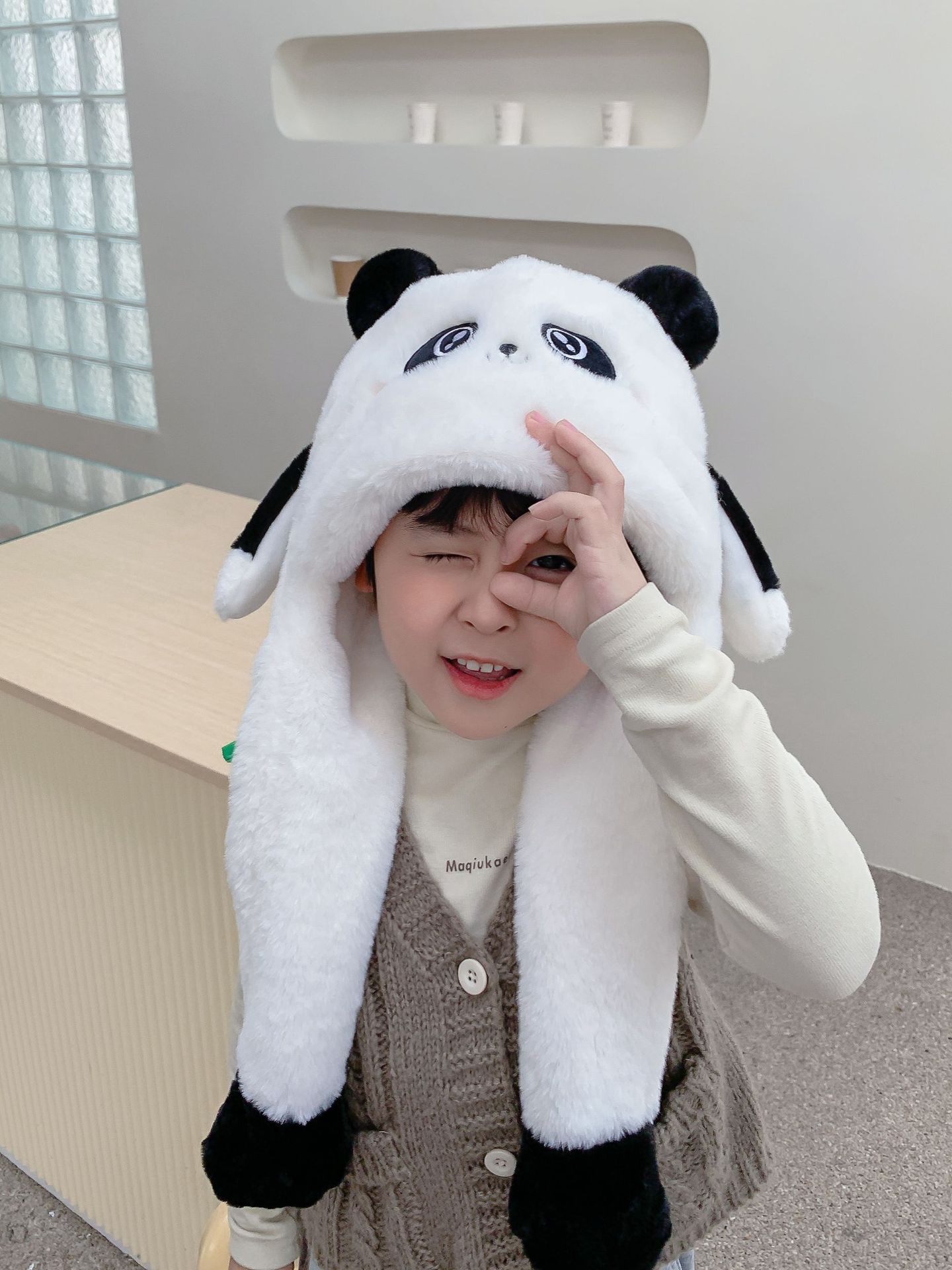 자이언트 팬더 모자와 스카프 통합 어린이 어린 소년 아기의 귀 이동 기모 두꺼운 가을과 겨울 목스토어 가기