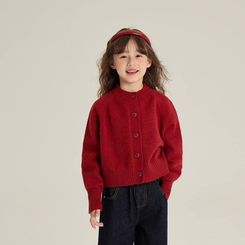 아이모베이베이 여아용 한국 스타일 레드 니트 가디건 2024 겨울 신상 남녀공용 부드럽고 두꺼운 스웨터 재킷