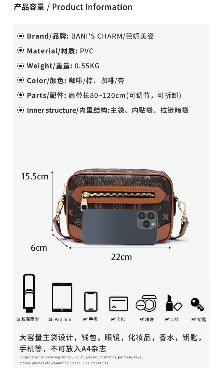 走在潮流尖端的你,怎能错过芭妮美姿的这款女士斜挎小方包?它不仅拥有令人惊艳的大容量设计,轻松容纳你的日常必需品,更以独特的轻奢质感,让你在任何场合都能自信满满。相机、手机、化妆品……一切井然有序,尽在你的掌控之中。
