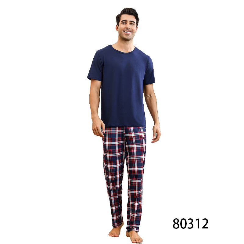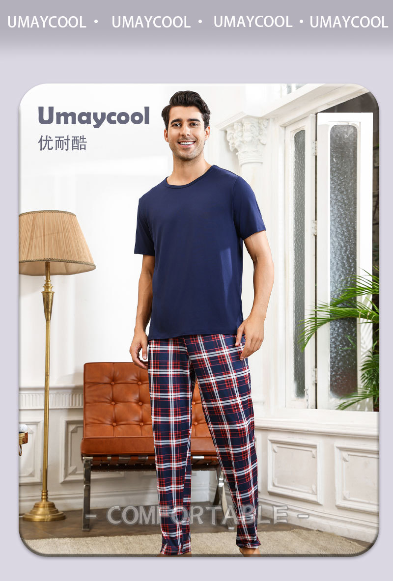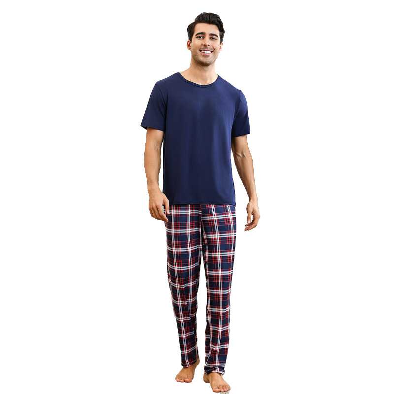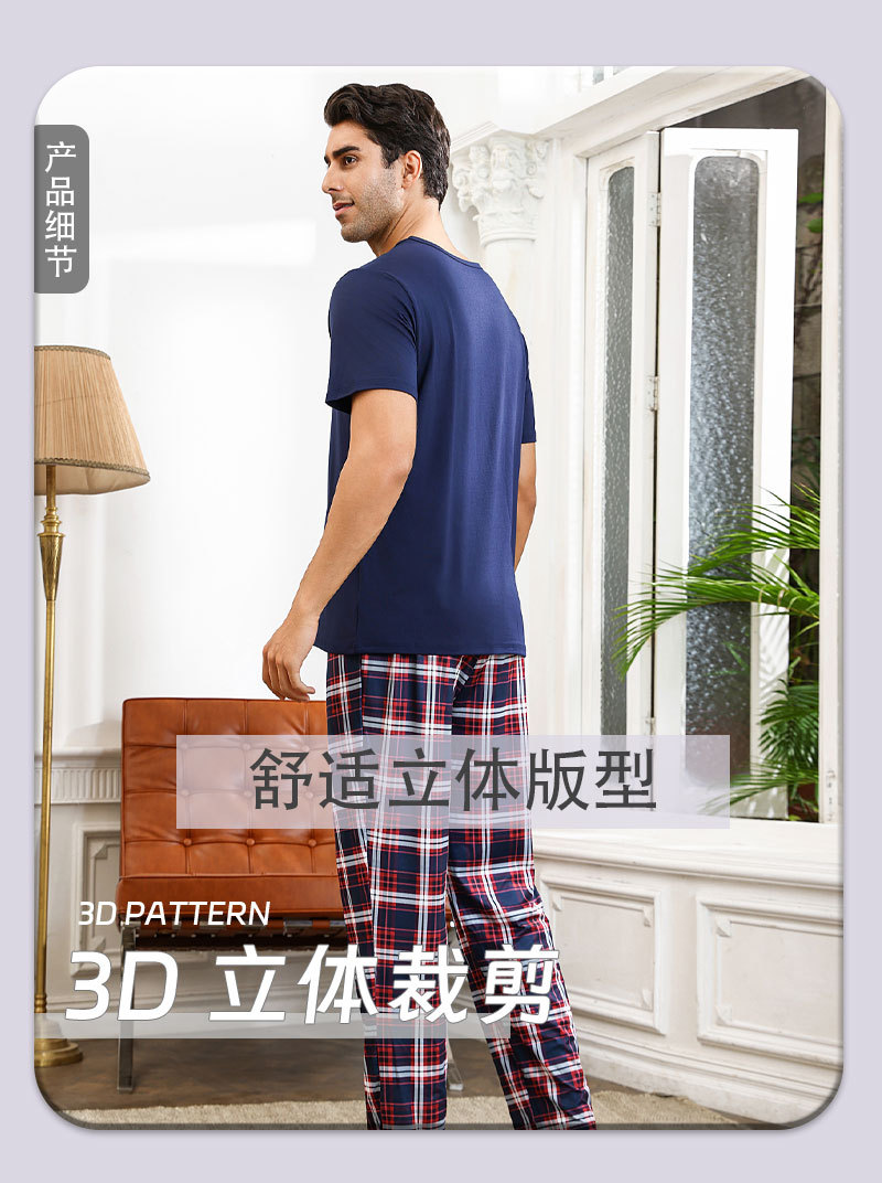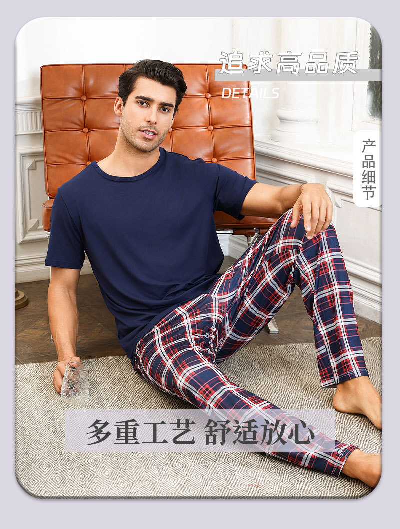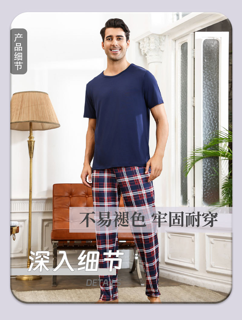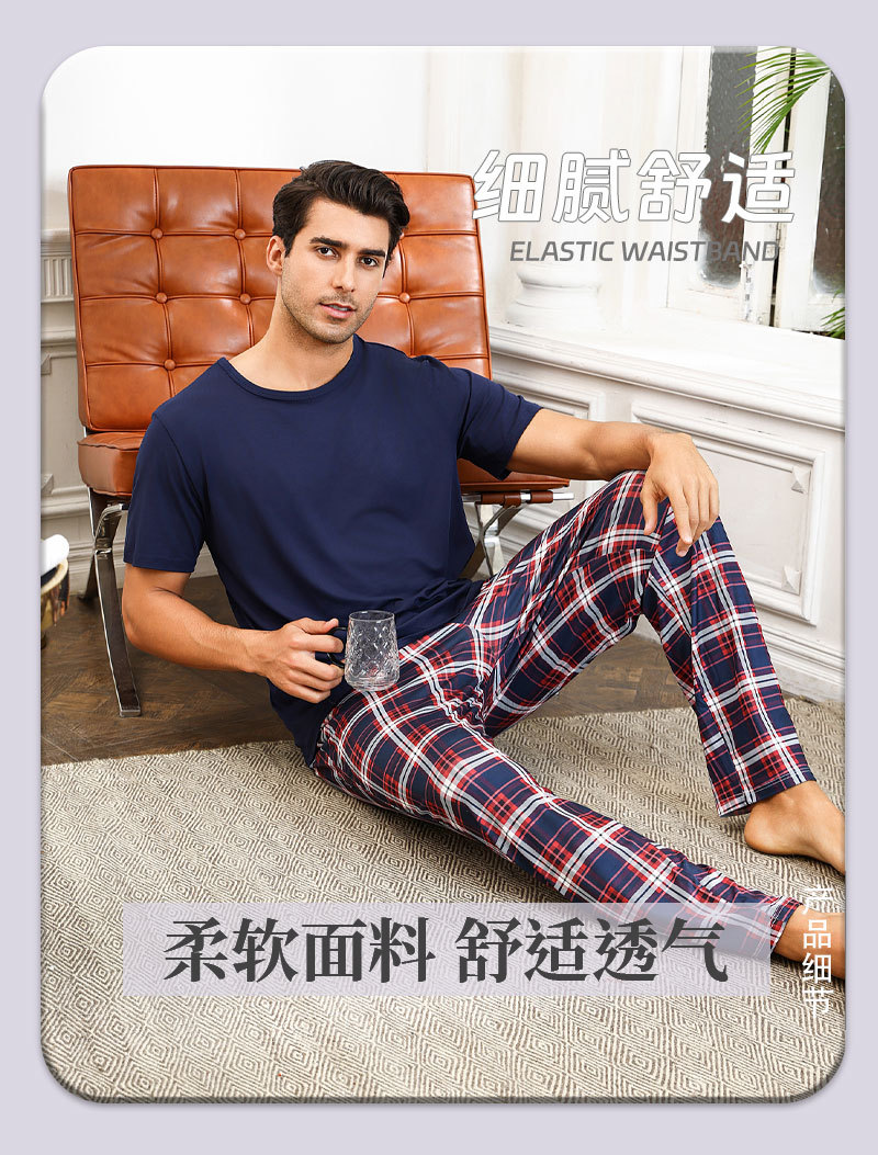 남자 잠옷 남자의 반팔 바지 봄과 가을 플러스 사이즈 잠옷 세트 격자 무늬 인쇄 편안한 통기성 홈 옷스토어 가기