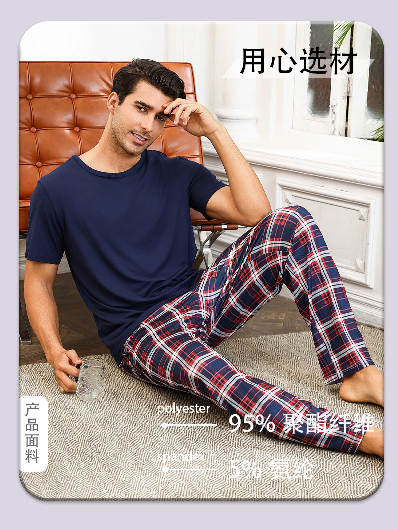 남자 잠옷 남자의 반팔 바지 봄과 가을 플러스 사이즈 잠옷 세트 격자 무늬 인쇄 편안한 통기성 홈 옷