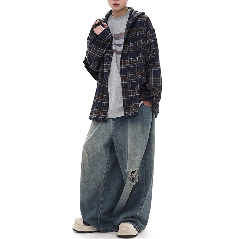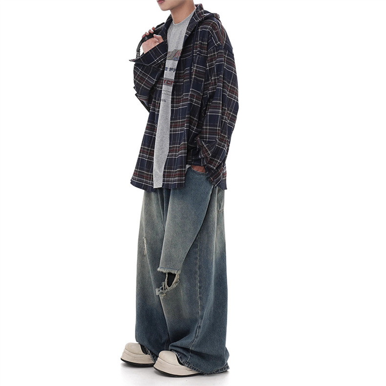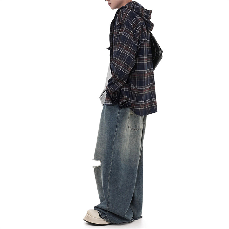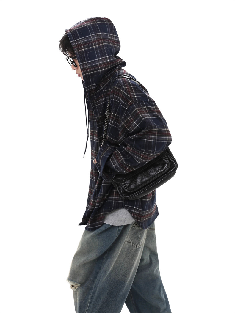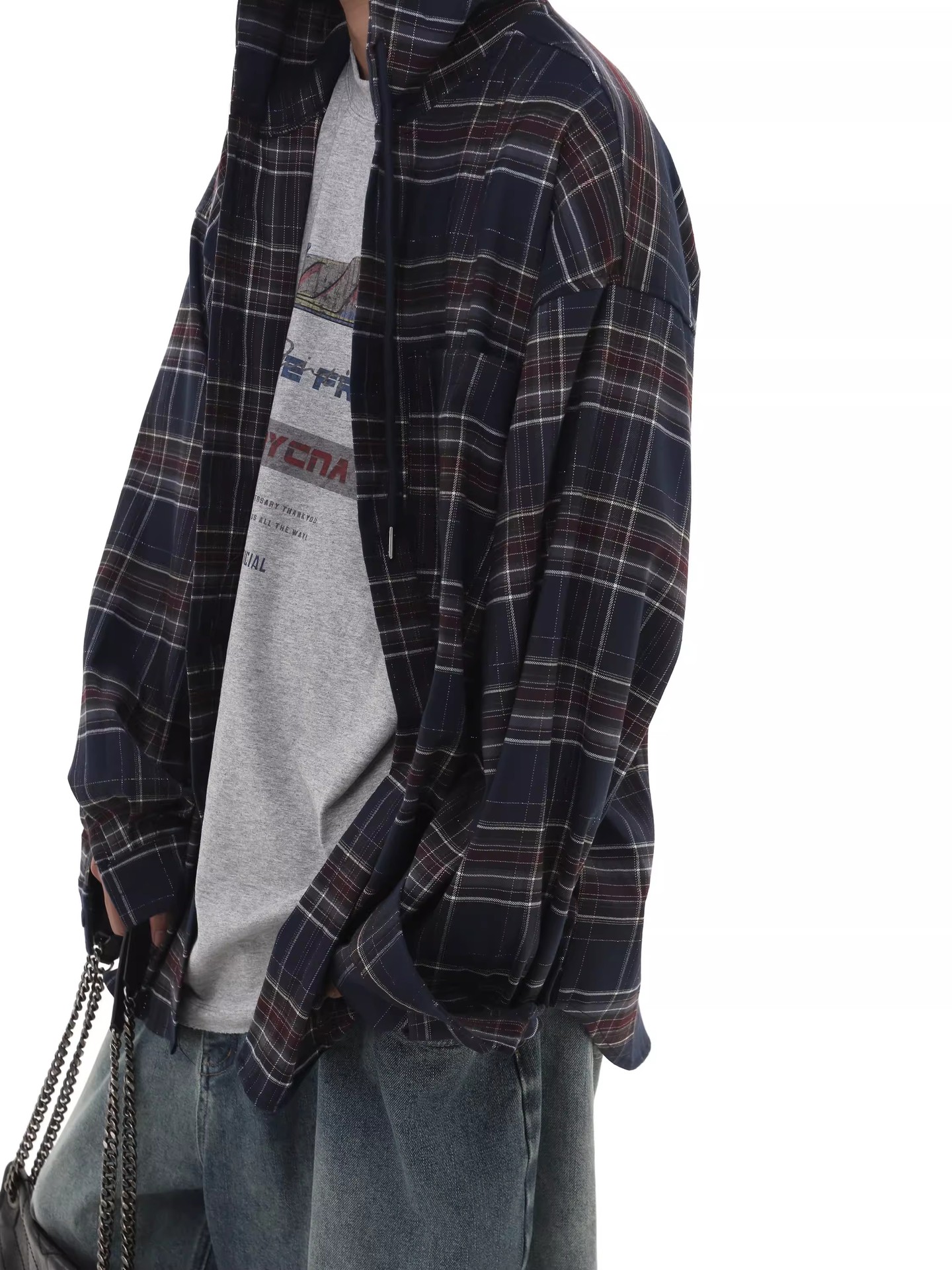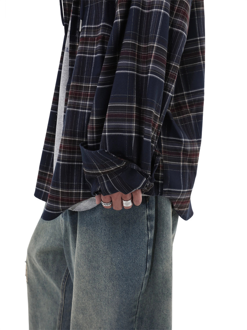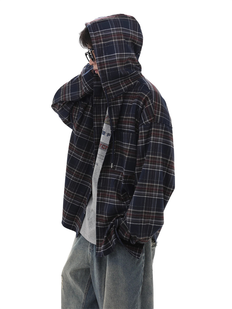 미국식 캐주얼 게으른 트렌디 탑 봄과 가을 후드 캐주얼 레트로 플레이드 긴팔 셔츠 남성용 자켓