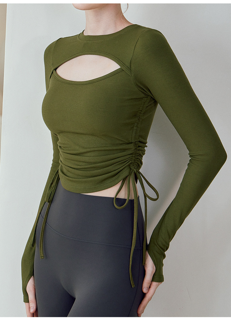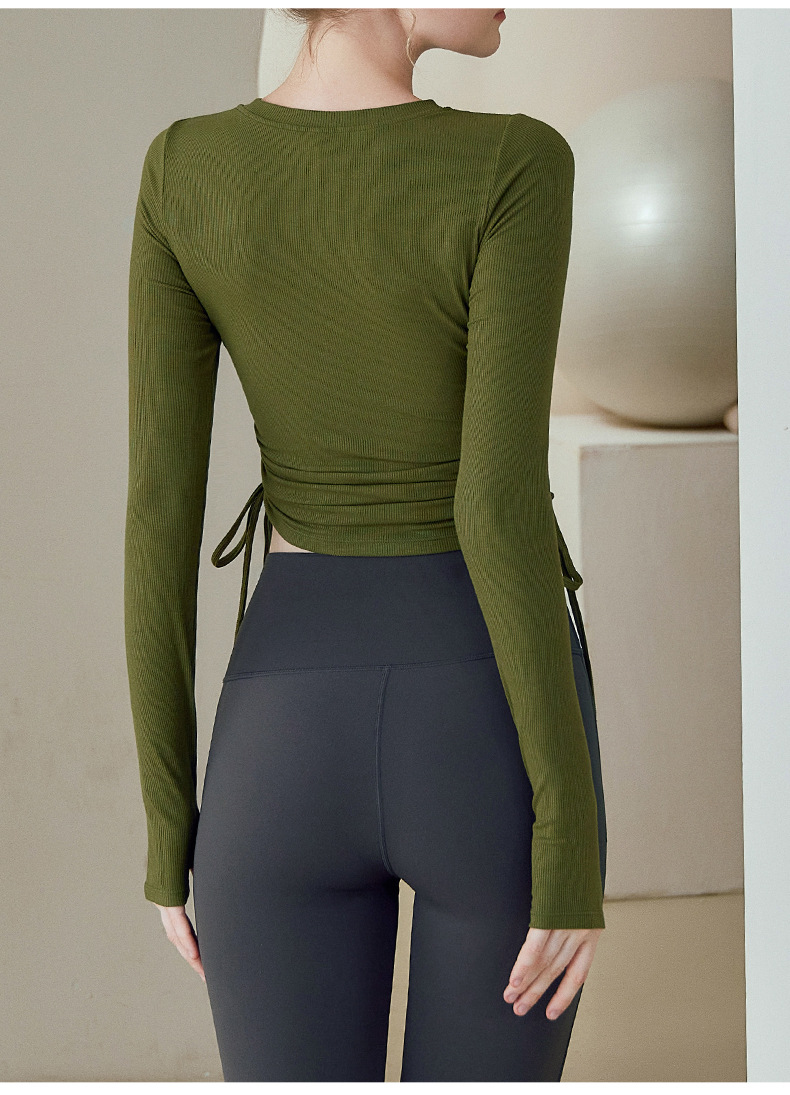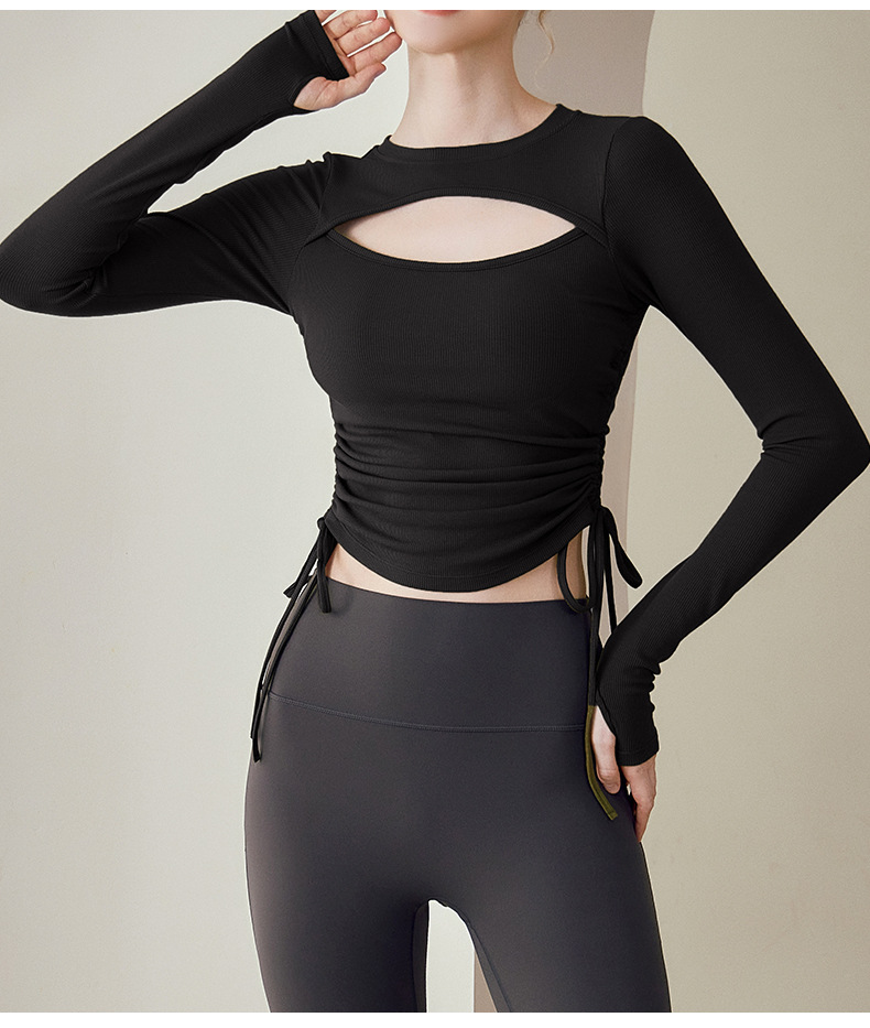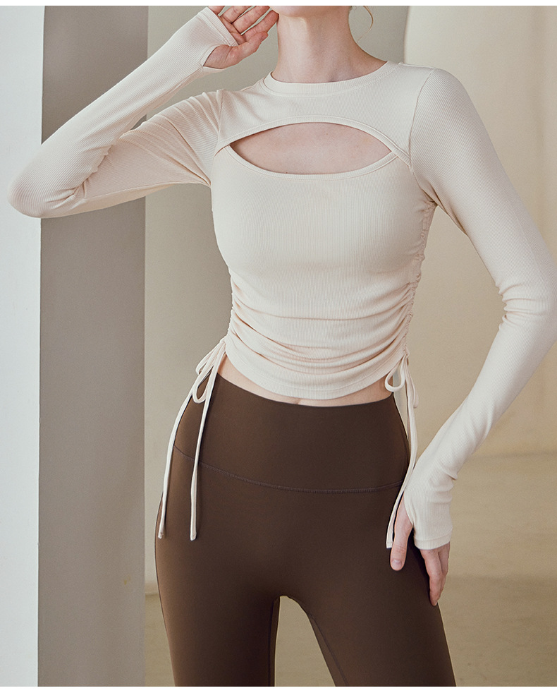 여성용 요가복 2026 봄 신상 디자인 가슴 패드가 있는 속이 비치는 드로스트링 타이트 핏 긴팔 티셔츠 탑