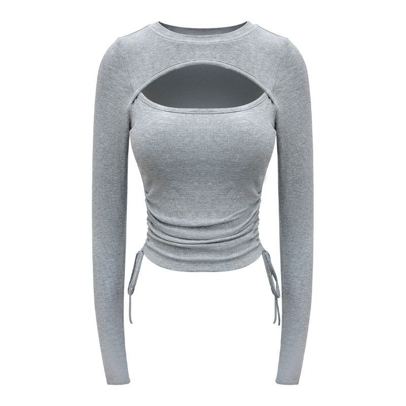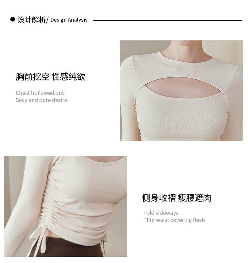 여성용 요가복 2026 봄 신상 디자인 가슴 패드가 있는 속이 비치는 드로스트링 타이트 핏 긴팔 티셔츠 탑스토어 가기