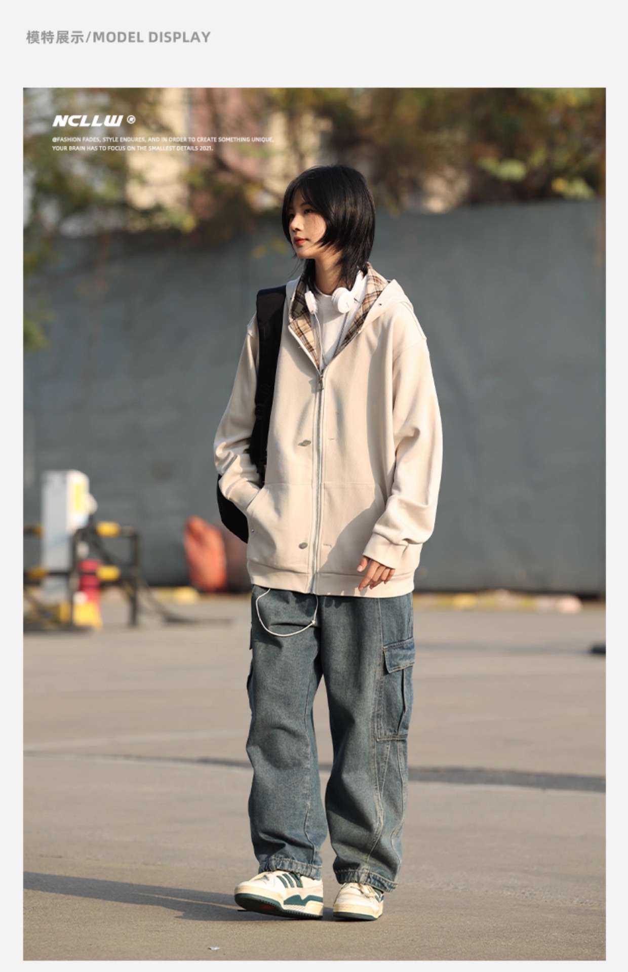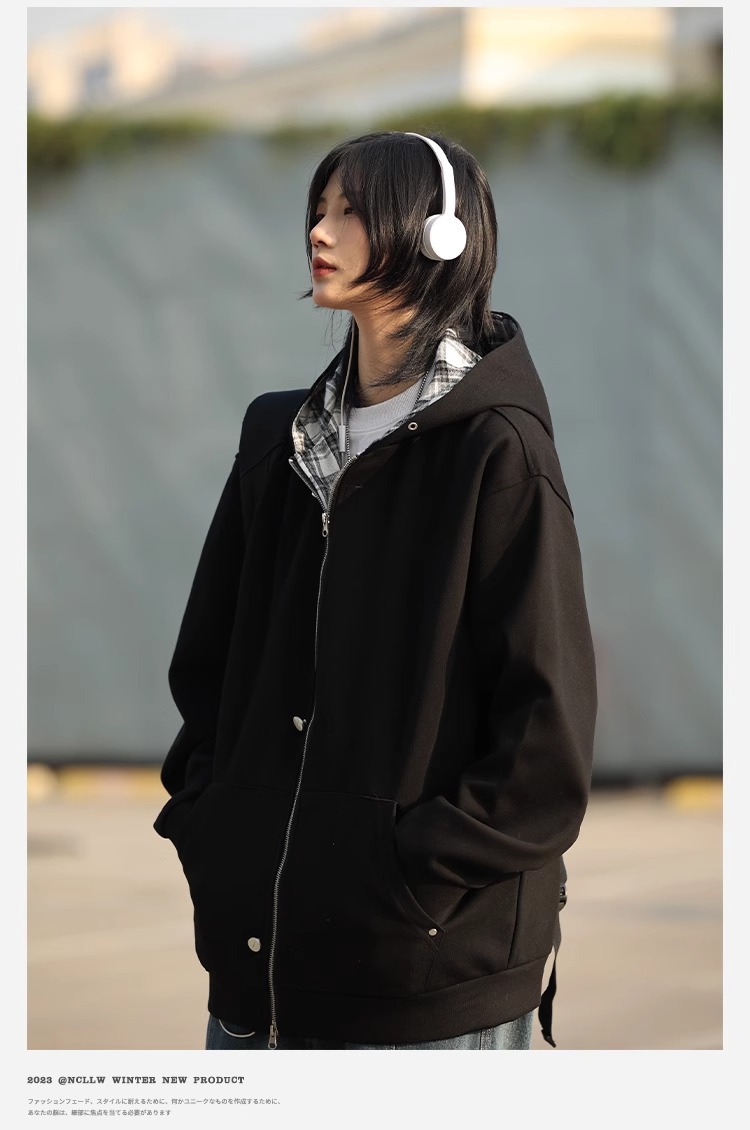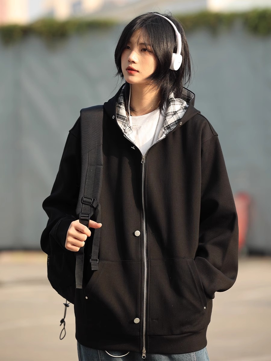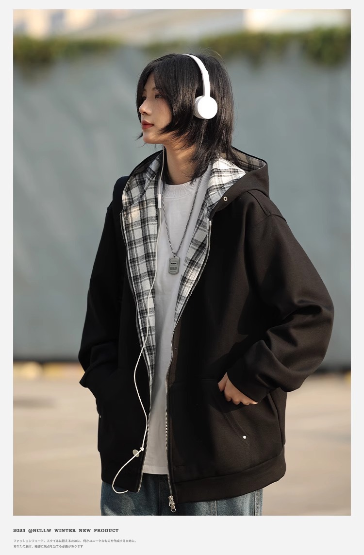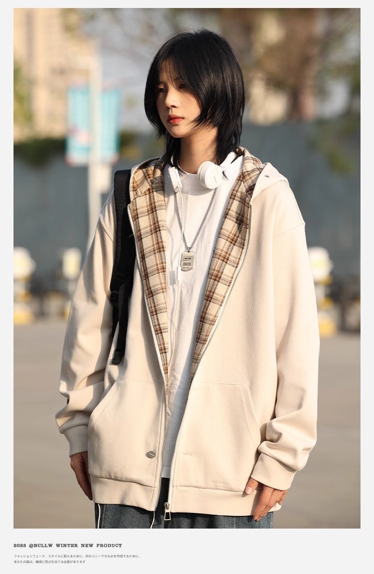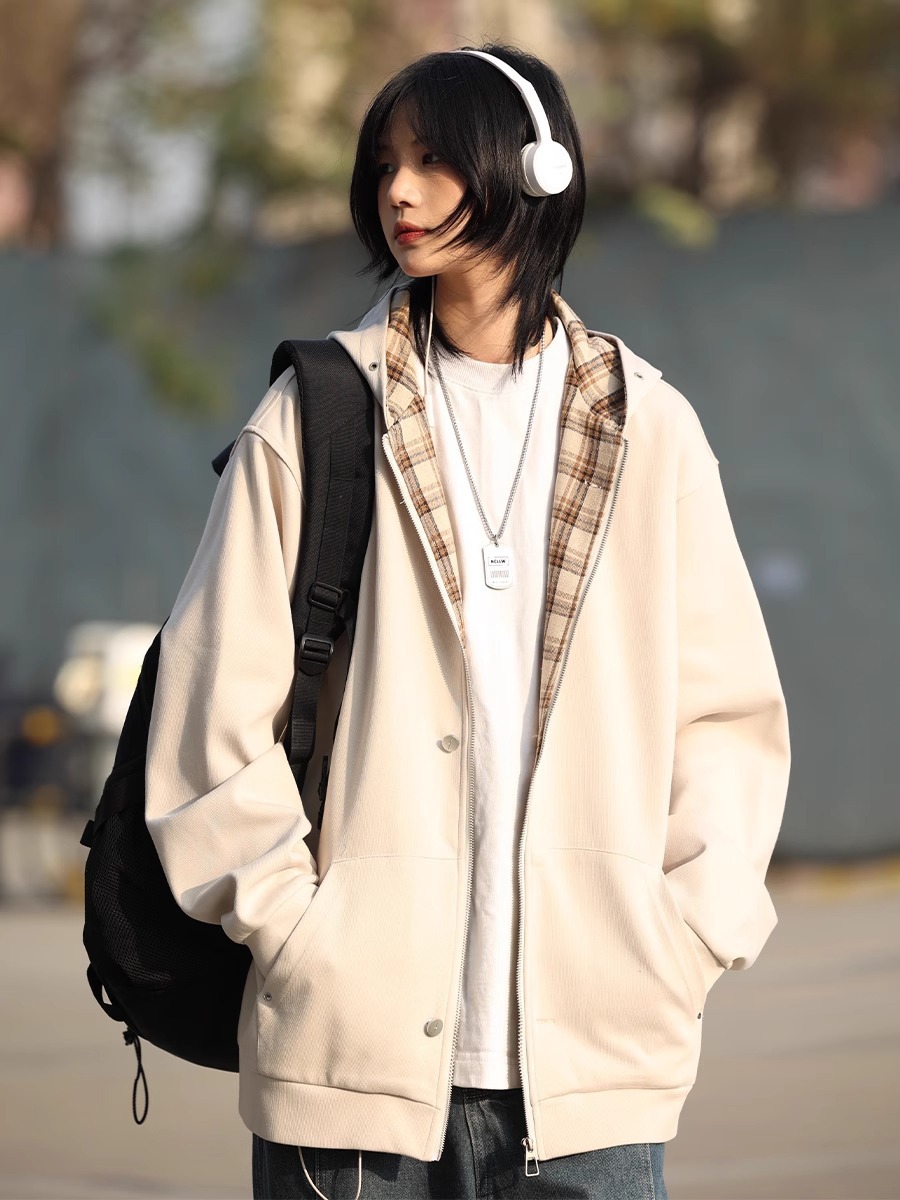 대비 컬러 격자 무늬 디자인 센스 후드 카디건 스웨터 남성 봄과 가을 2024 새로운 일본 캐주얼 느슨한 재킷 탑스토어 가기