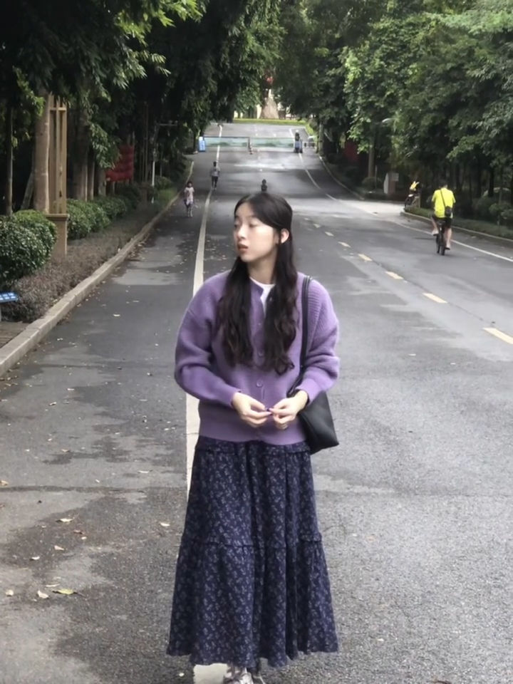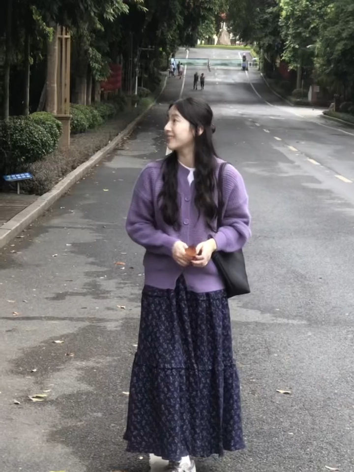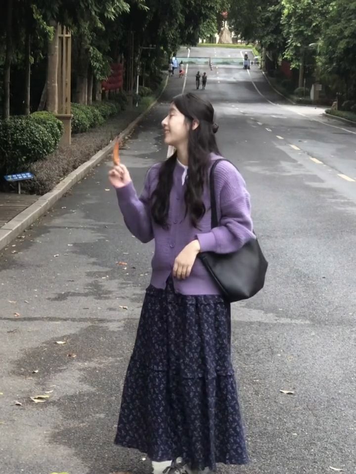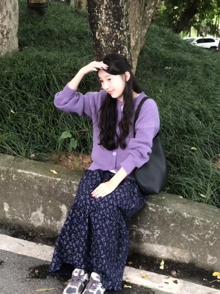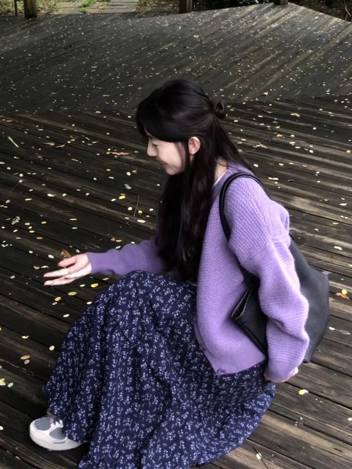 2024 년 초가을, 어린이를위한 부드러운 스타일의 보라색 니트 카디건 코트 높은 허리 꽃 반 길이 원피스스토어 가기