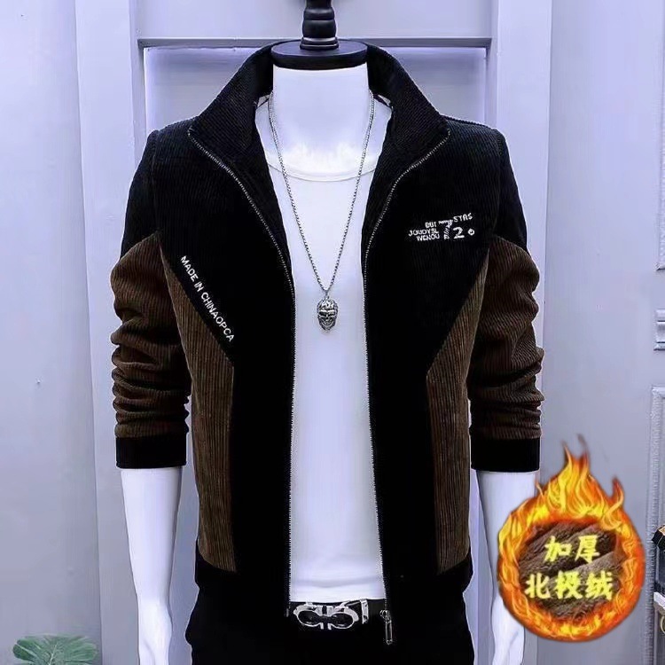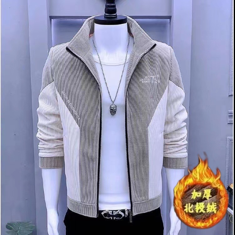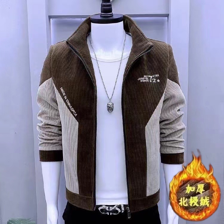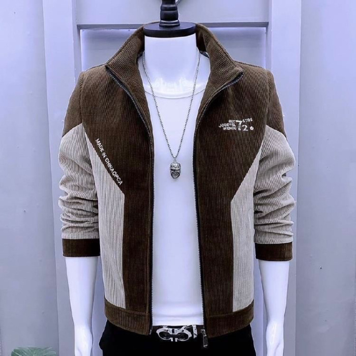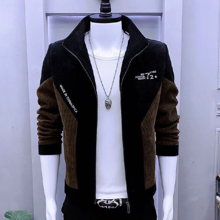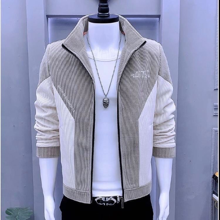 새로운 봄과 가을 재킷 한국 스타일 슬림 핏 수직 칼라 바느질 두꺼운 코듀로이 재킷 남자의 유행 캐주얼 남성