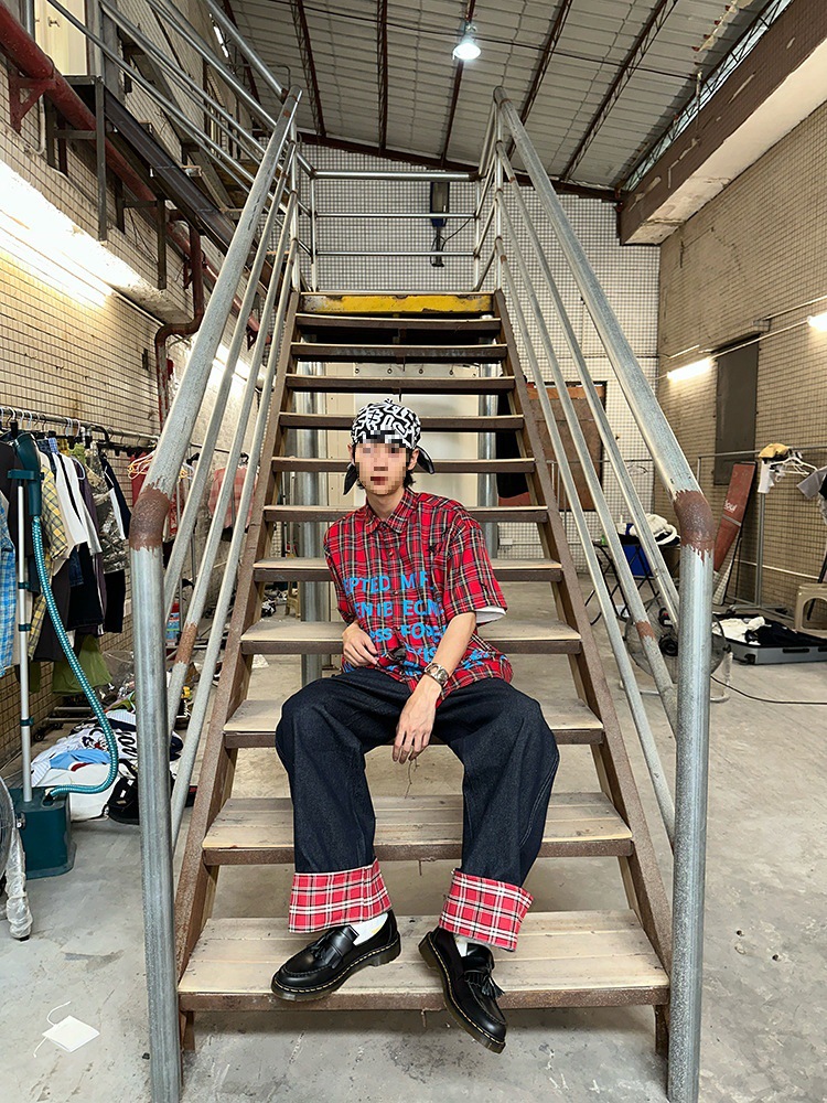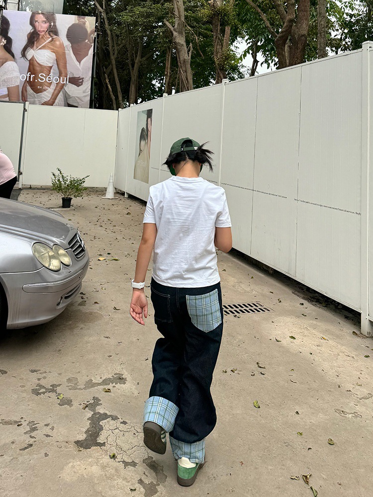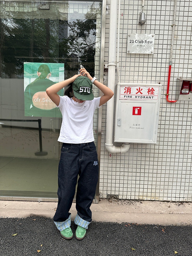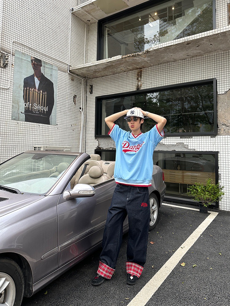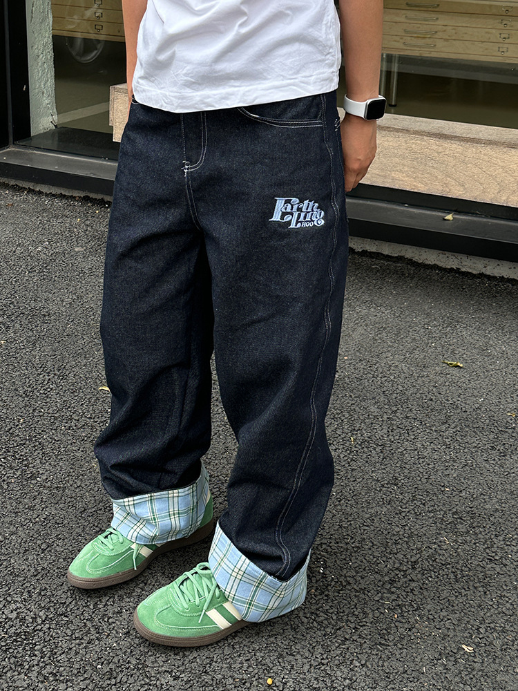 미국식 격자 무늬 바느질 컬 청바지 남자 가을 새로운 넓은 다리 스트레이트 느슨한 고급 커플 긴 바지