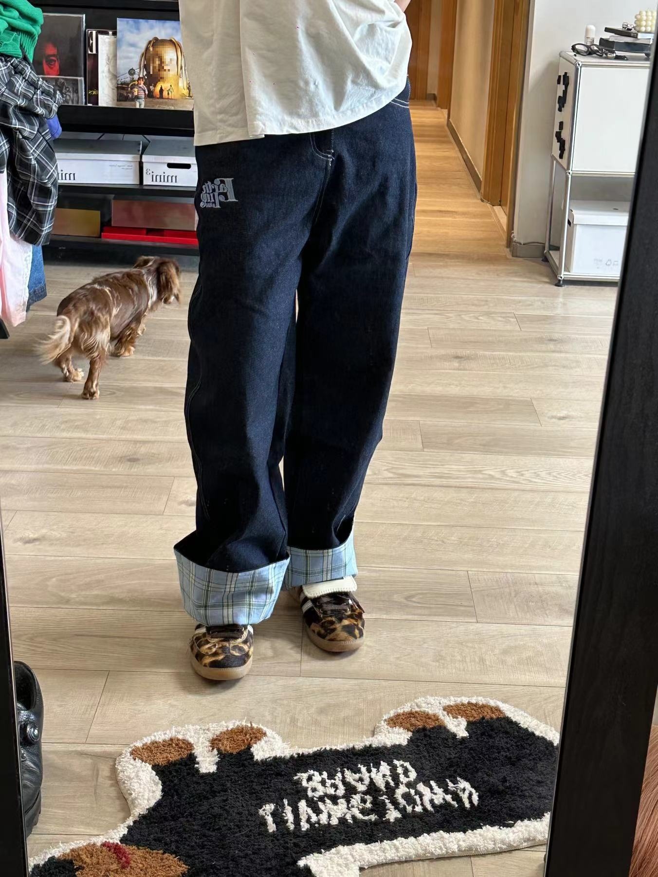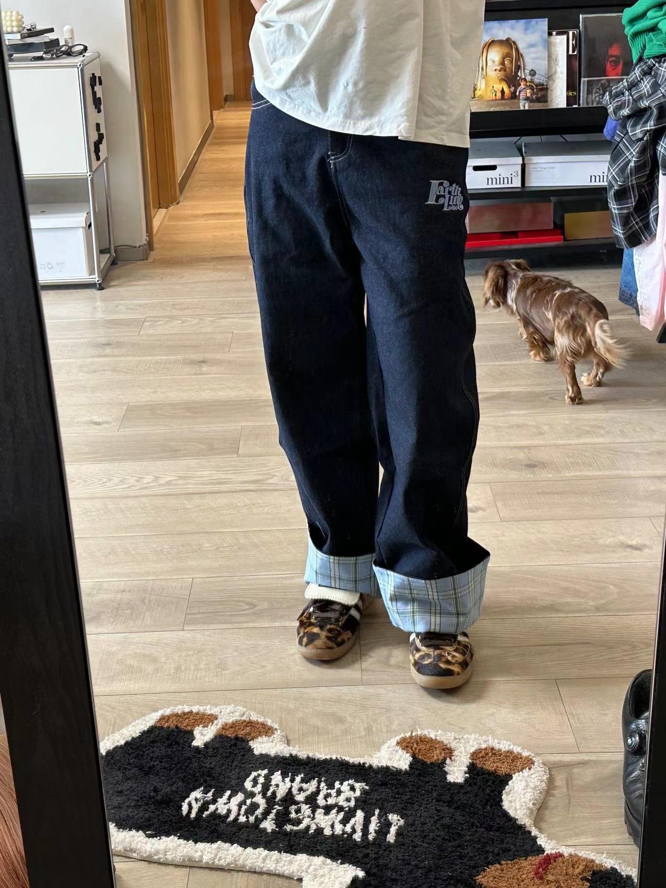 미국식 격자 무늬 바느질 컬 청바지 남자 가을 새로운 넓은 다리 스트레이트 느슨한 고급 커플 긴 바지스토어 가기