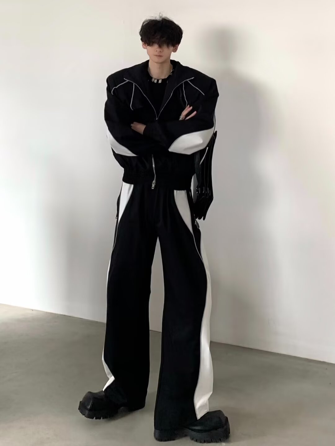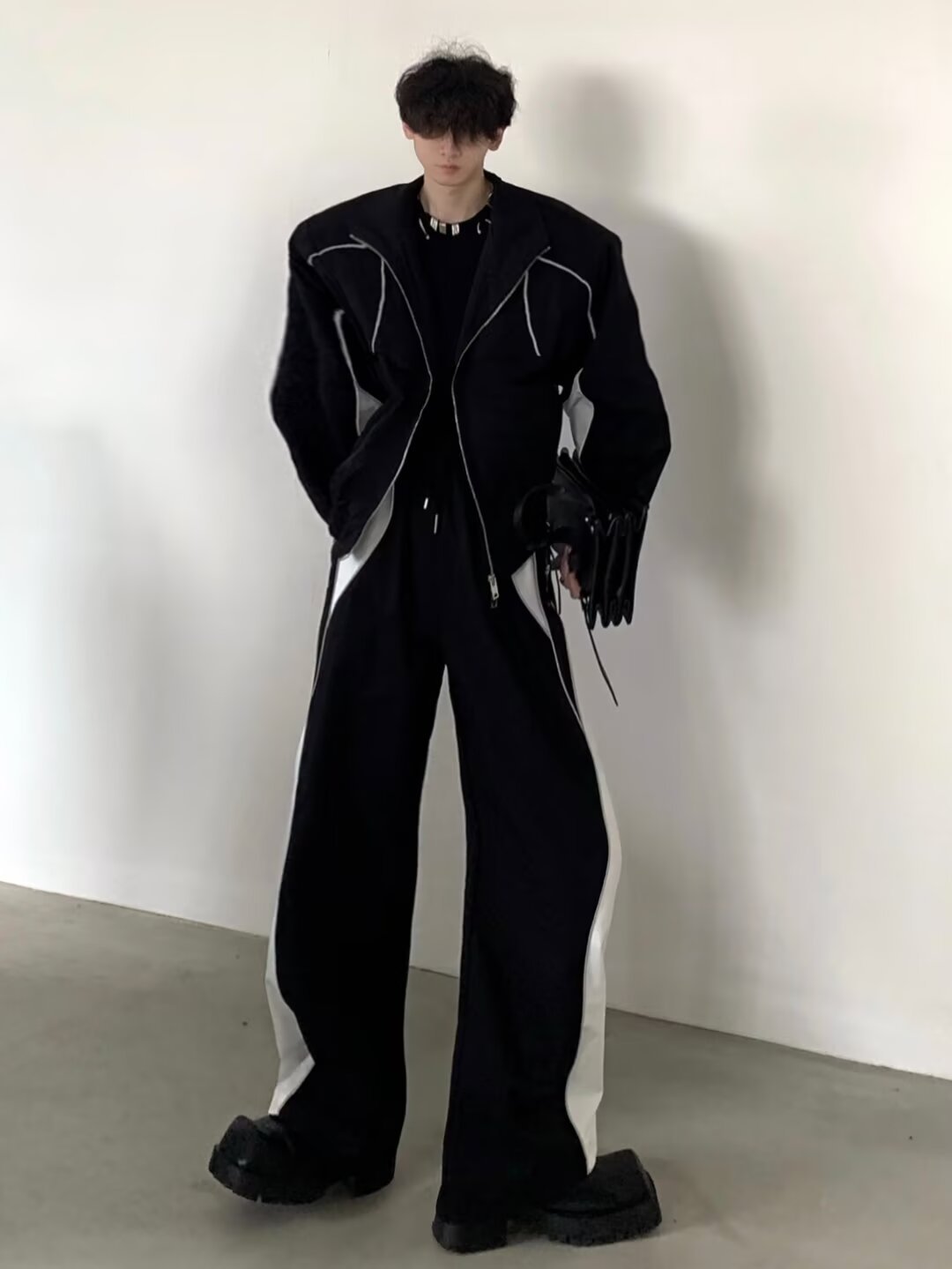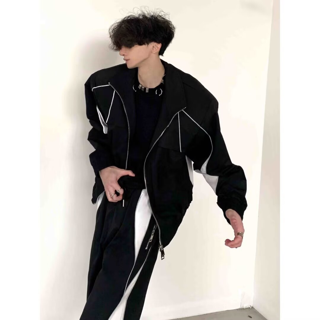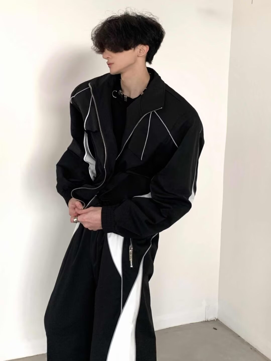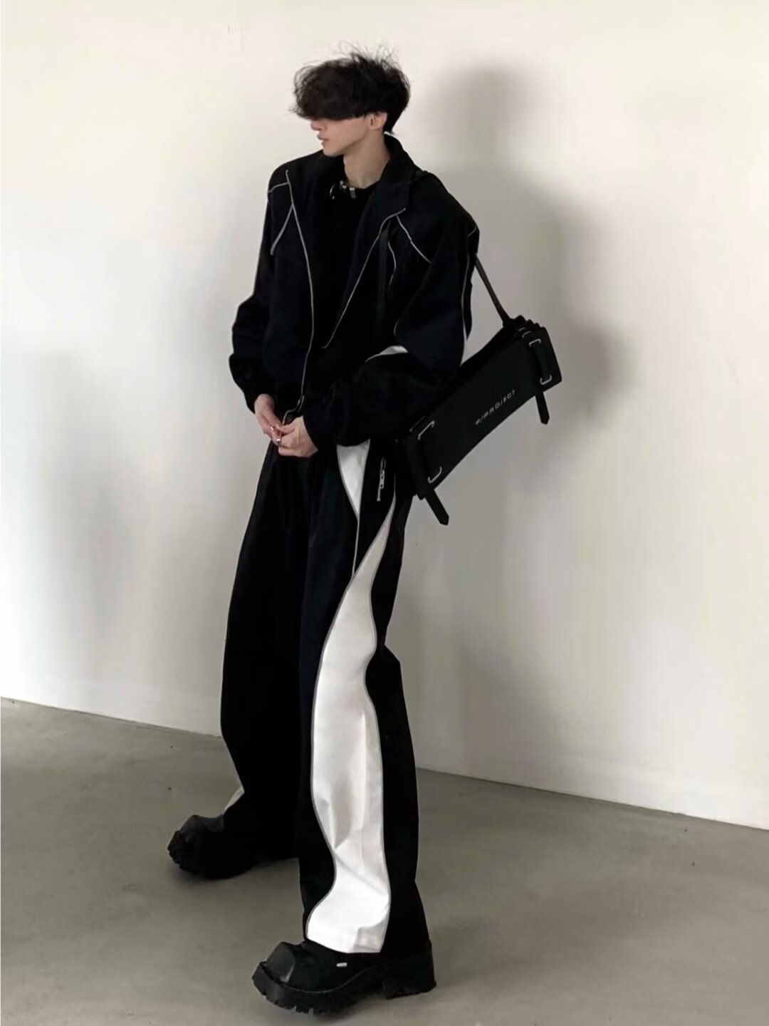 Pi Shuai 튀김 거리 레저 스포츠 세트 남성 가을 봄 대비 스티칭 반사 칼라 재킷 코트 세트 스트레이트