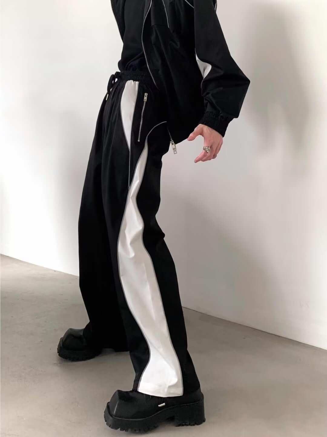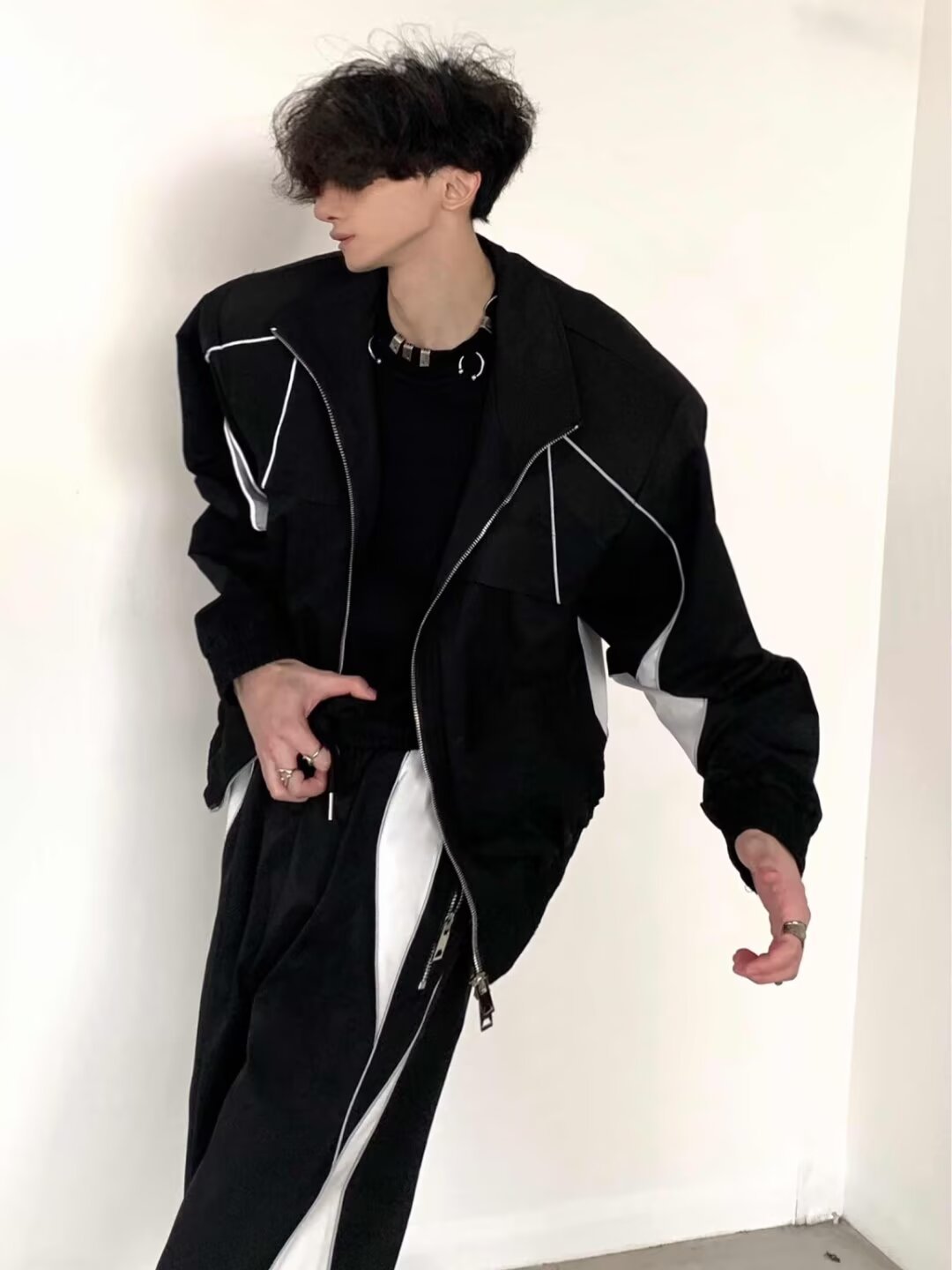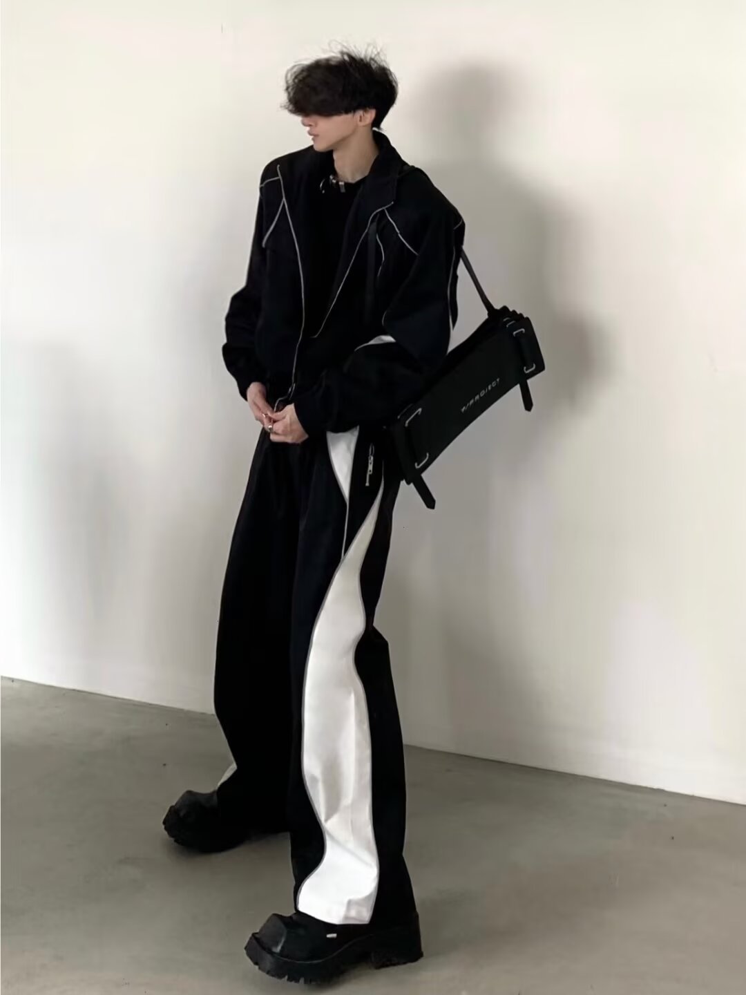 Pi Shuai 튀김 거리 레저 스포츠 세트 남성 가을 봄 대비 스티칭 반사 칼라 재킷 코트 세트 스트레이트스토어 가기