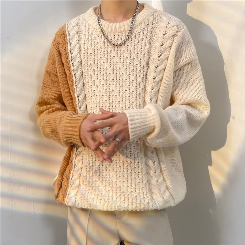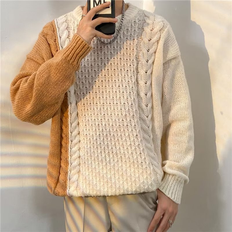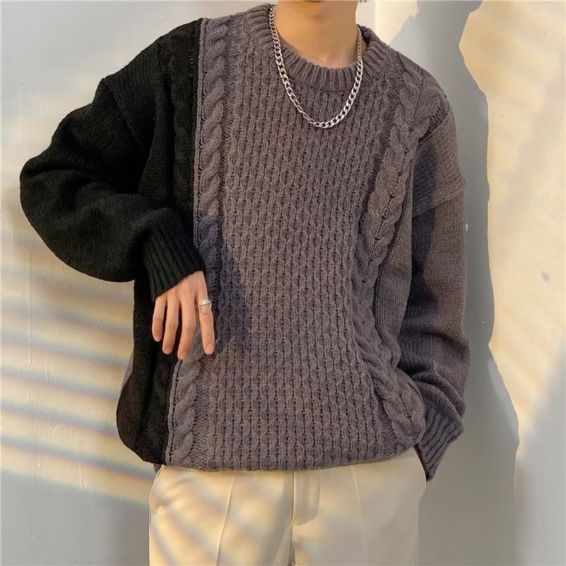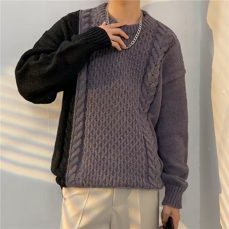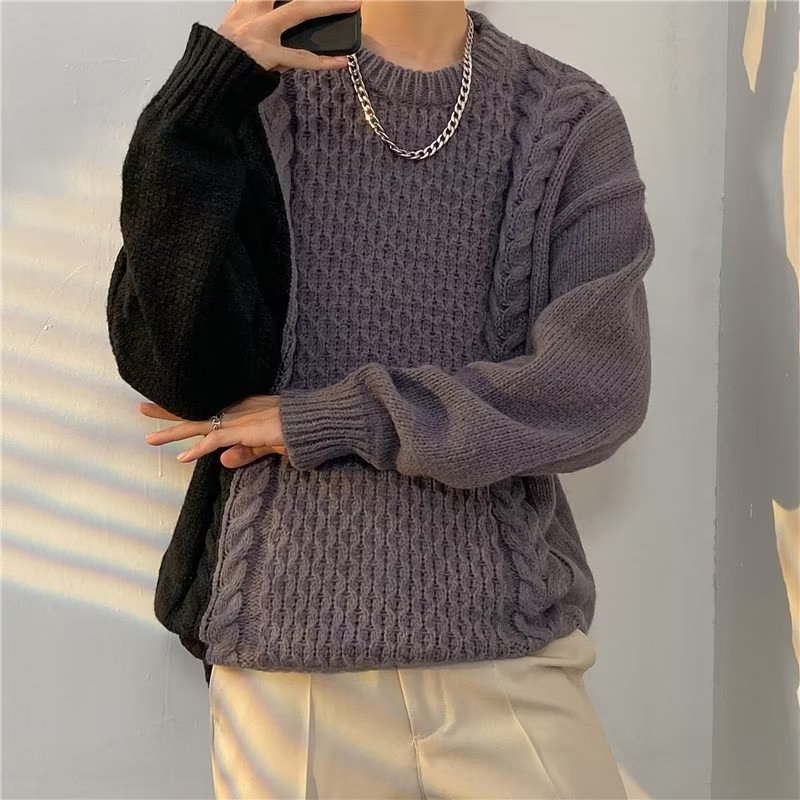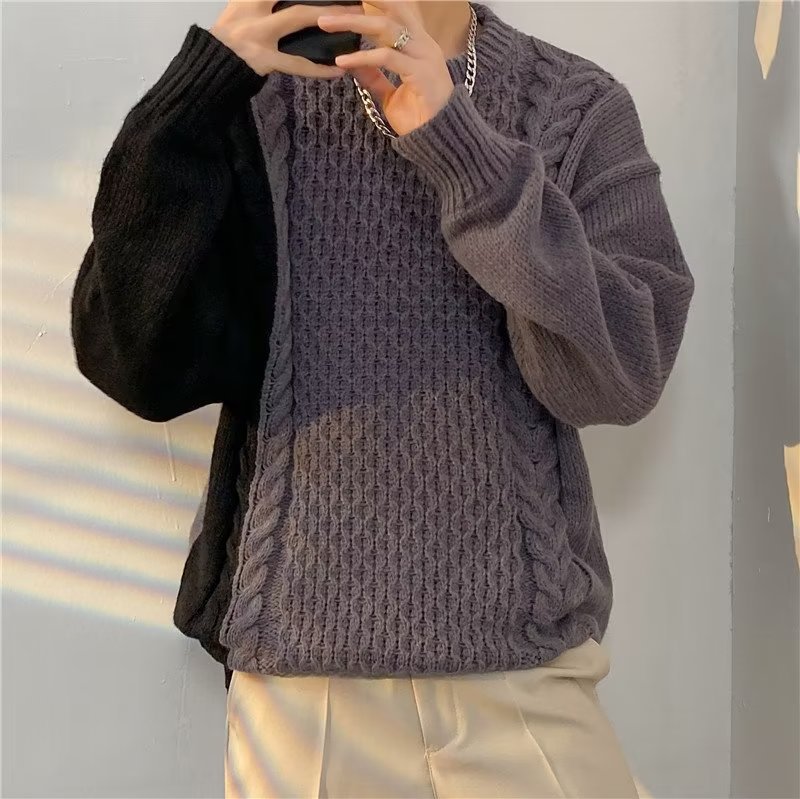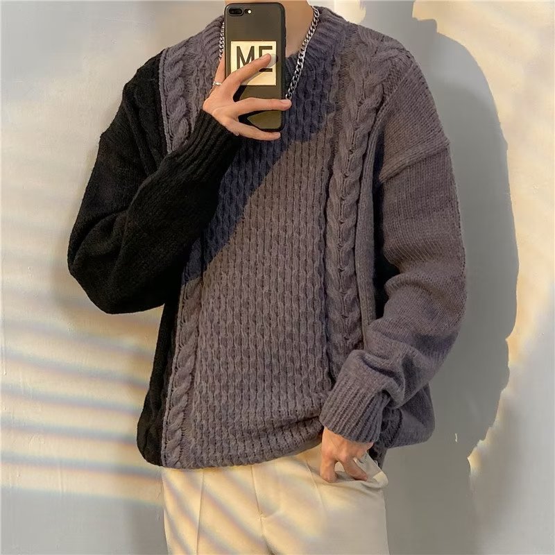 가벼운 성숙한 스타일 레트로 컬러 블록 라운드 넥 스웨터 남자 Ins 홍콩 스타일 게으른 탑 느슨한 커플 캐주얼 니트 셔츠
