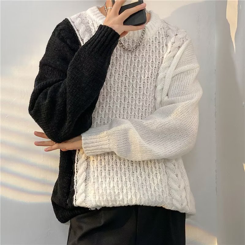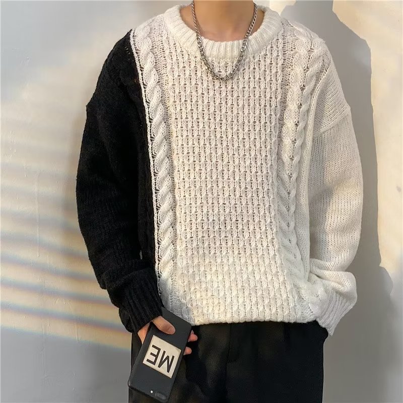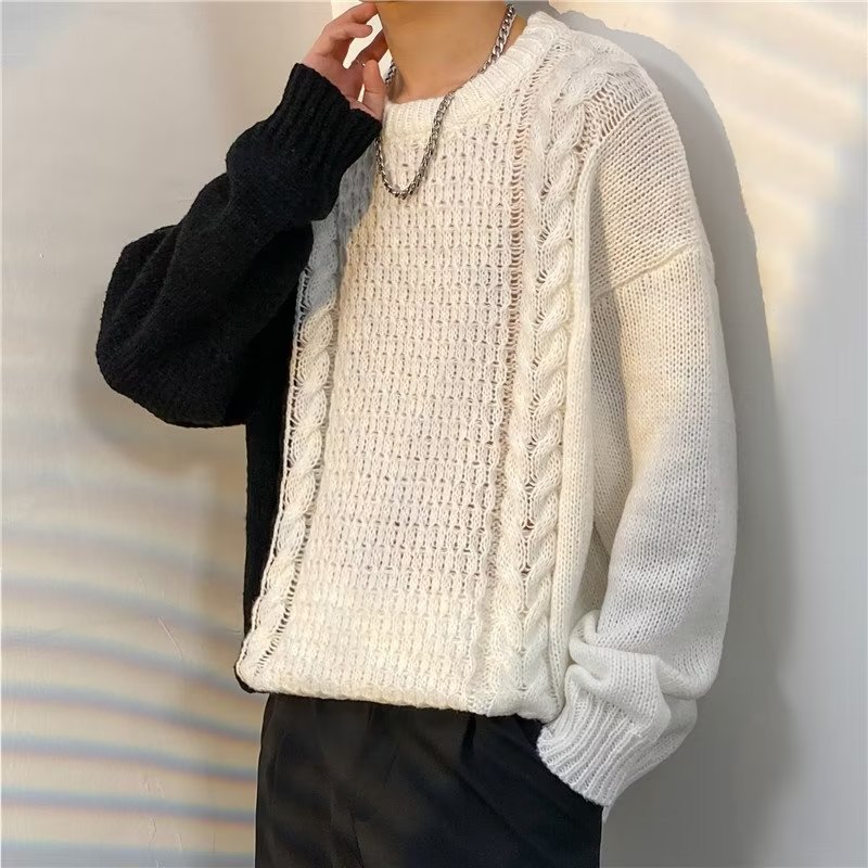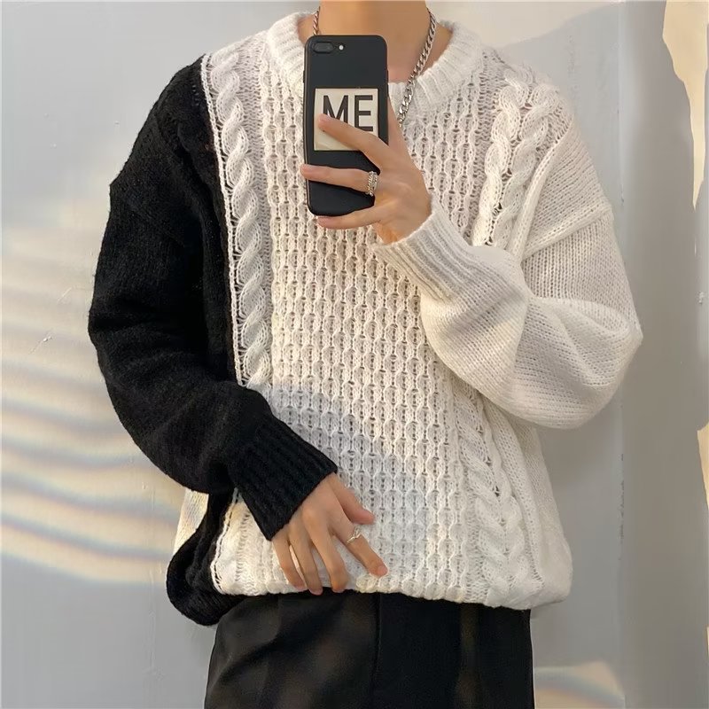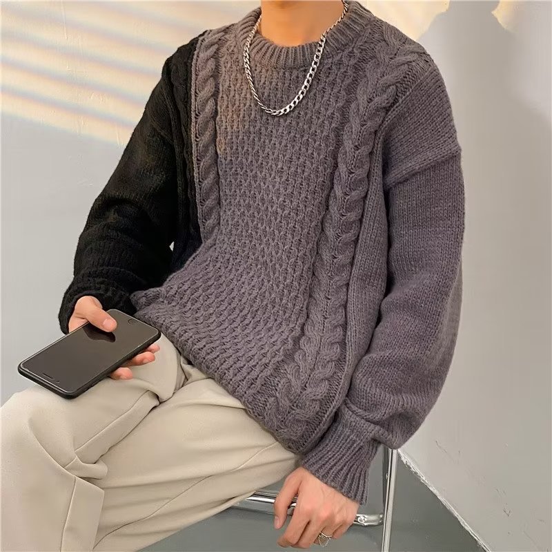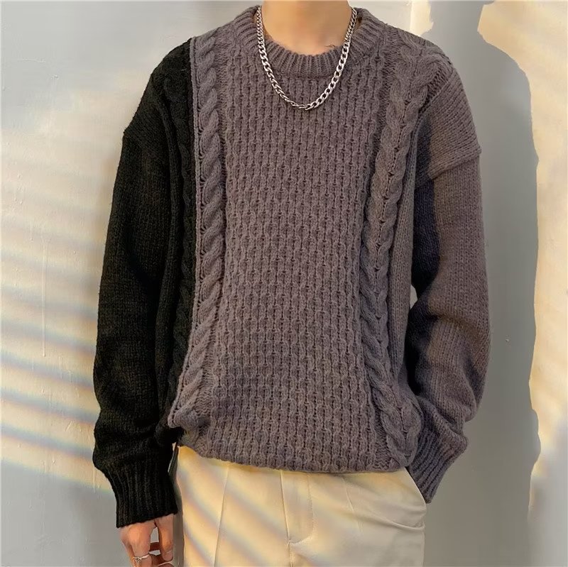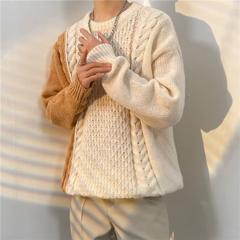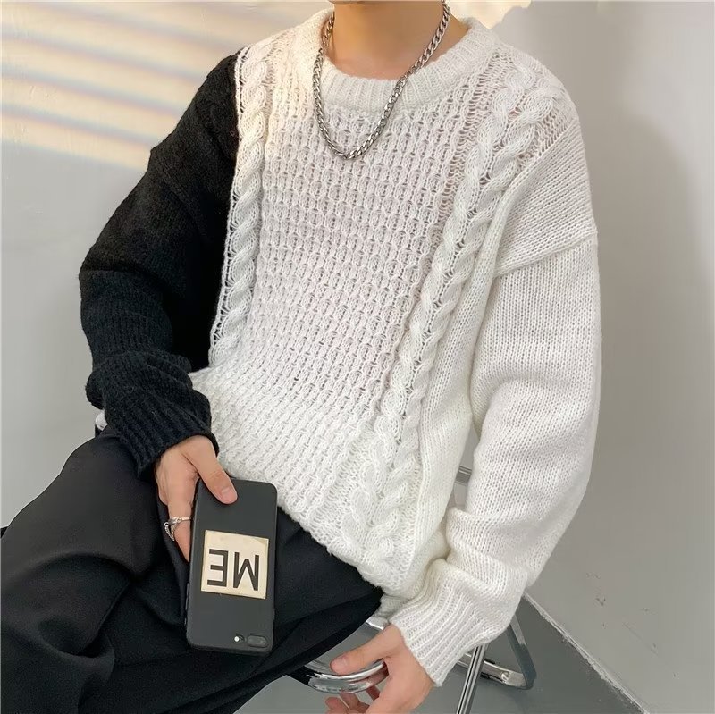 가벼운 성숙한 스타일 레트로 컬러 블록 라운드 넥 스웨터 남자 Ins 홍콩 스타일 게으른 탑 느슨한 커플 캐주얼 니트 셔츠