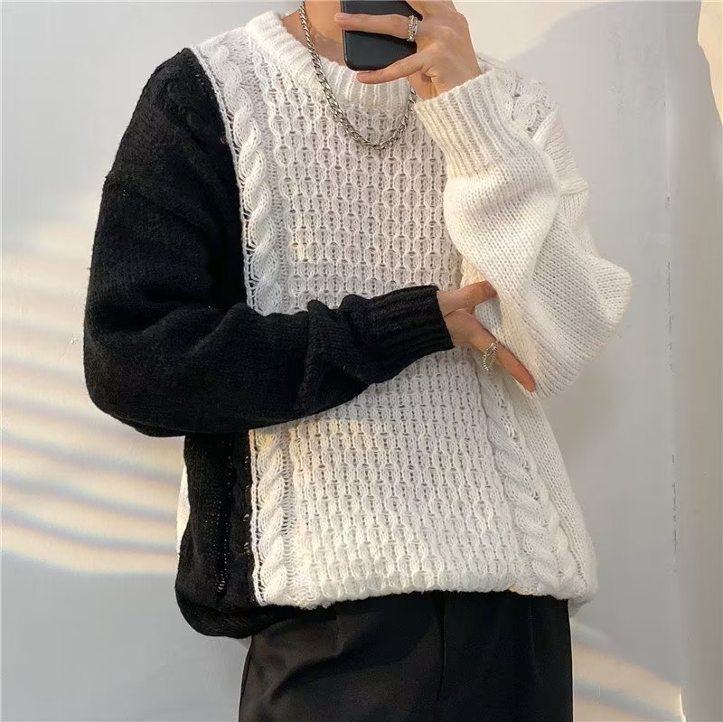 가벼운 성숙한 스타일 레트로 컬러 블록 라운드 넥 스웨터 남자 Ins 홍콩 스타일 게으른 탑 느슨한 커플 캐주얼 니트 셔츠스토어 가기
