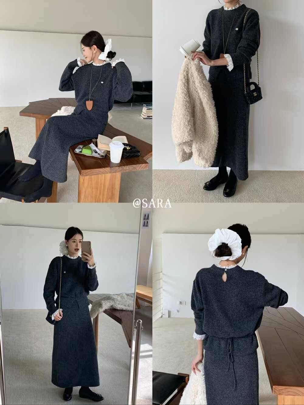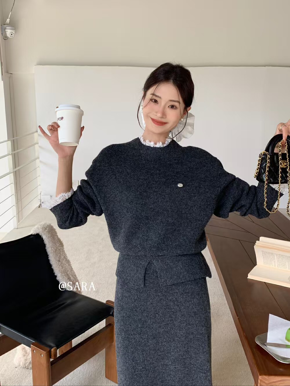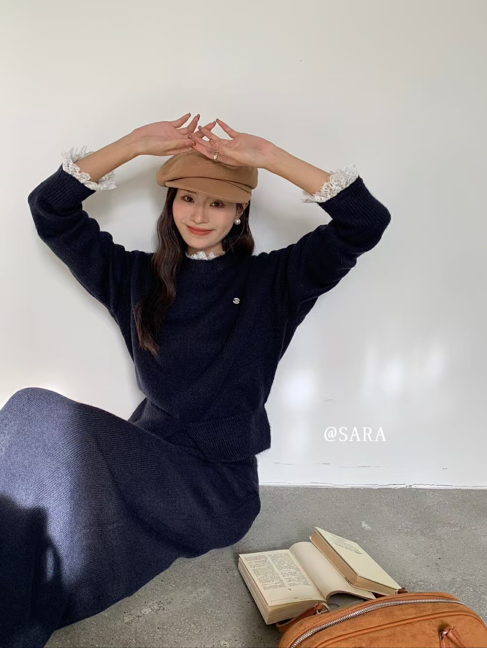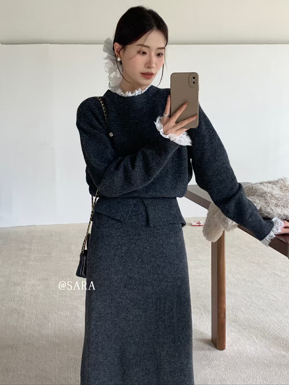 카이유상 LSARAJ 겨울 프렌치 스타일 달콤한 레이스 스티치 라운드넥 스웨터와 신축성 있는 허리 스커트 세트
