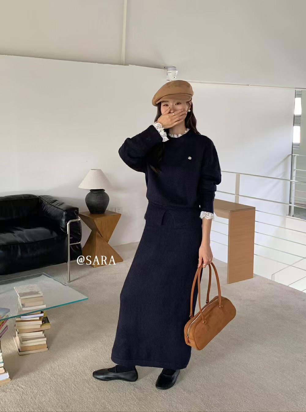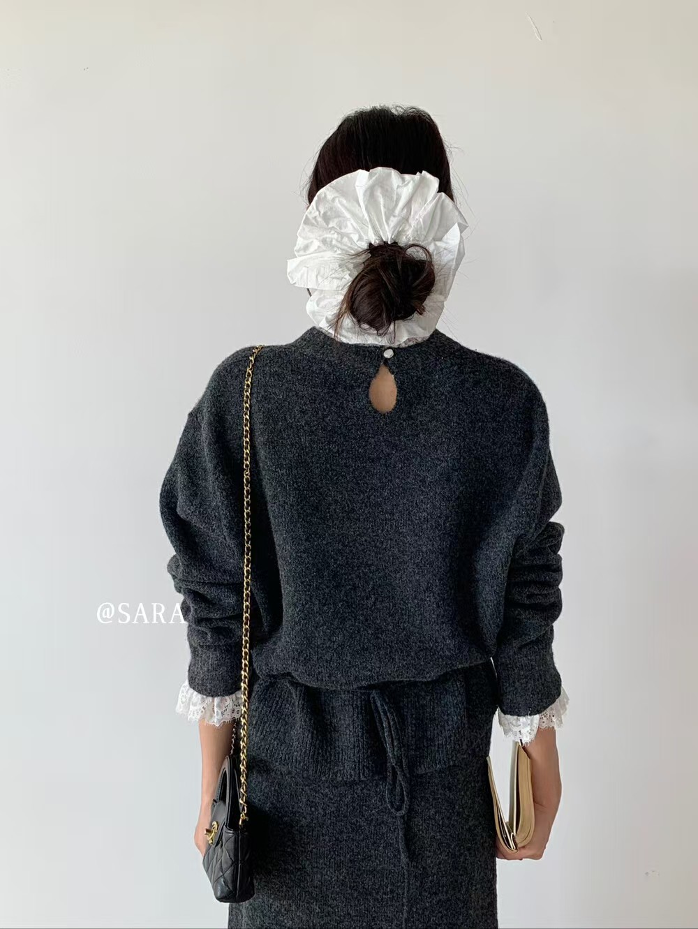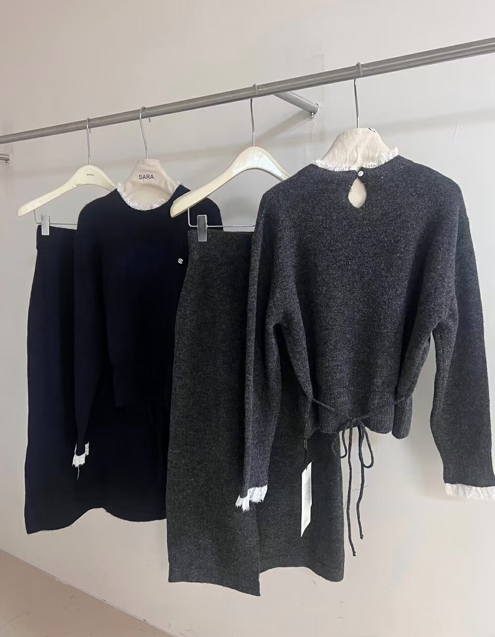카이유상 LSARAJ 겨울 프렌치 스타일 달콤한 레이스 스티치 라운드넥 스웨터와 신축성 있는 허리 스커트 세트