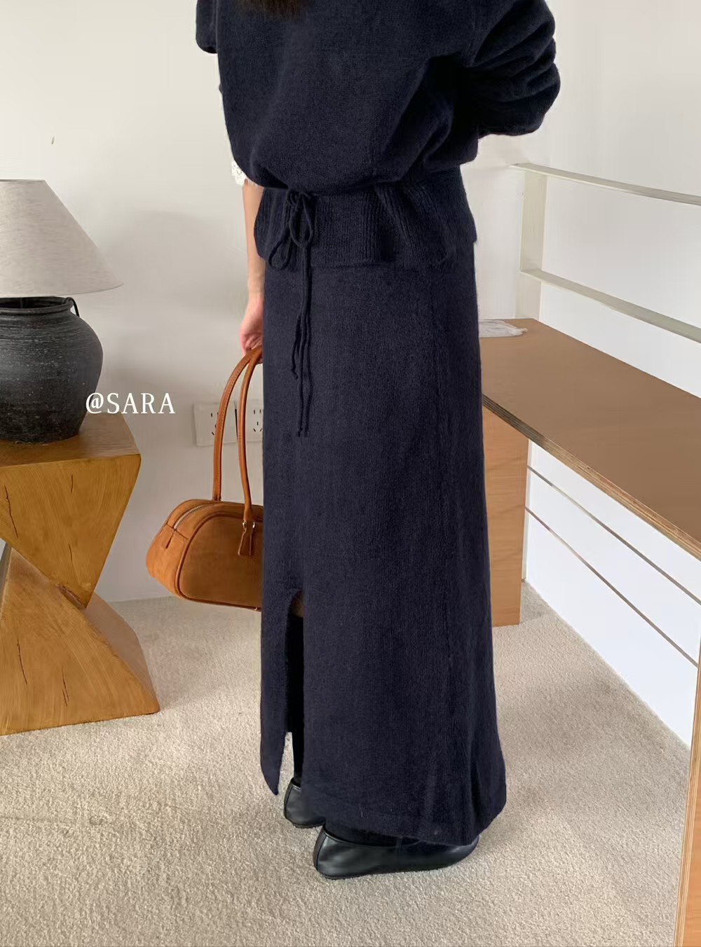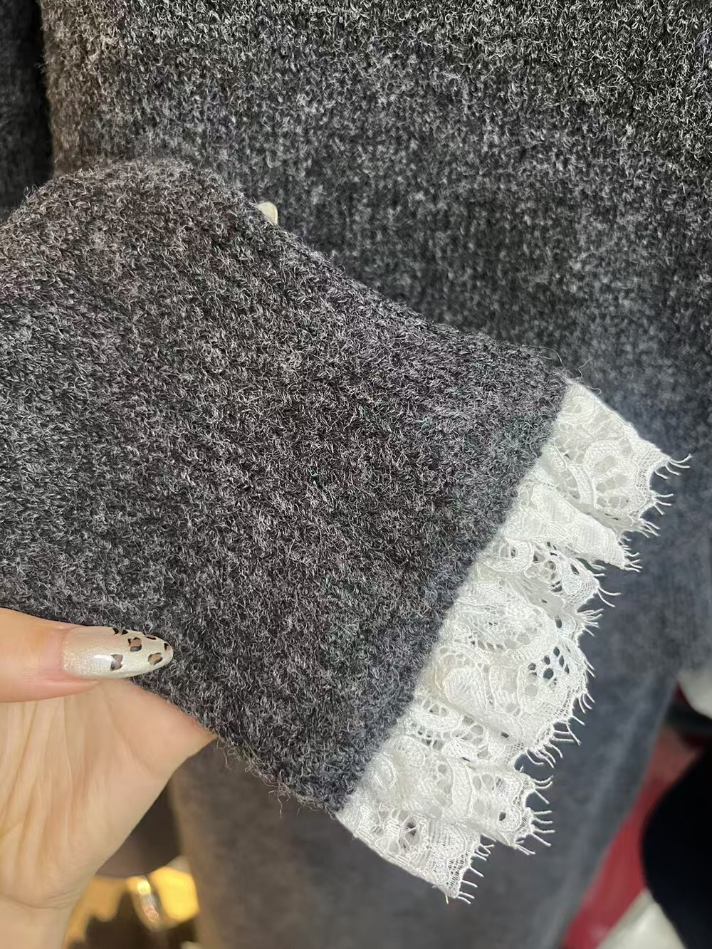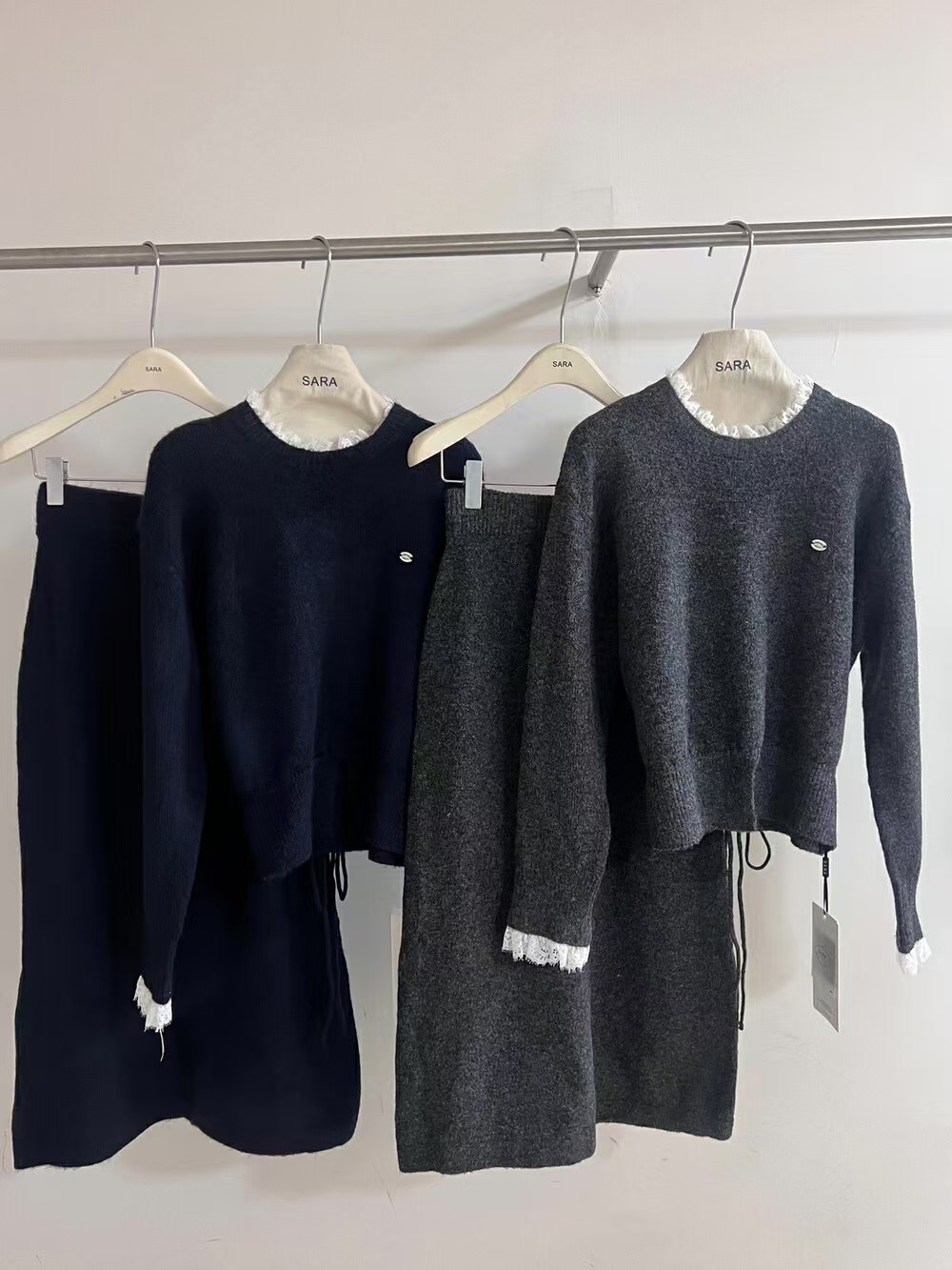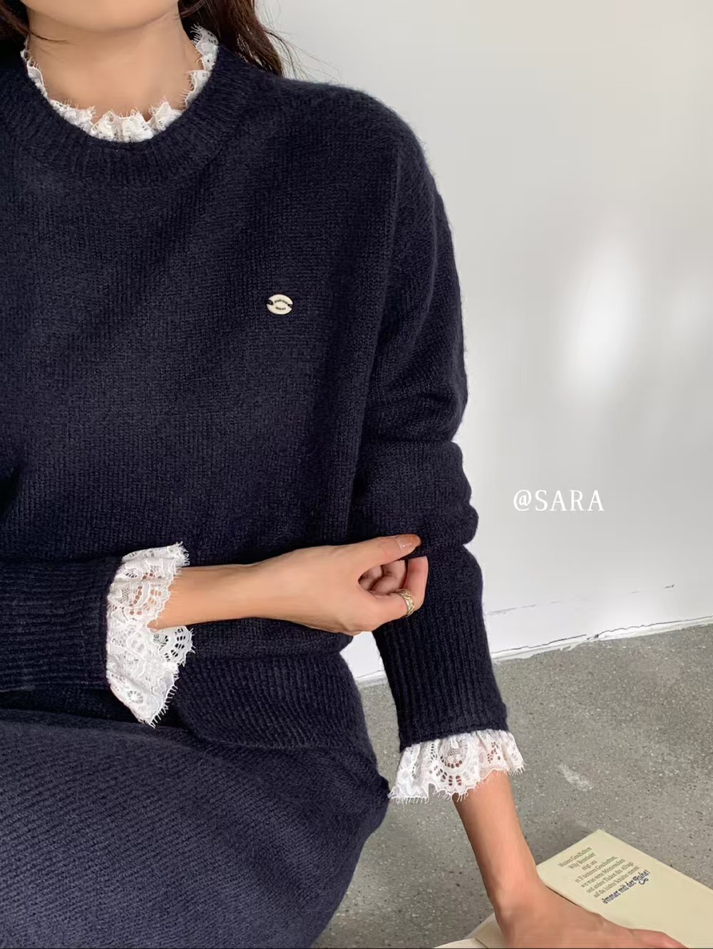 카이유상 LSARAJ 겨울 프렌치 스타일 달콤한 레이스 스티치 라운드넥 스웨터와 신축성 있는 허리 스커트 세트