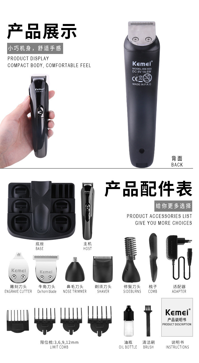 국경 간 Kemei 헤어 클리퍼 다기능 면도 코 헤어 트리밍 6 대 1 오일 헤드 전기 클리퍼 세트