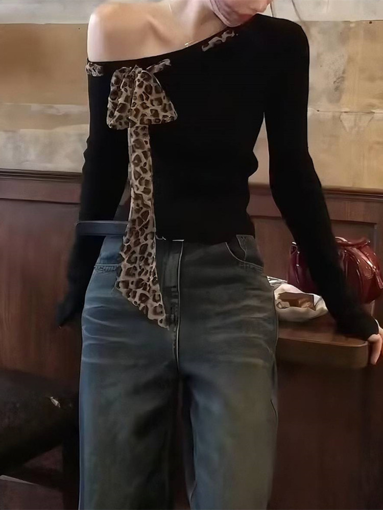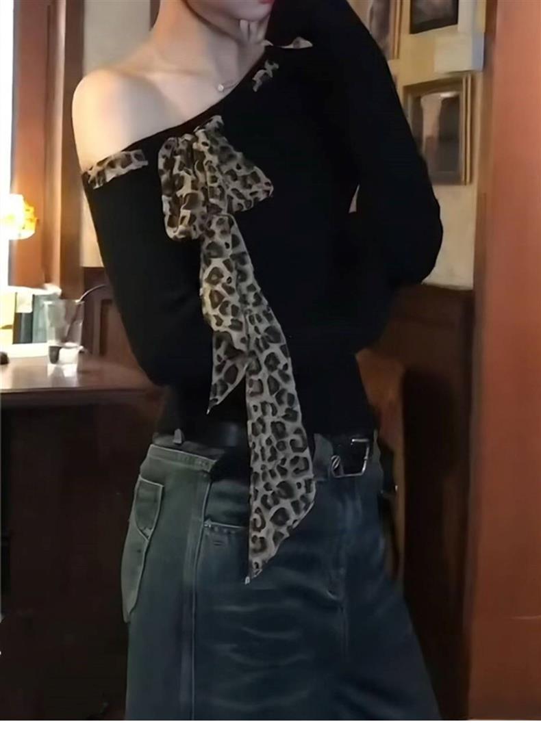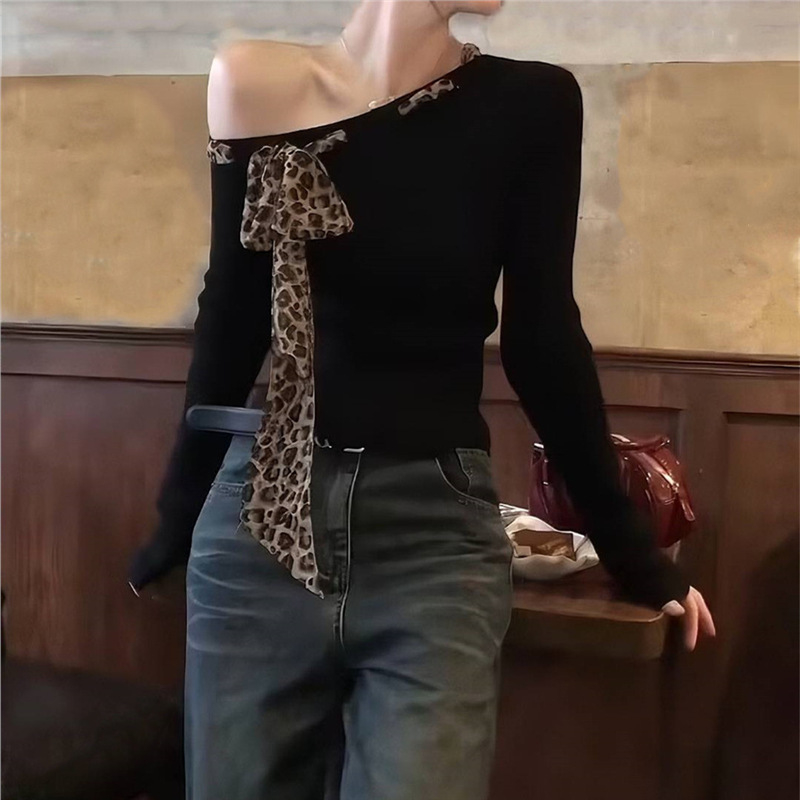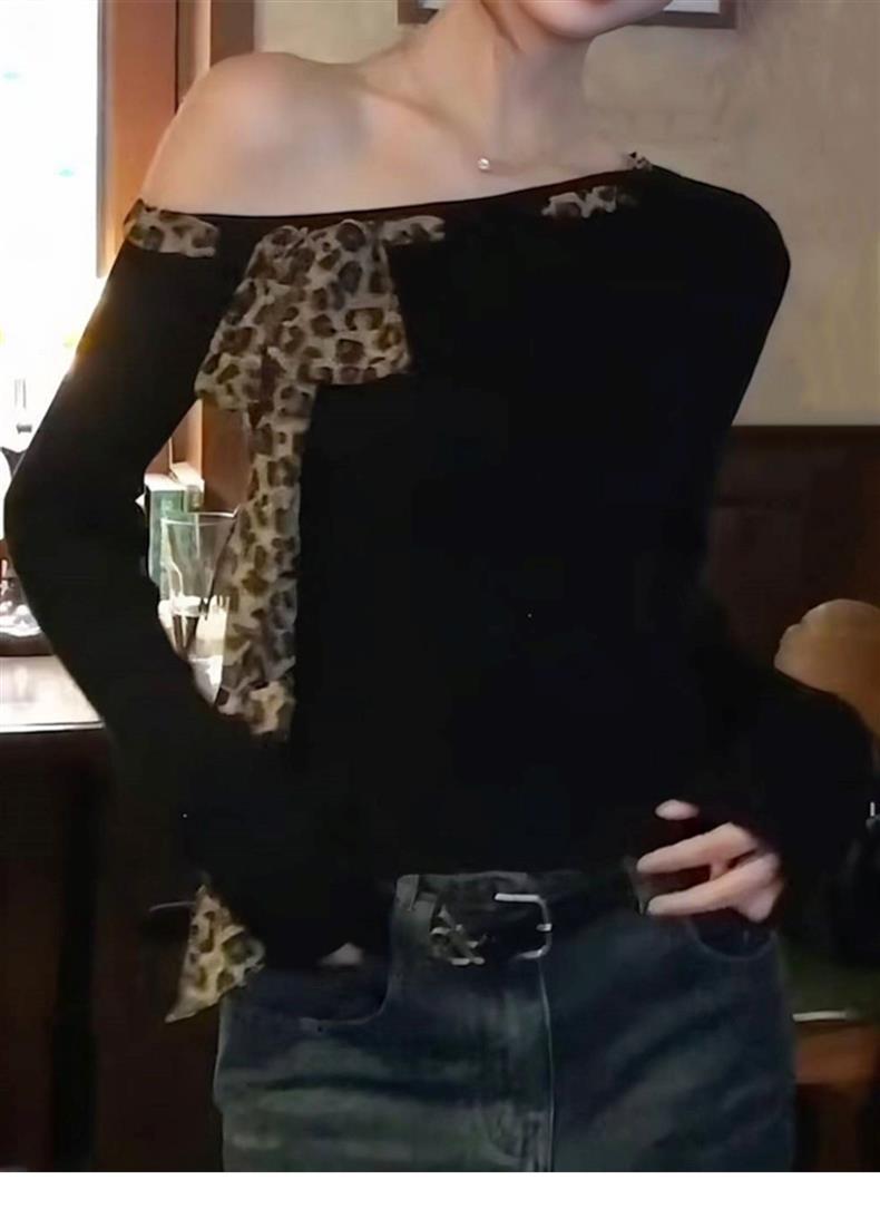 미국식 레트로 레오파드 보우 어깨 긴팔 티셔츠 여성 초가을 스파이스 걸의 슬림 핏 슬리밍 내베이스 탑