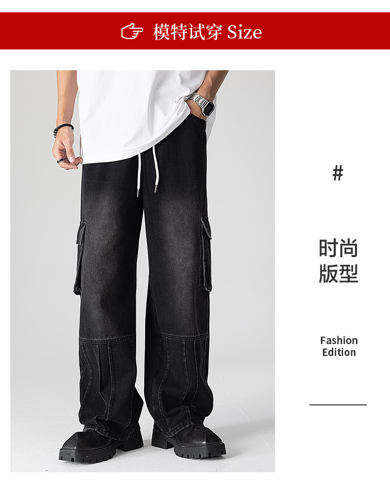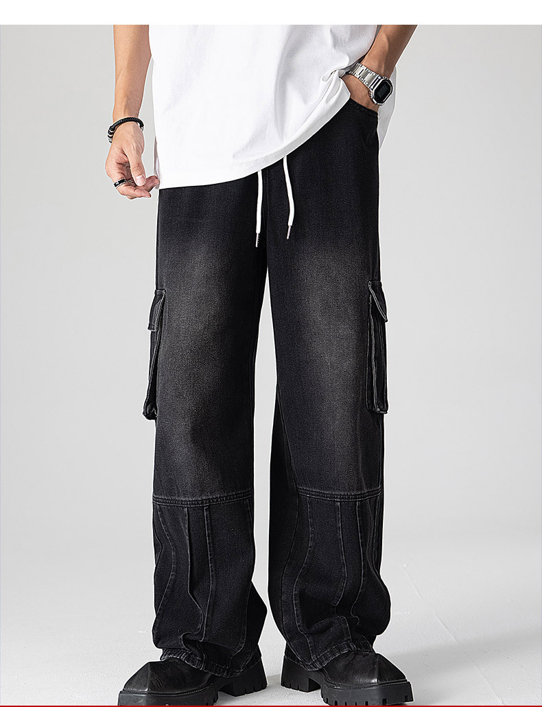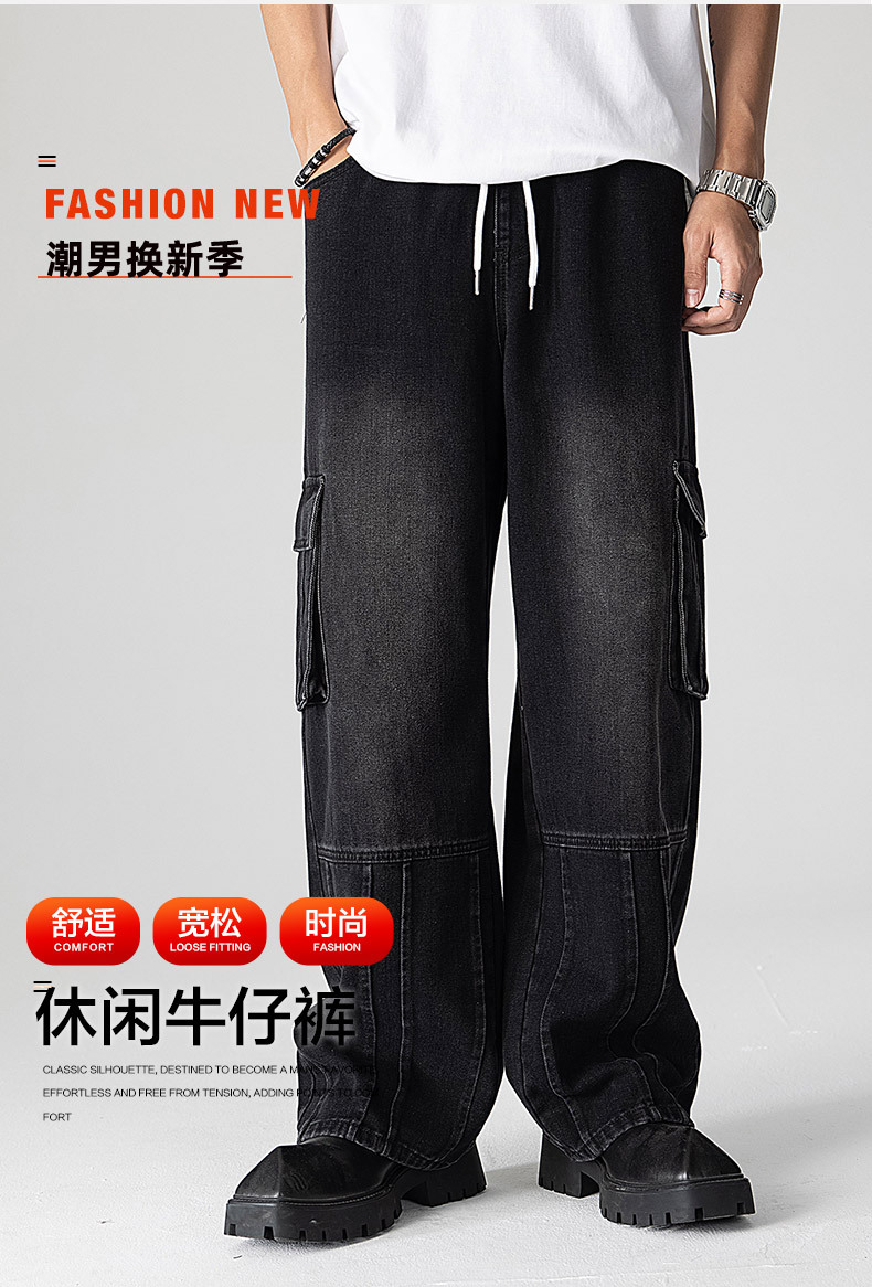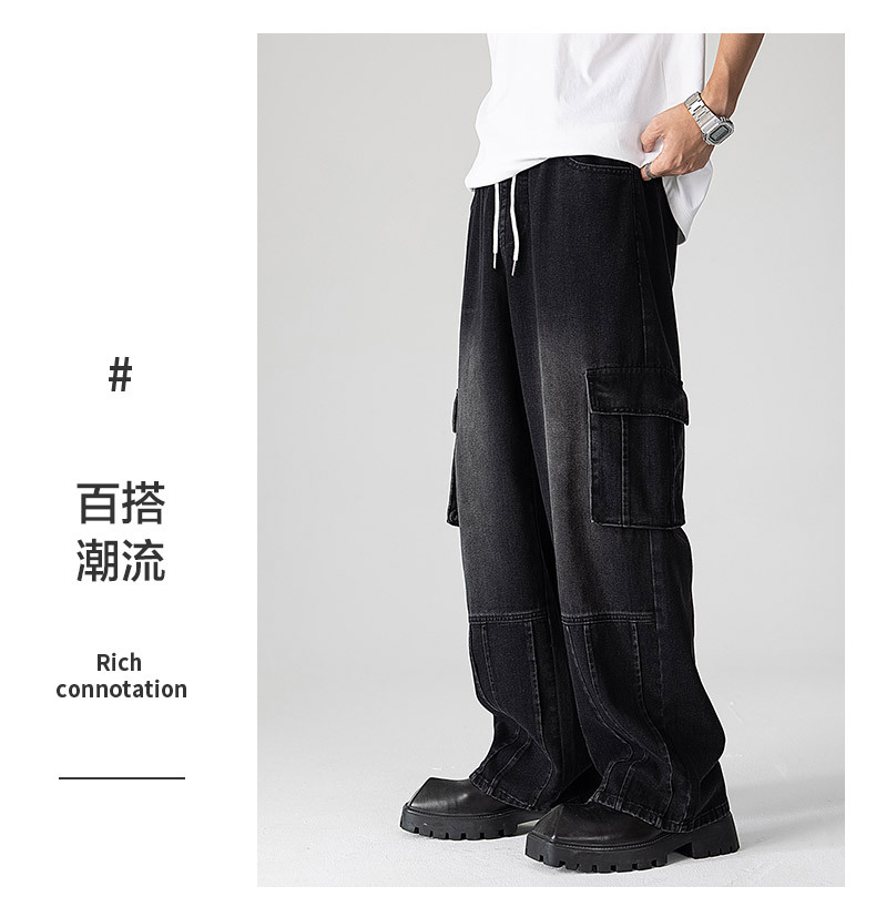 2024 새로운 미국 스타일 하이 스트리트 와이드 레그 캐주얼 긴 바지 빈티지 대형 포켓 툴링 청바지 남성 가을스토어 가기