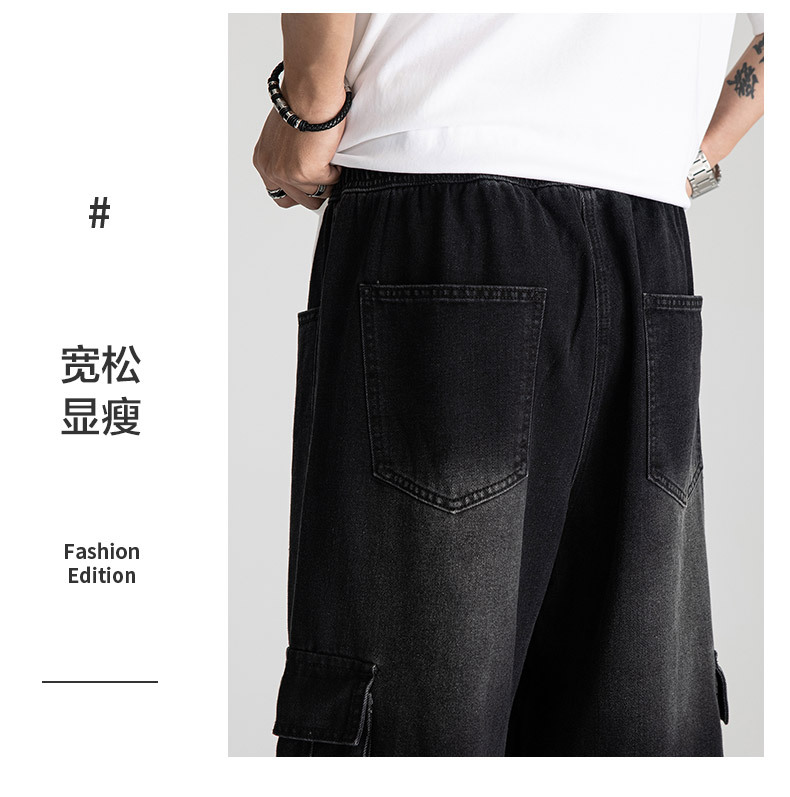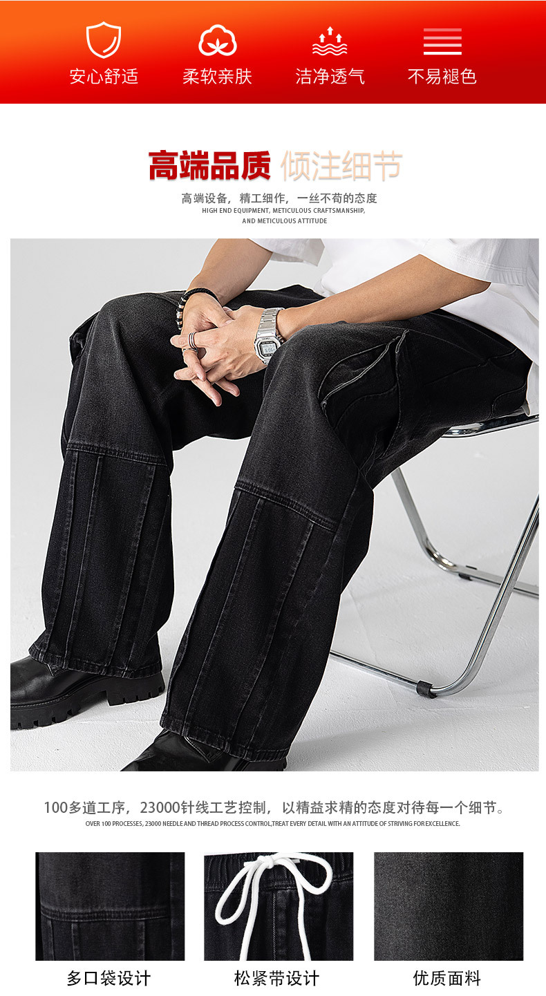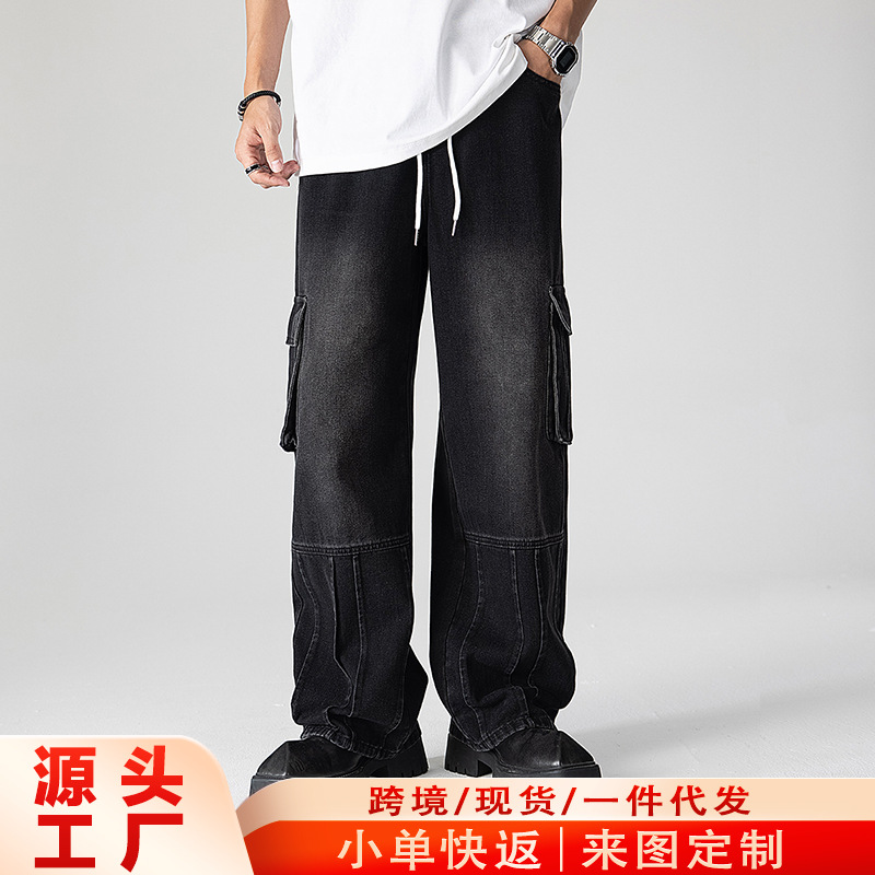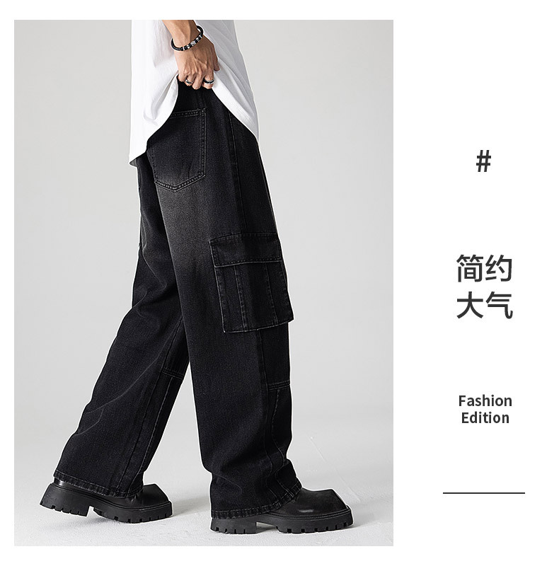 2024 새로운 미국 스타일 하이 스트리트 와이드 레그 캐주얼 긴 바지 빈티지 대형 포켓 툴링 청바지 남성 가을스토어 가기