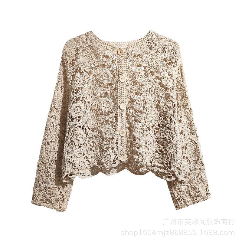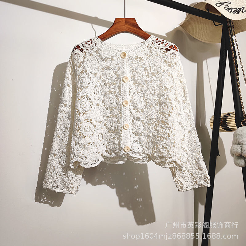 프랑스 중공업 크로 셰 빈티지 V-Neck 레이스 자수 중공 디자인 짧은 니트 카디건 선 스크린 최고 여성