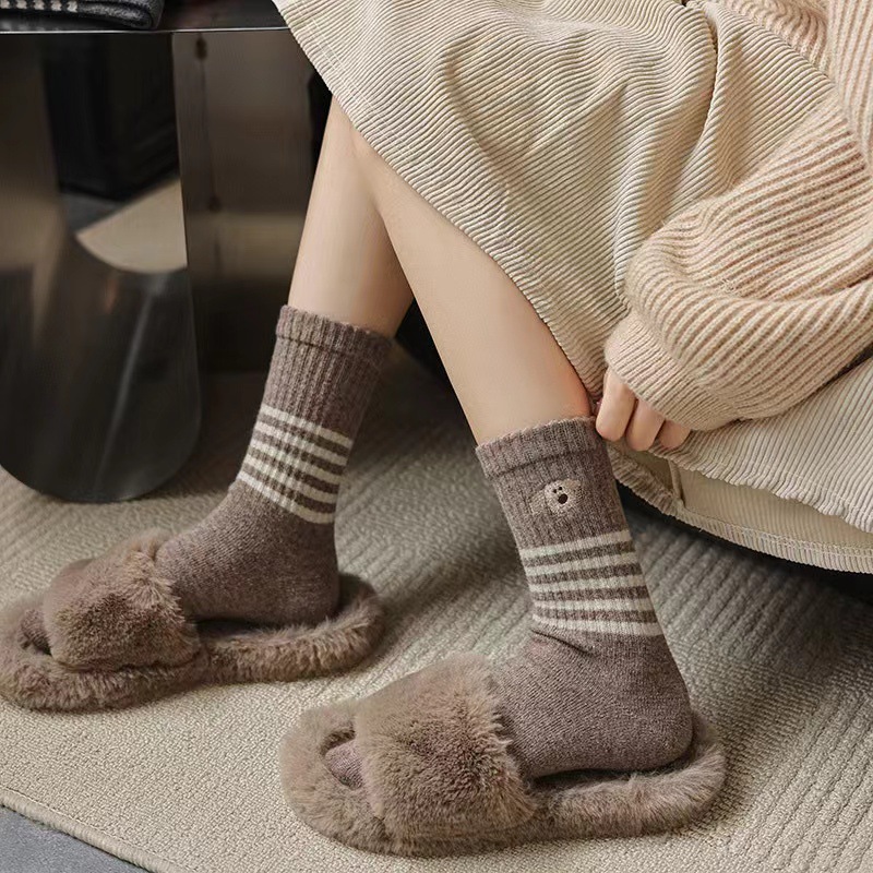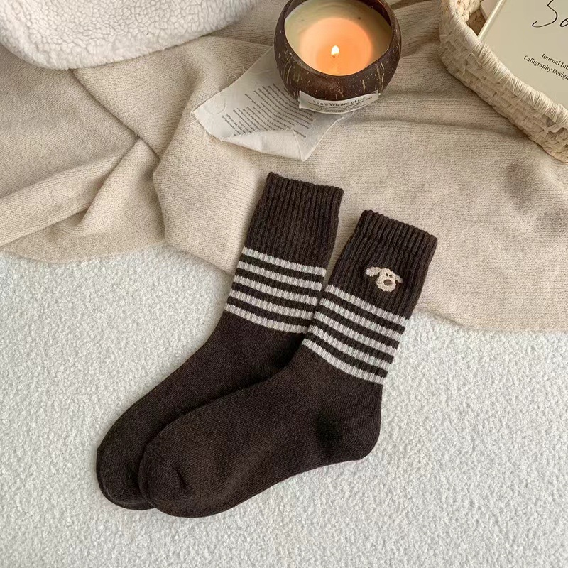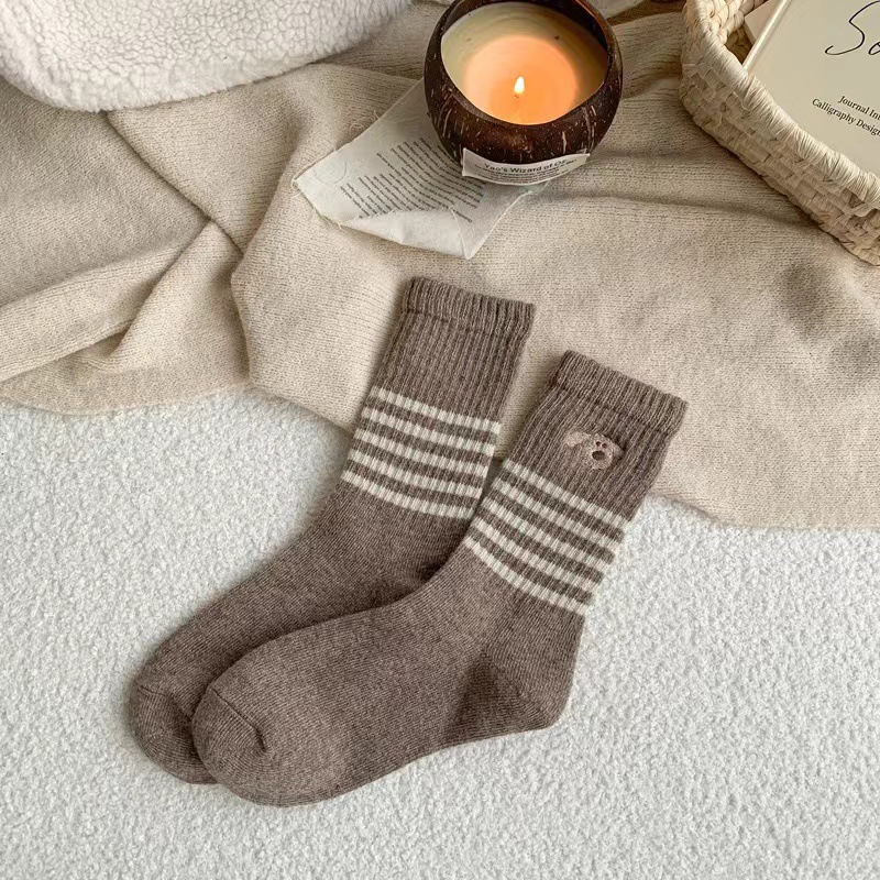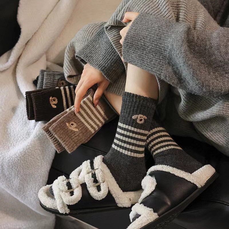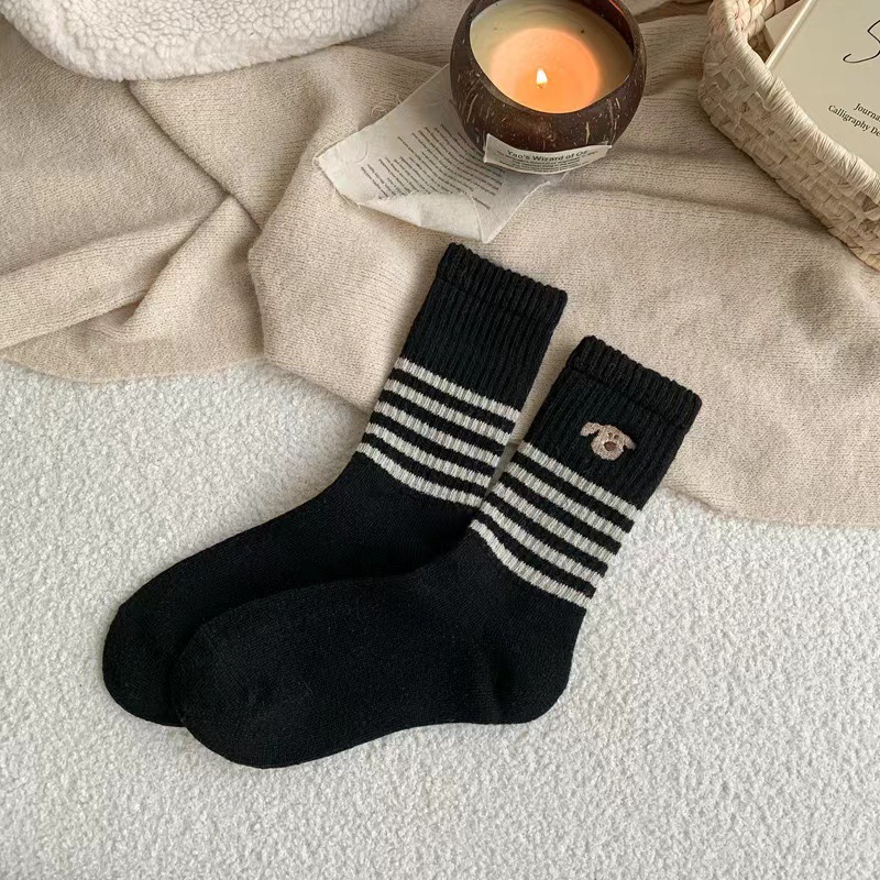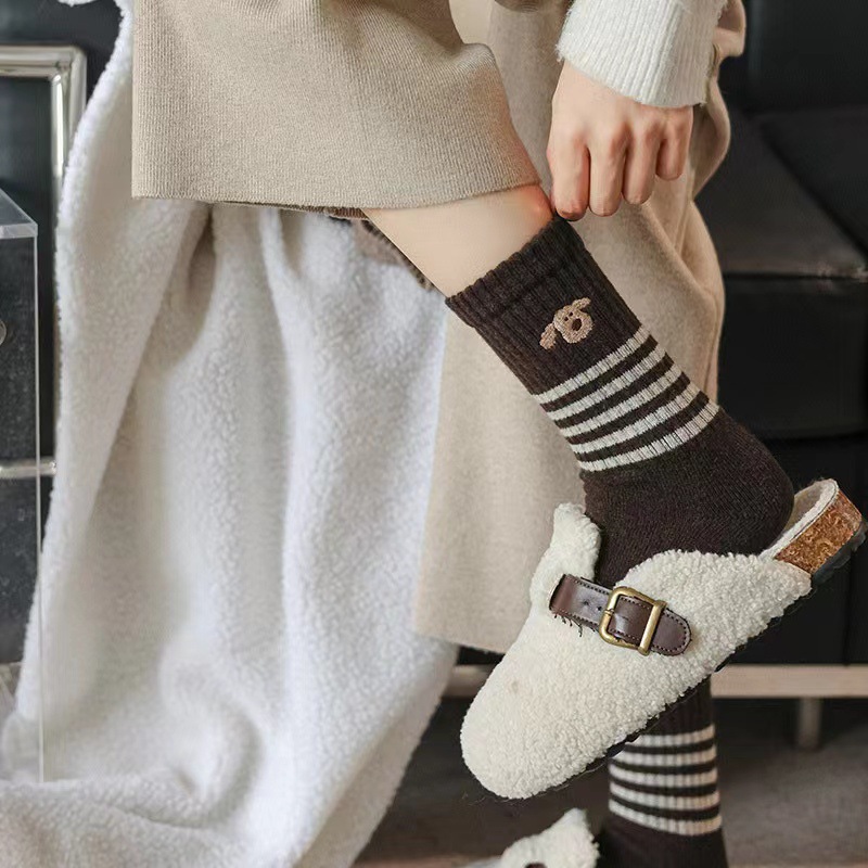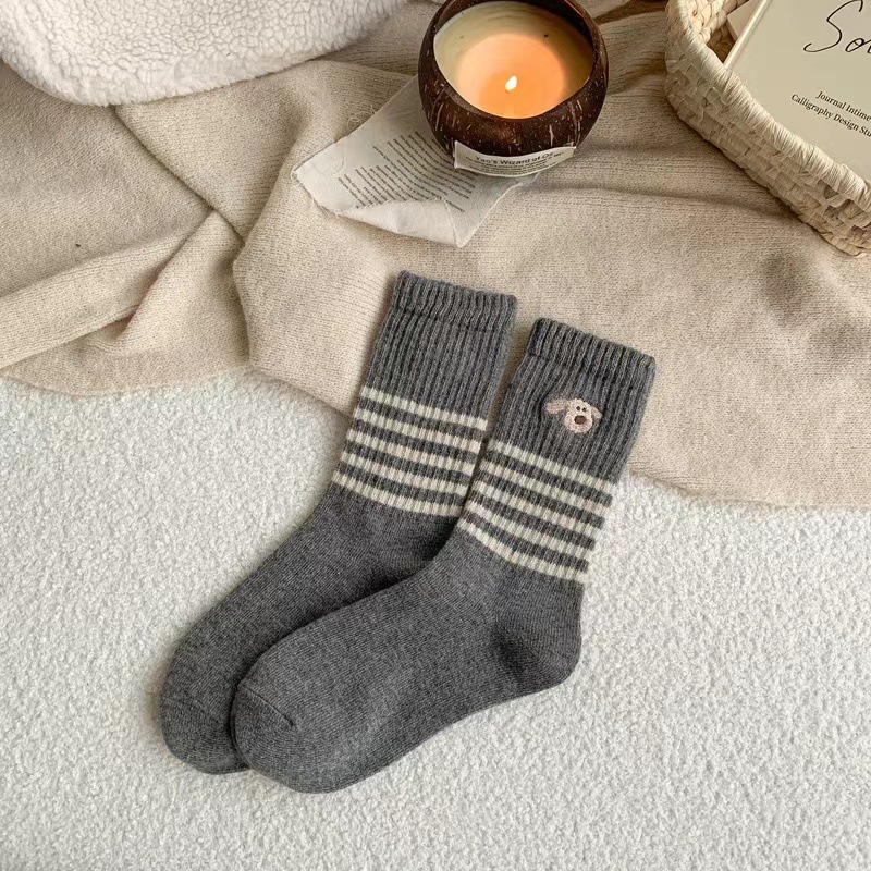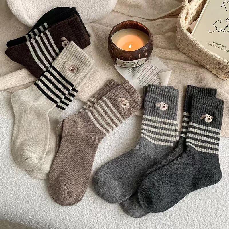 가을과 겨울 새로운 강아지 자수 만화 줄무늬 양말 어린이 중간 튜브 양말 가을과 겨울 두꺼운 따뜻한 올 매치 필 양말