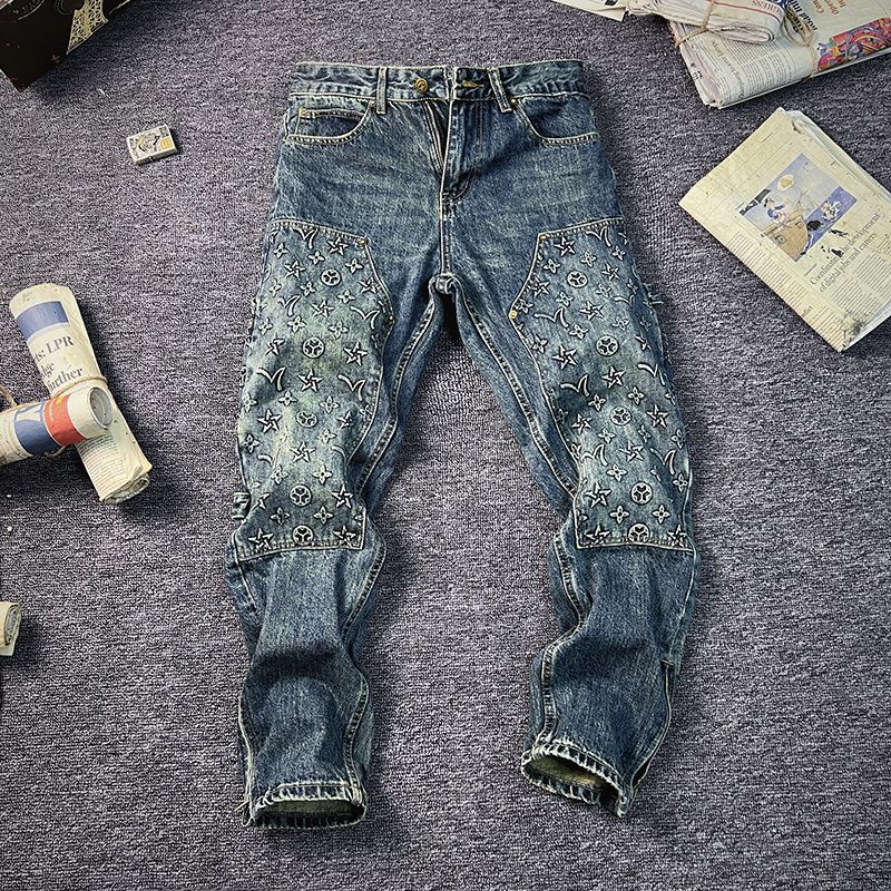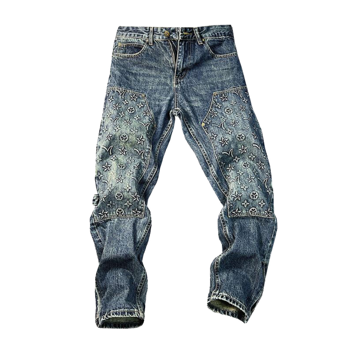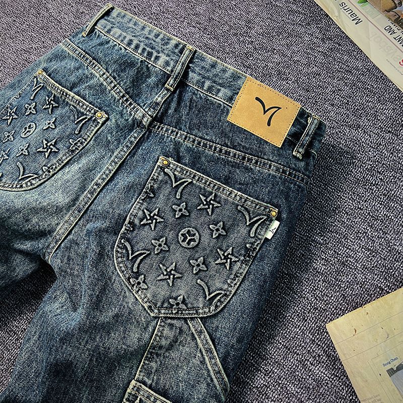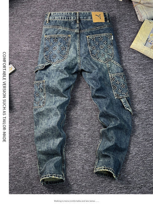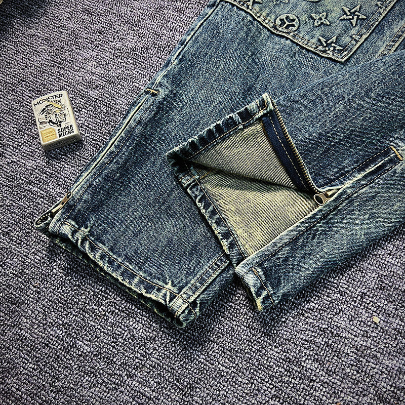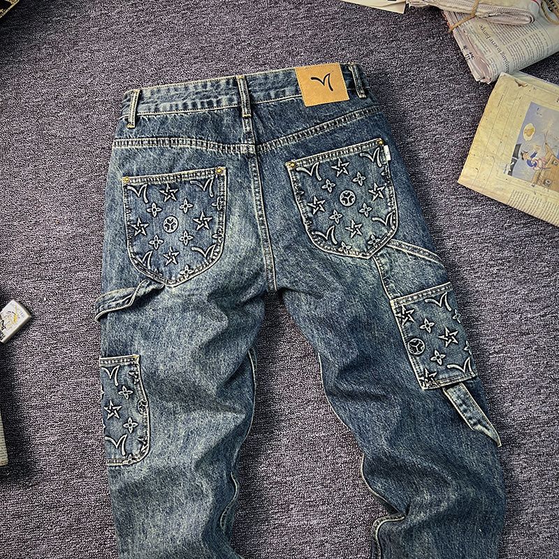 가을 2024 새로운 청바지 남성용 아메리칸 스타일 레트로 트렌디 브랜드 양각 오래 된 스트레이트 느슨한 원숭이 스티칭 탄성