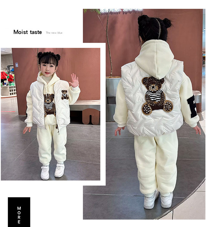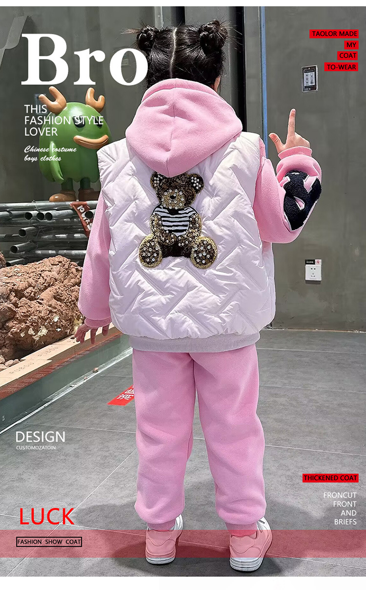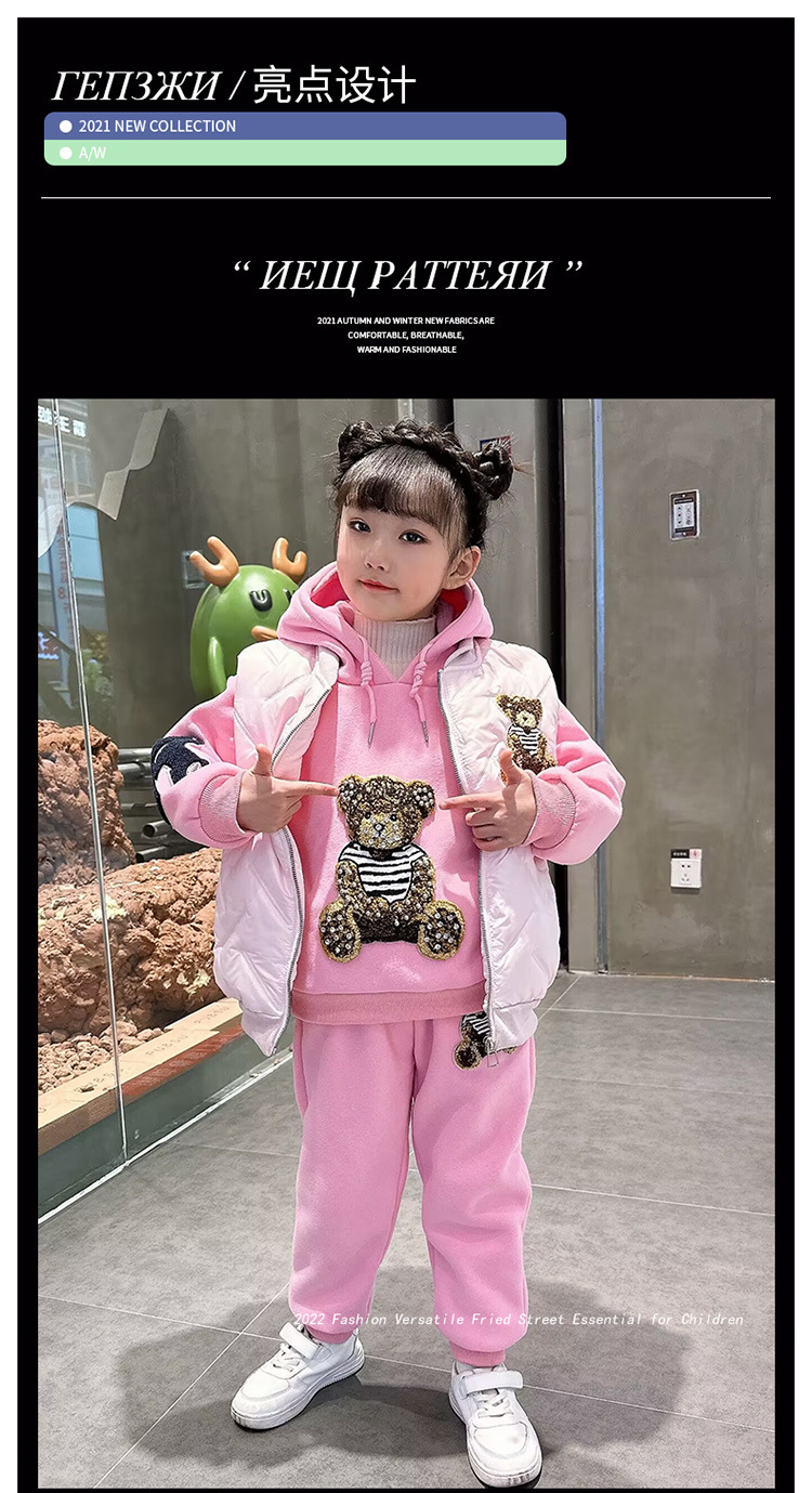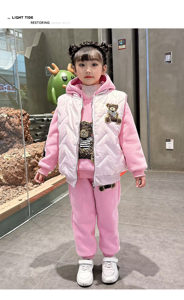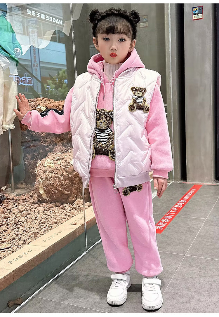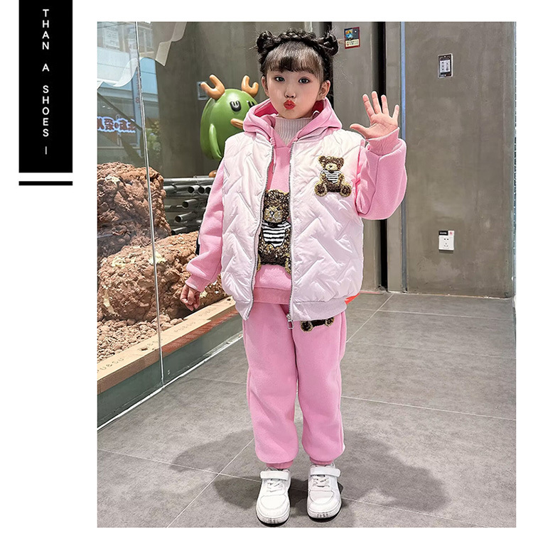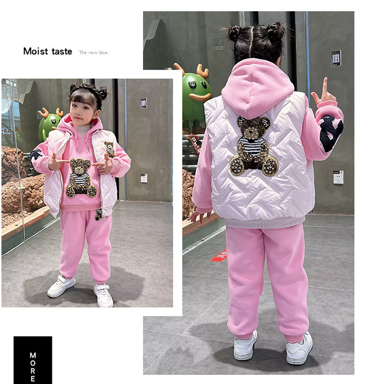 소녀 벨벳 가을 겨울 세트 2024 새로운 어린이 유행 두꺼운 겨울 큰 어린이 조끼 3 조각 세트스토어 가기