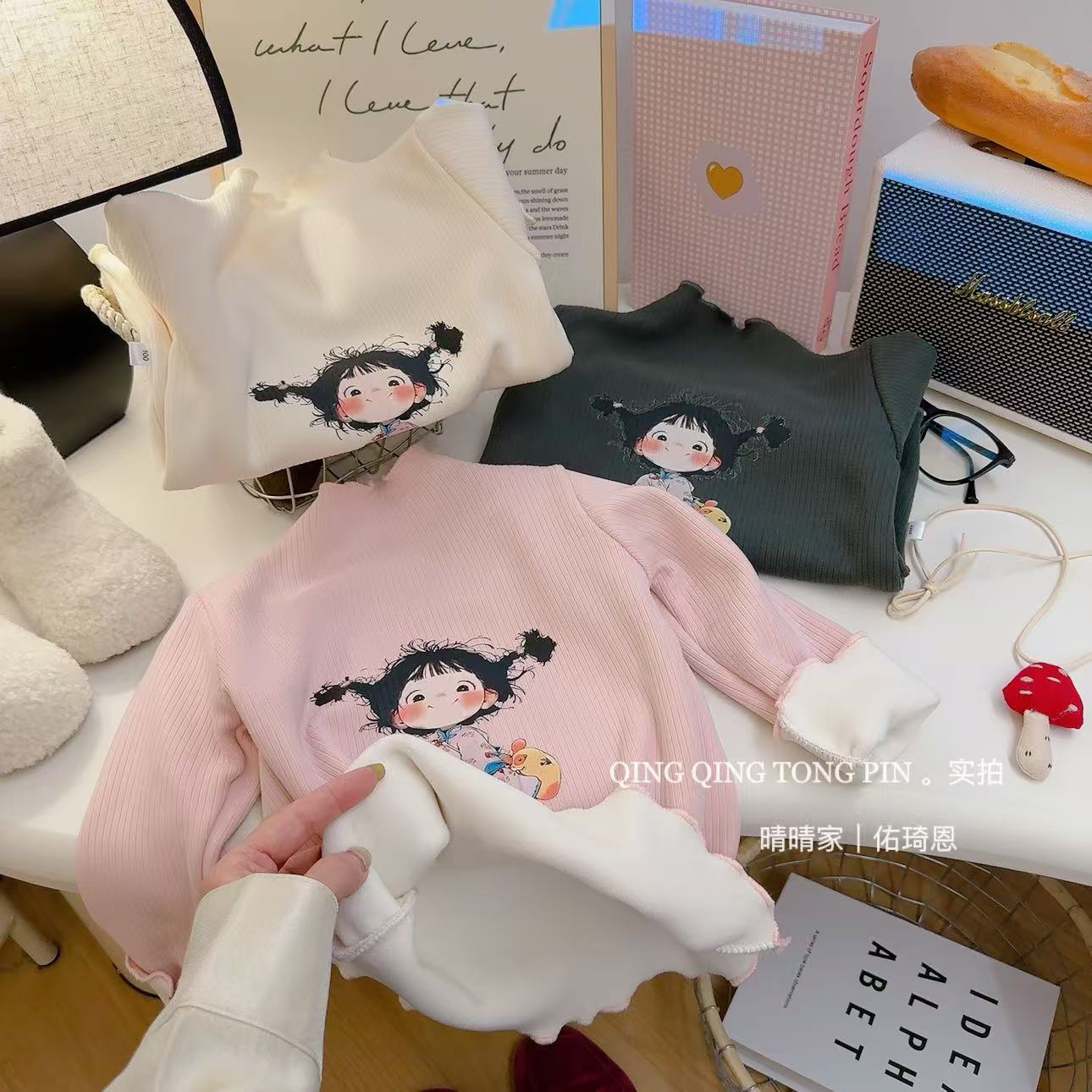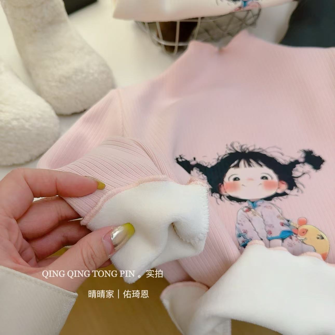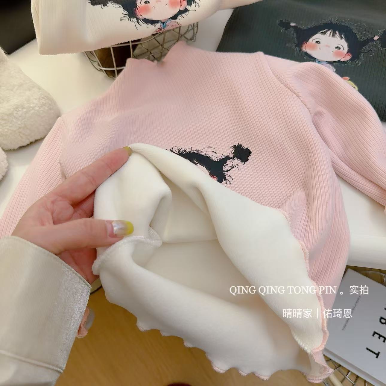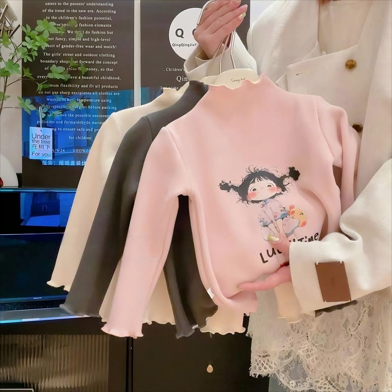 [기모] 어린이 가을 · 겨울 반높이 목걸이 여성 보물 행운의 소녀 귀여운 브레드헤드 기모 베이스 셔츠