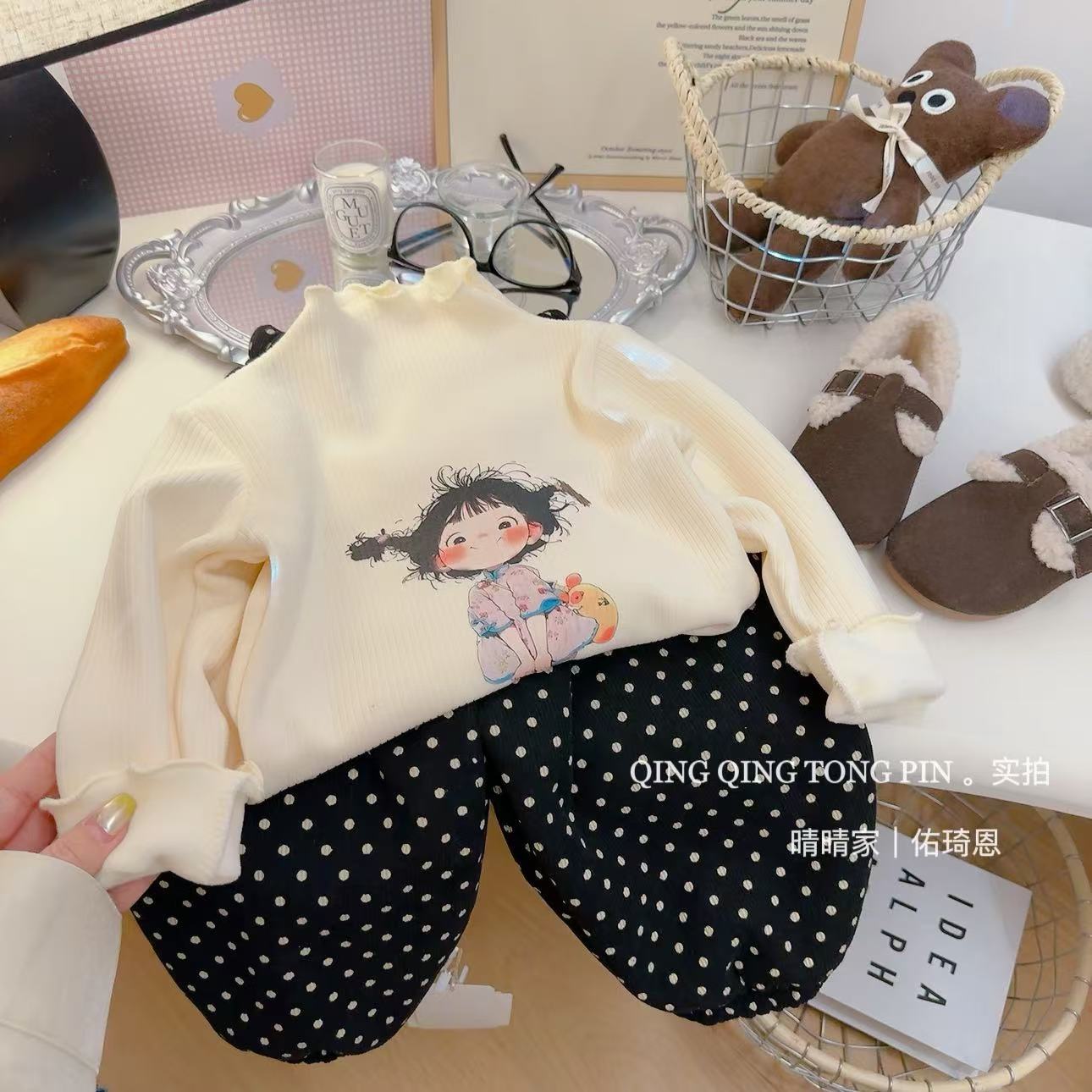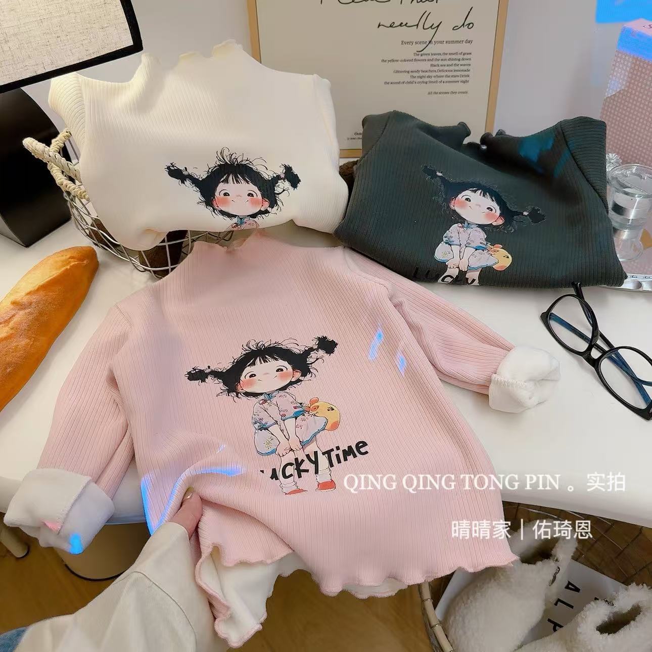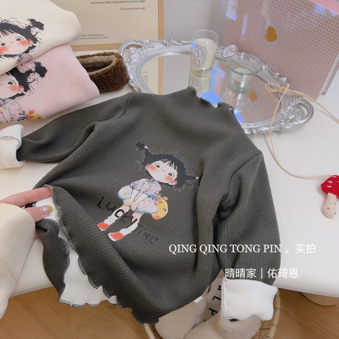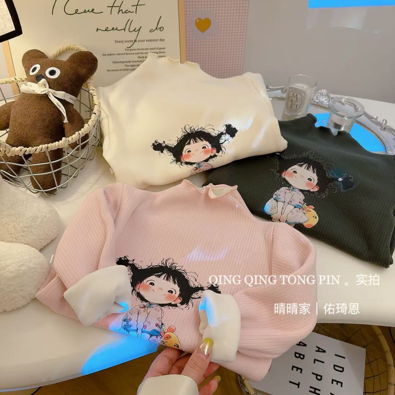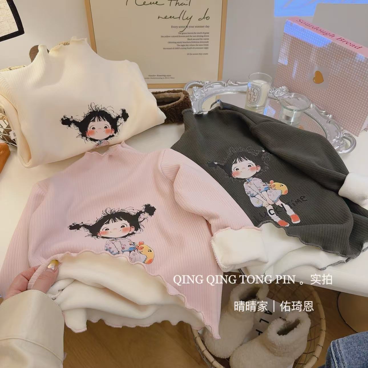 [기모] 어린이 가을 · 겨울 반높이 목걸이 여성 보물 행운의 소녀 귀여운 브레드헤드 기모 베이스 셔츠