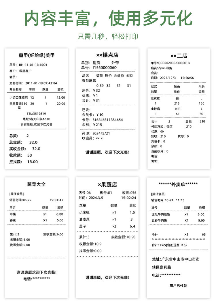 - 出租车票据打印,管理费收据打印,收据打印,餐厅订购信息打印等小型轻便,易于出门工作。