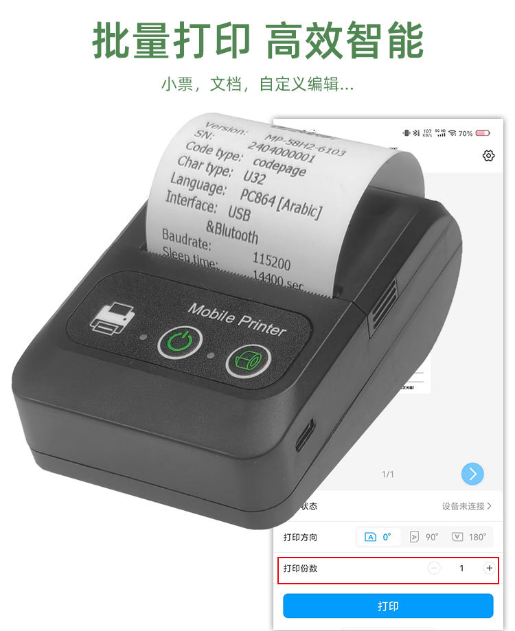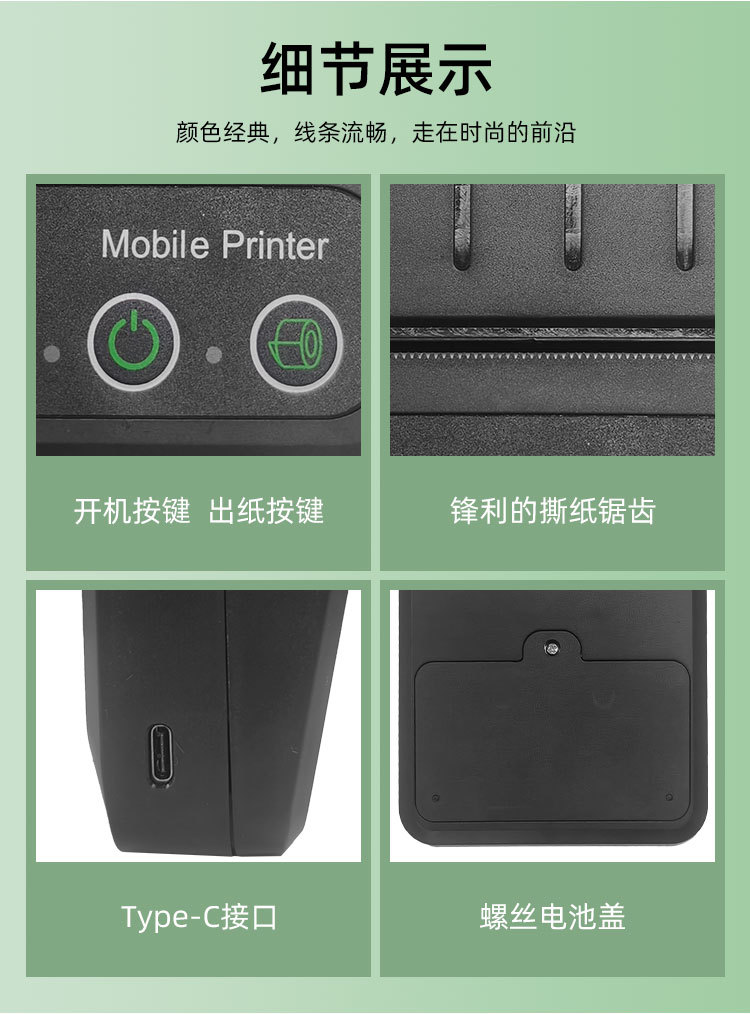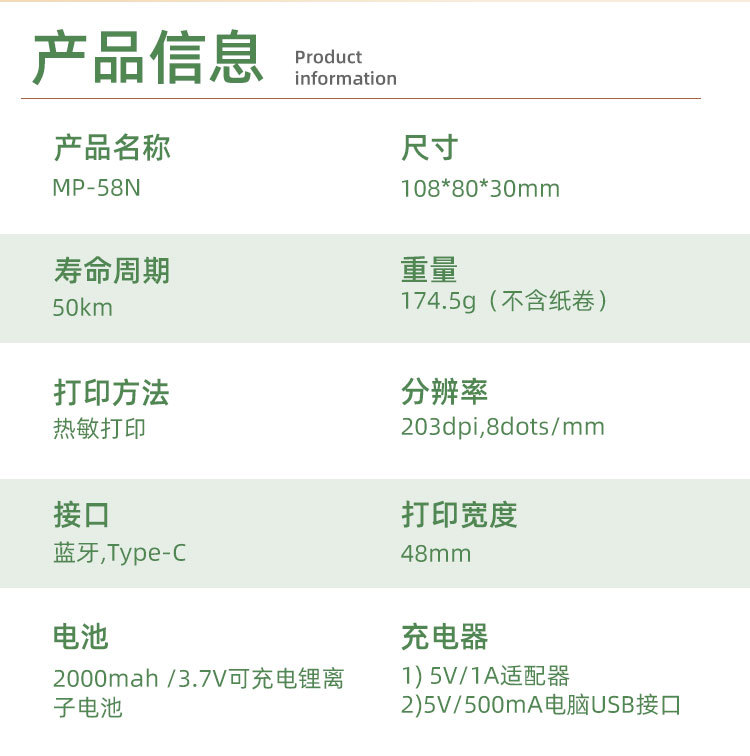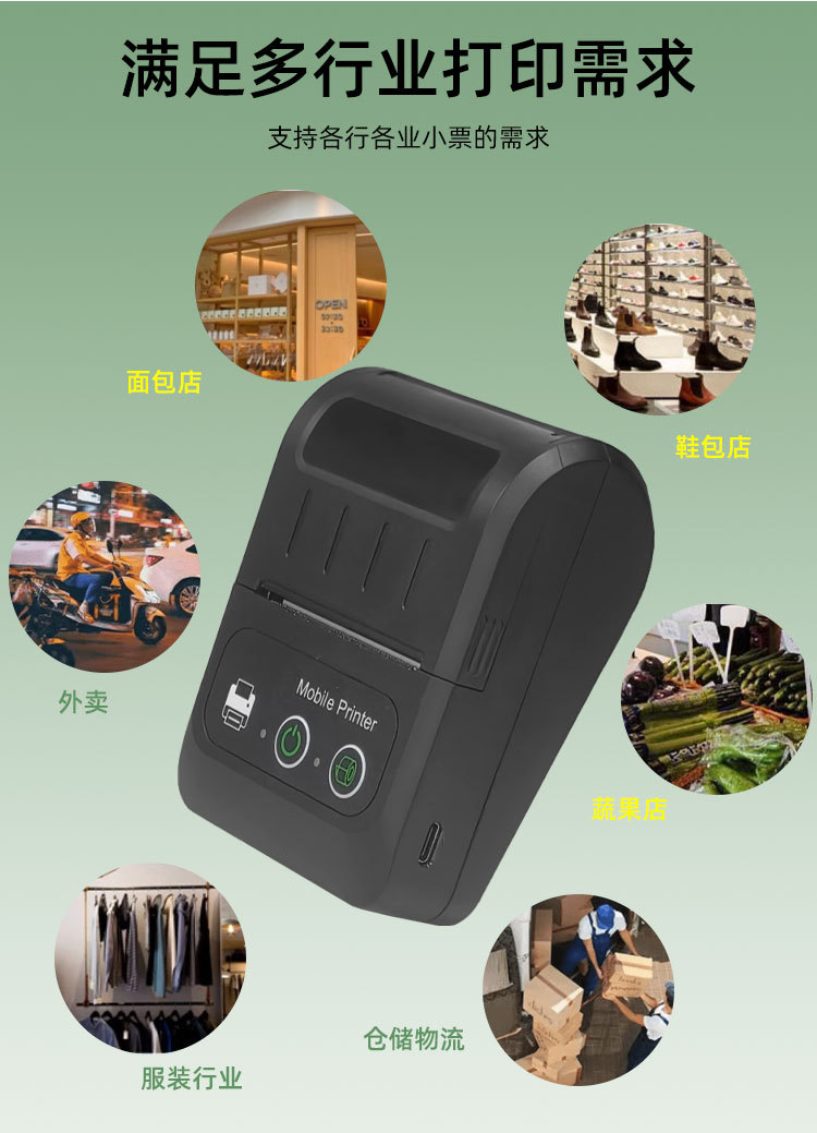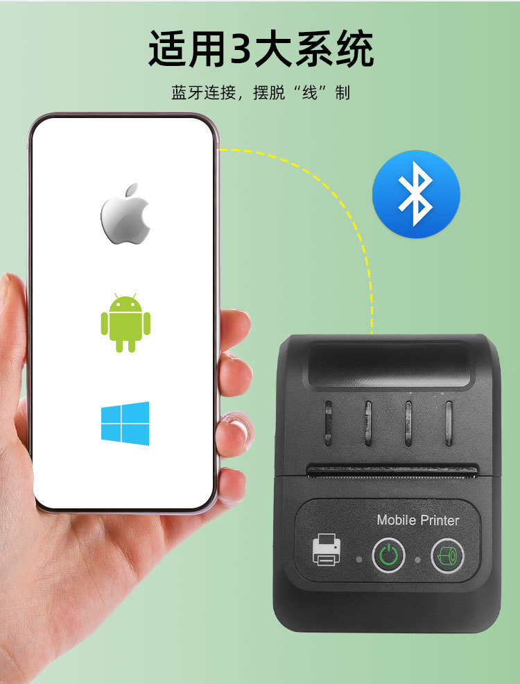 - 支持蓝牙功能,支持Android,iOS和Windows,方便您无线打印设备中的数据