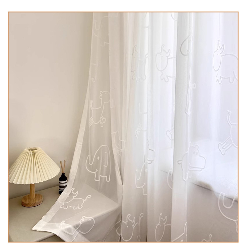 새로운 동물 왕국 어린이 방 창 화면 흰색 만화 커튼 침실 베이 창 3D 3 차원 양각 자수 거즈 커튼