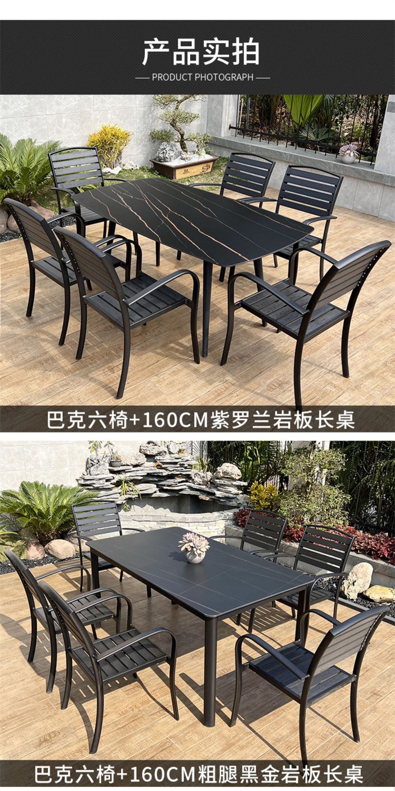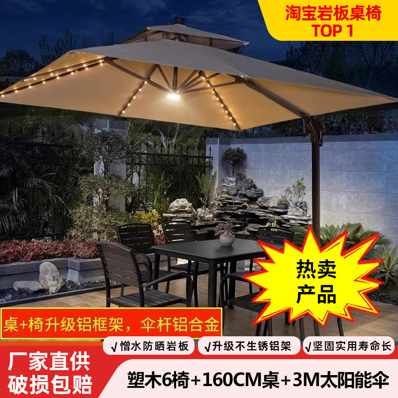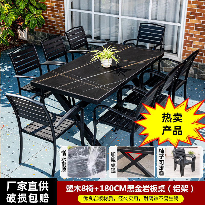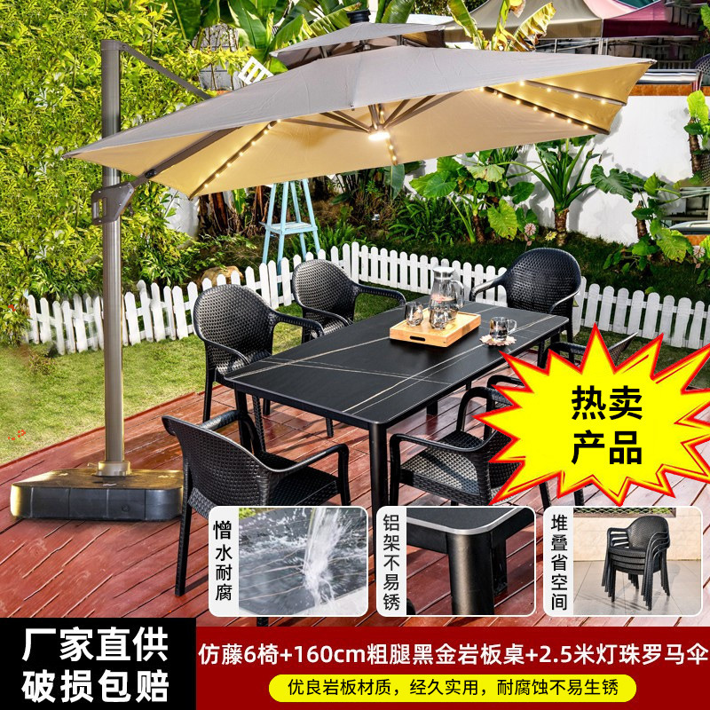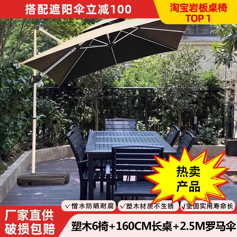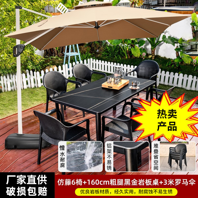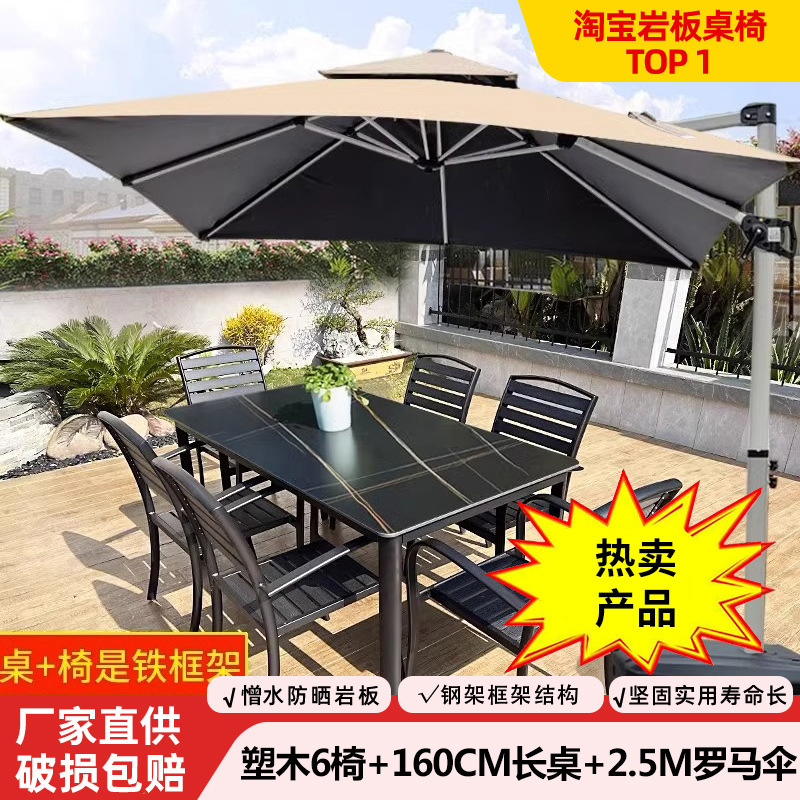 • [테이블우산조합] 플라스틱목재 6의자_160CM 두께의 블랙골드 슬레이트 테이블과 의자_ 3m 로마우산 [8CM 알루미늄합금우산]