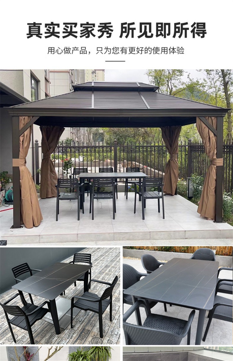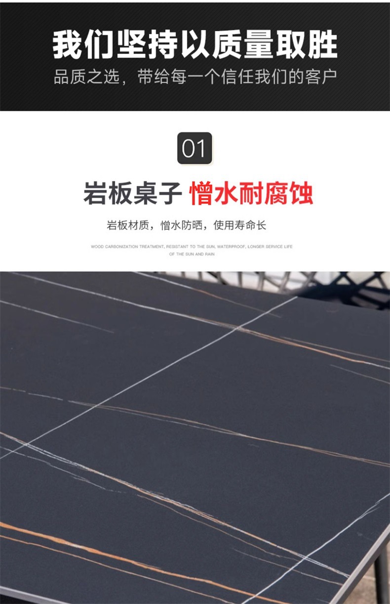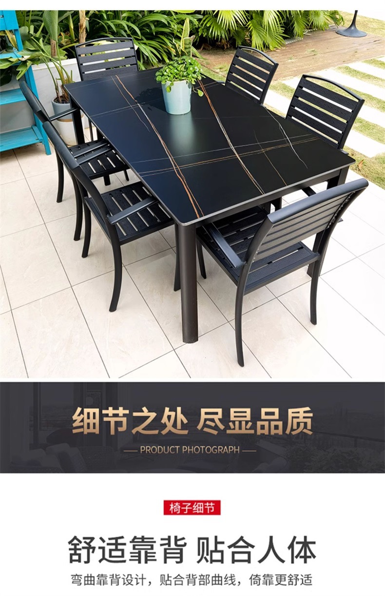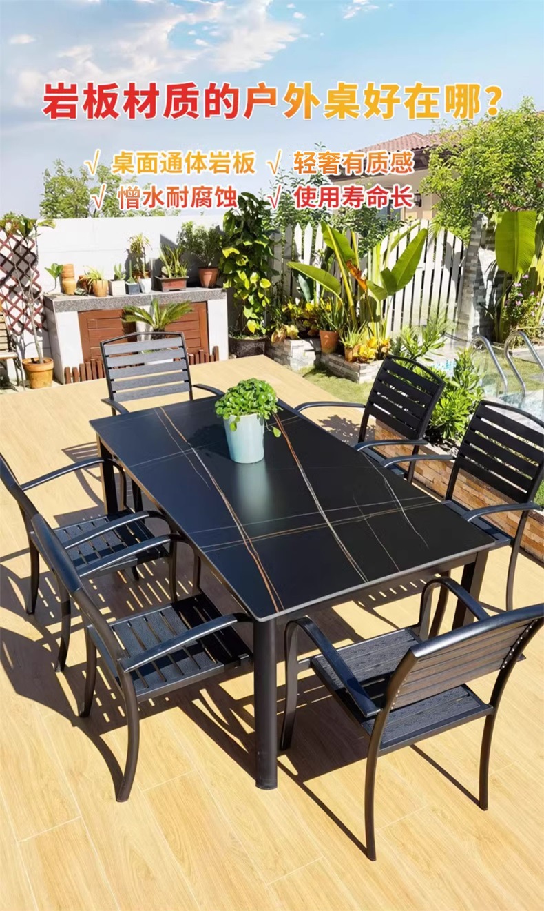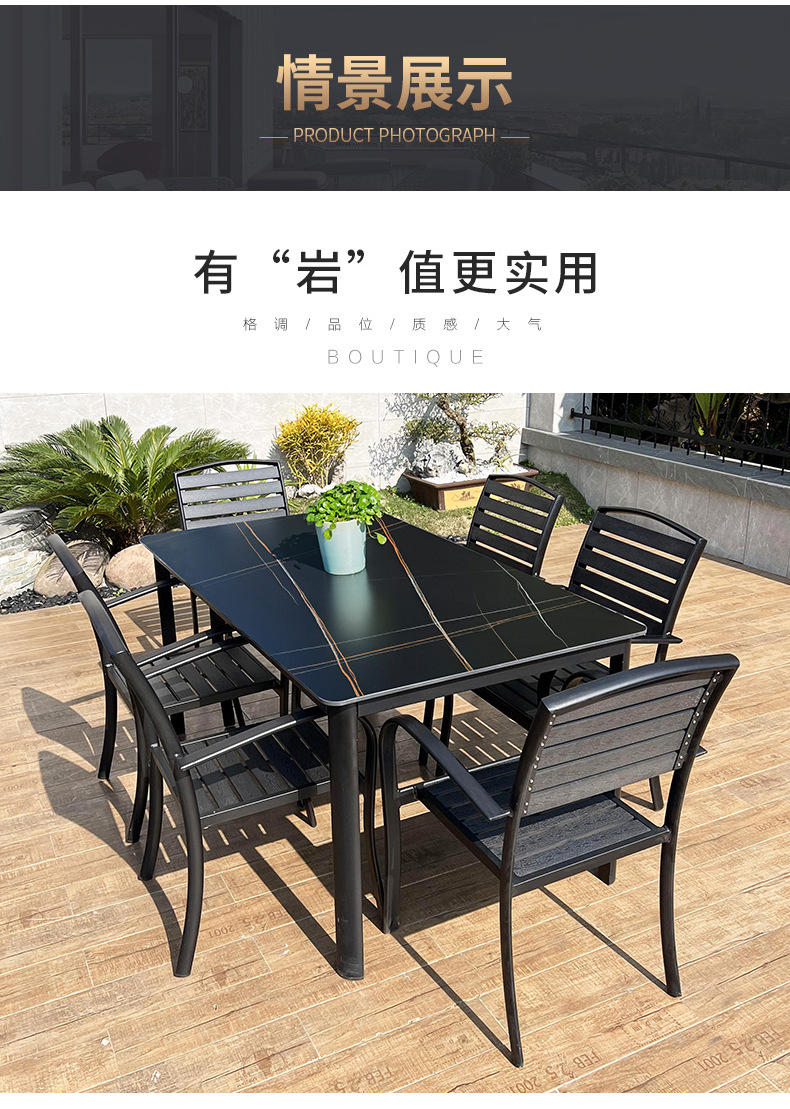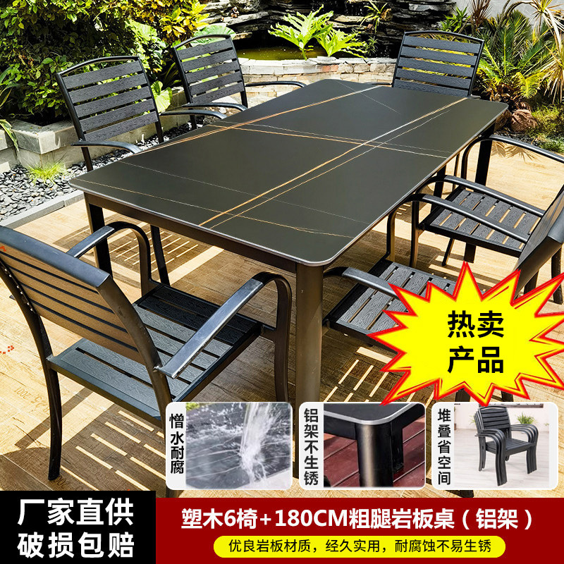 • [테이블우산조합] 플라스틱목재 6의자_160CM 두께의 블랙골드 슬레이트 테이블과 의자_ 3m 로마우산 [8CM 알루미늄합금우산]