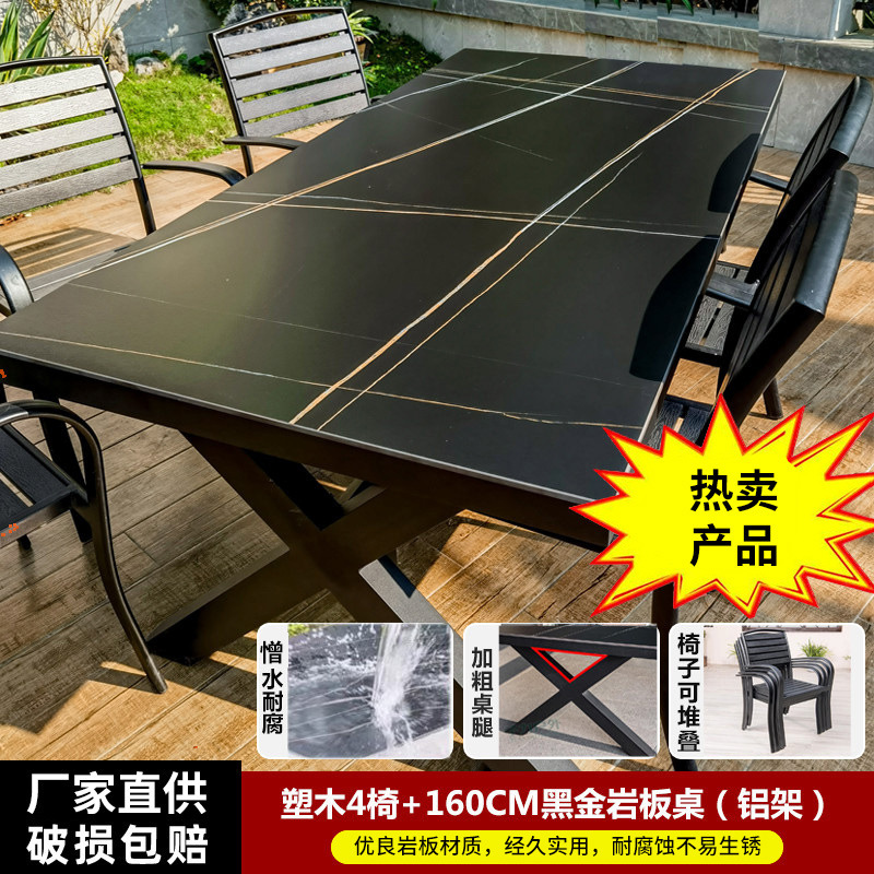 • [알루미늄 프레임] 플라스틱목재 의자 4개_160cmX다리 블랙골드 슬레이트 테이블