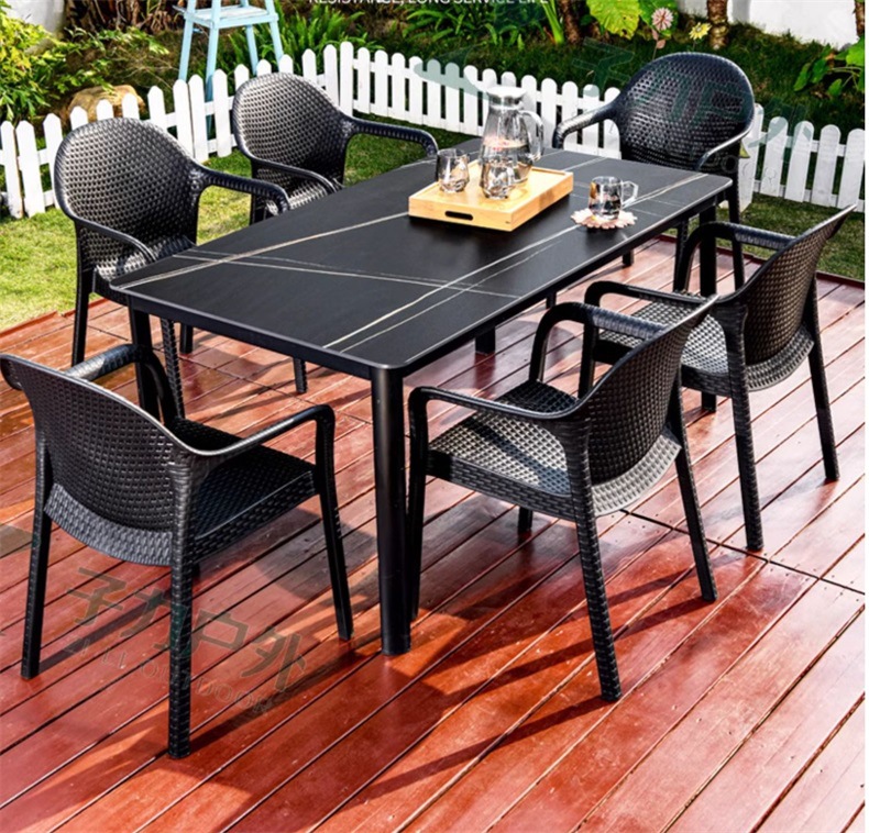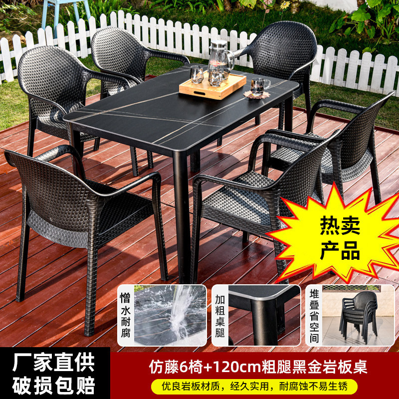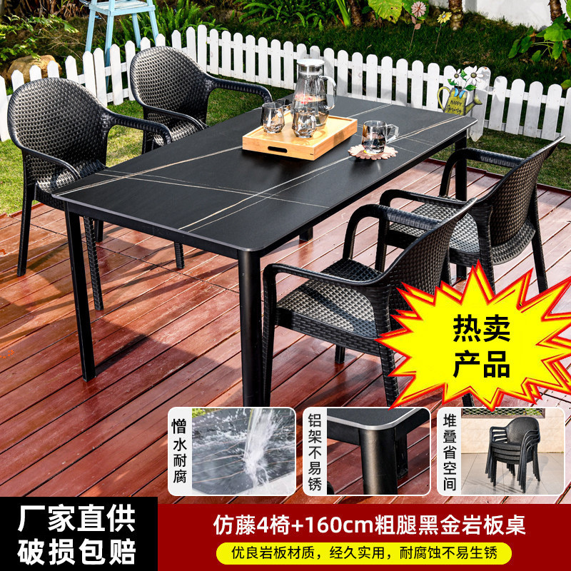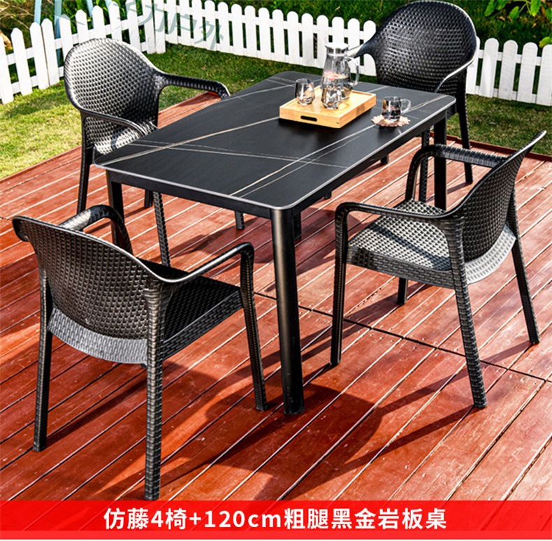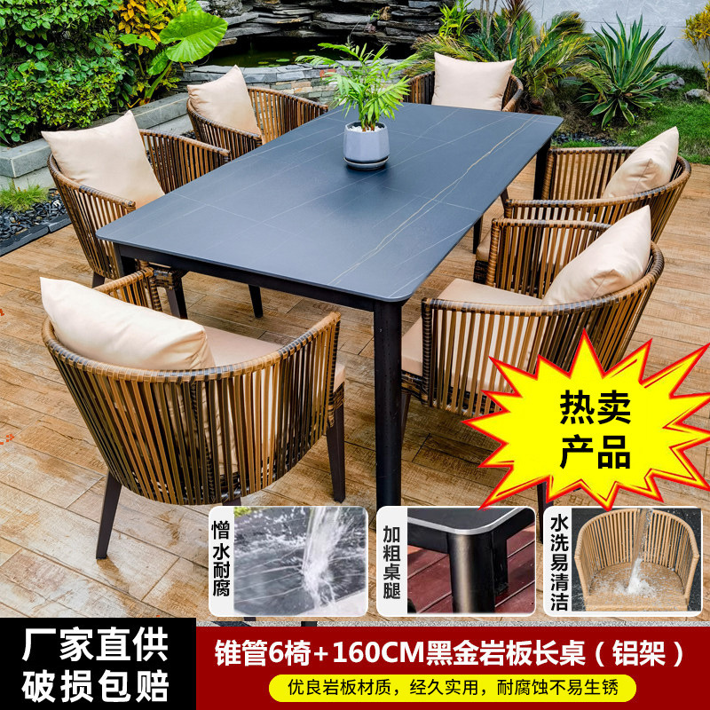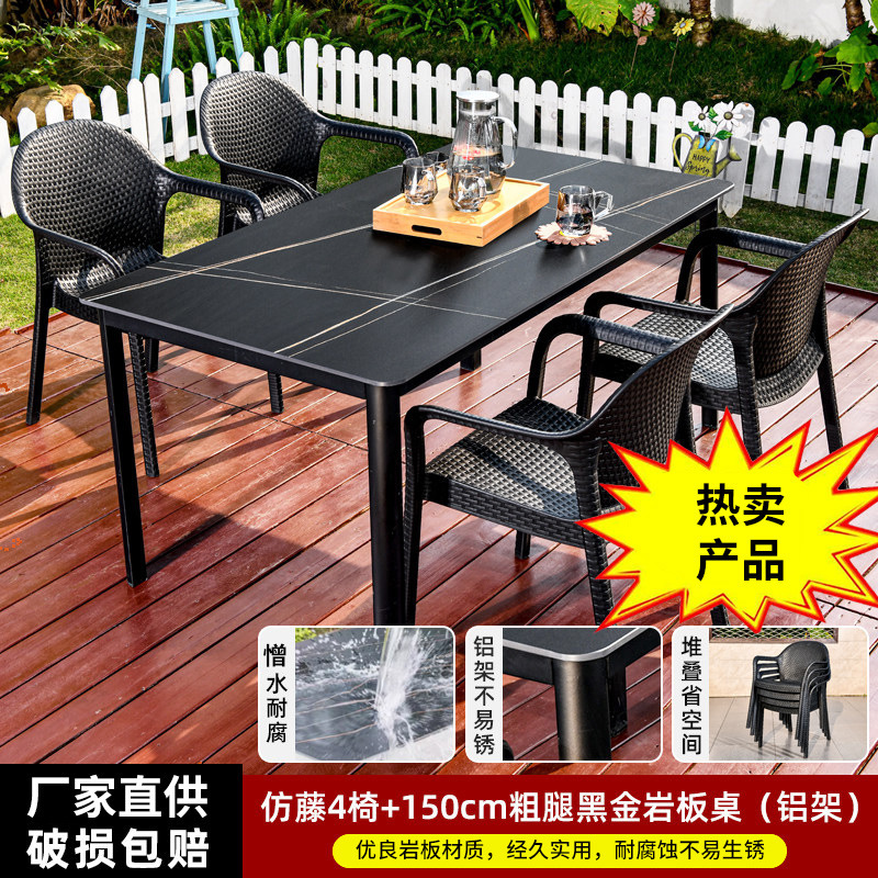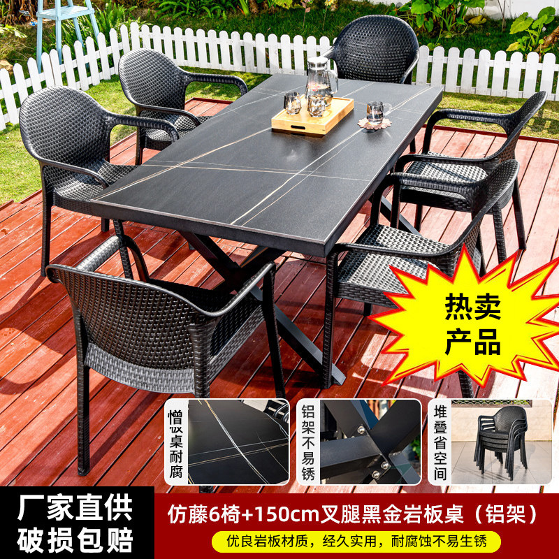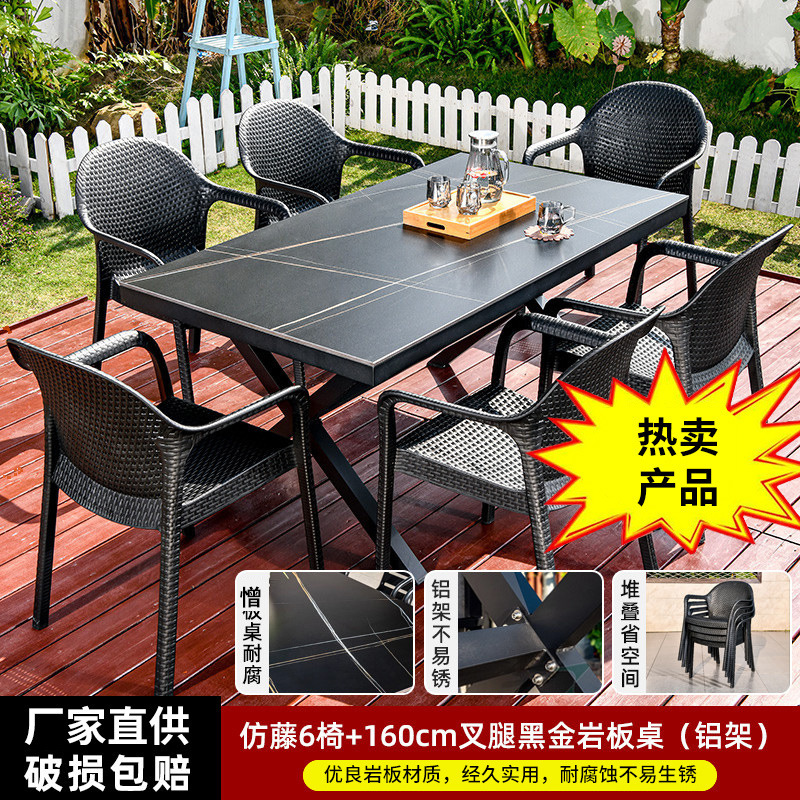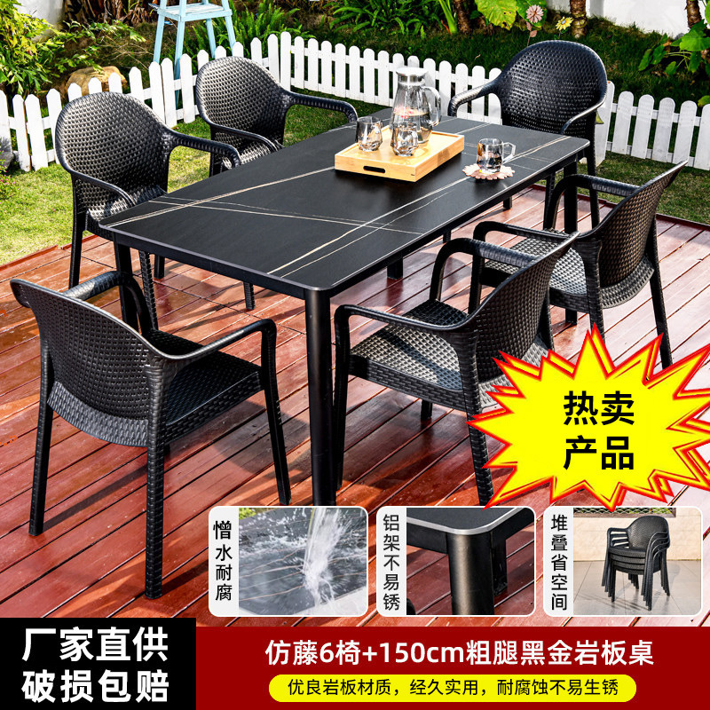 • 알루미늄 프레임] 모조 등나무 의자 6개_120CM 두꺼운 다리 블랙 골드 슬레이트 롱 테이블