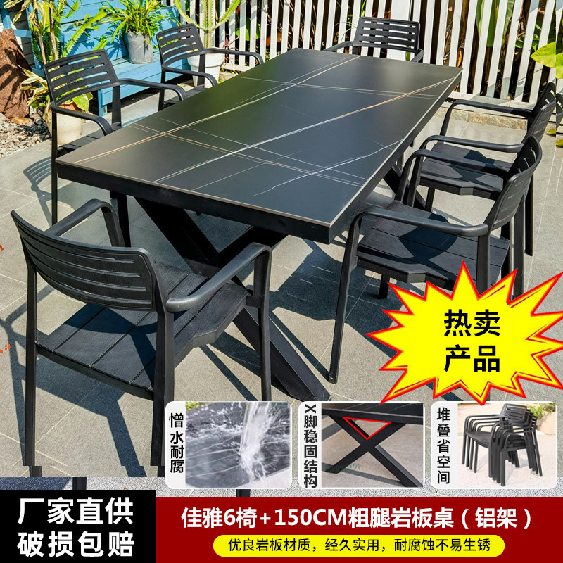 • [X다리 테이블] 인조등나무 6체어_150CM(알루미늄프레임) X다리 블랙골드 슬레이트 롱테이블