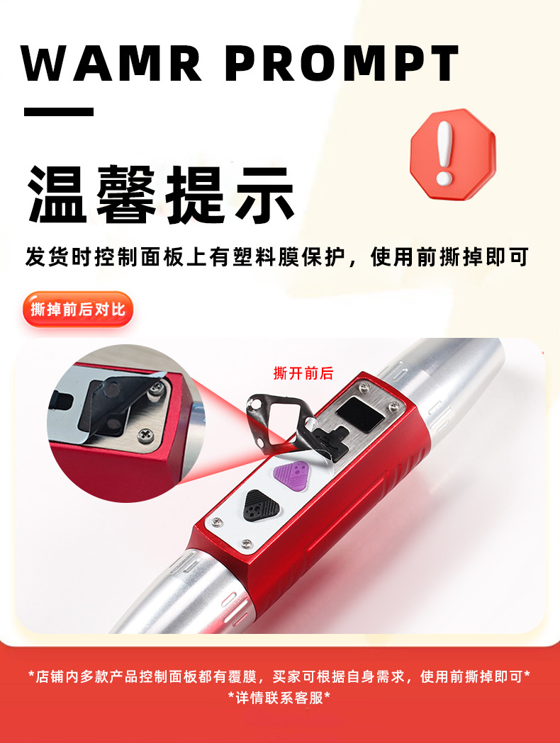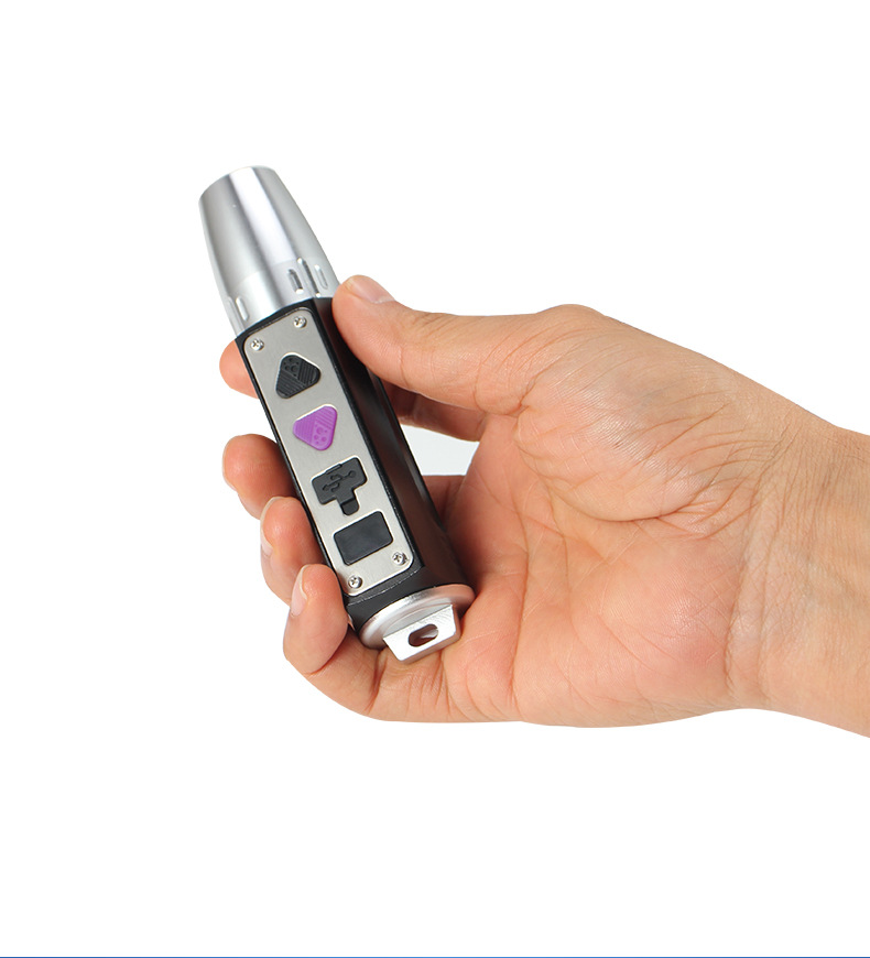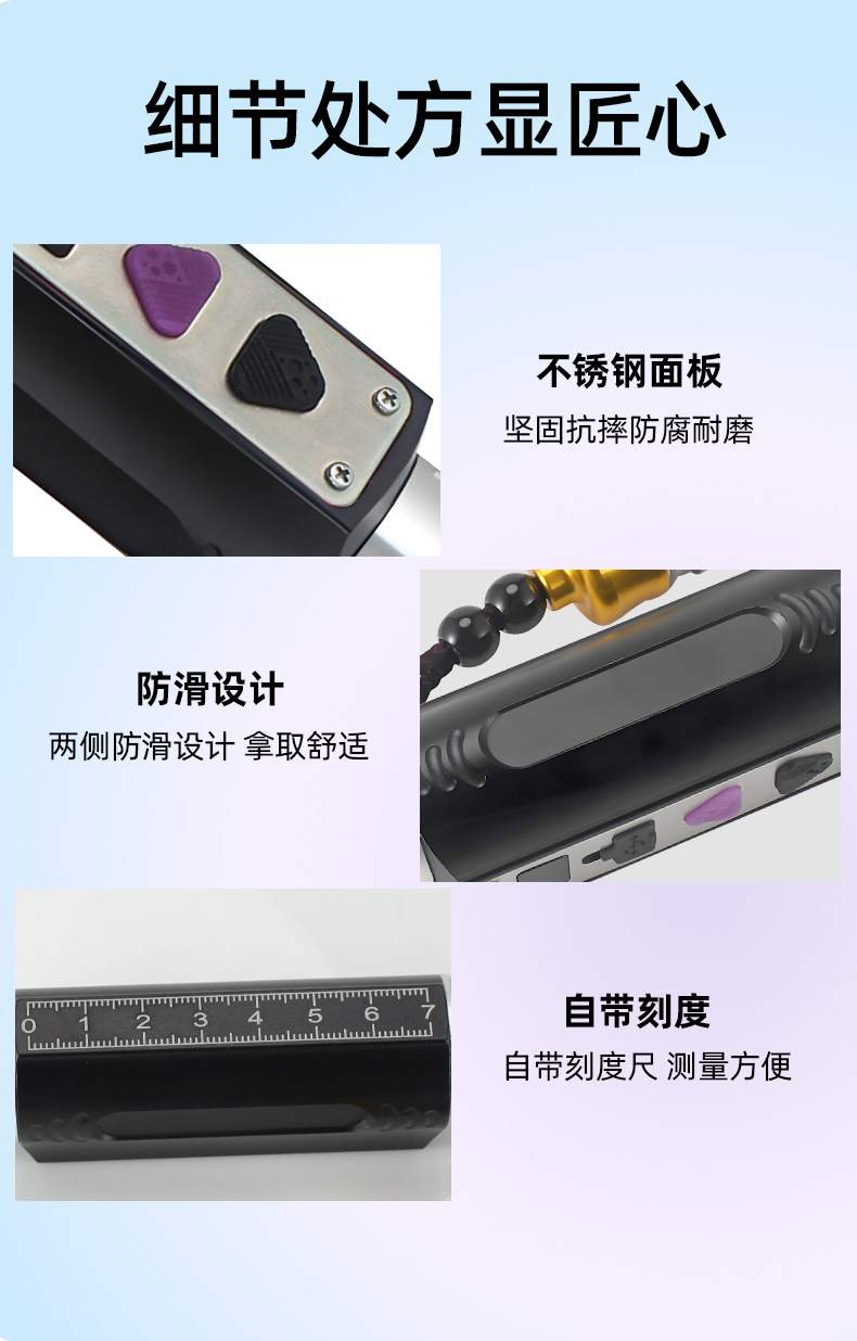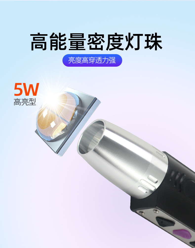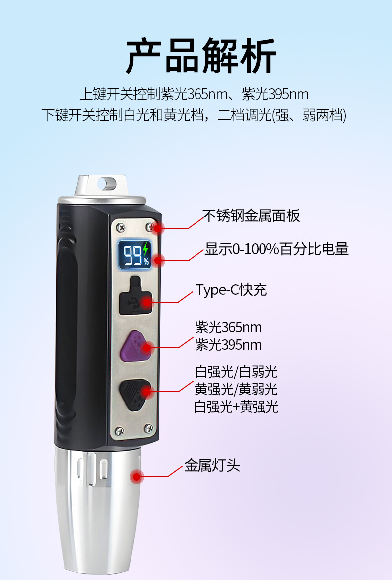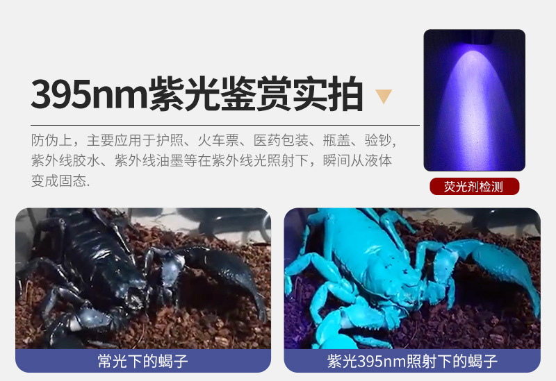 2,档位:紫光365nm(高亮100%)--紫光395nm(高亮100%)--关闭;