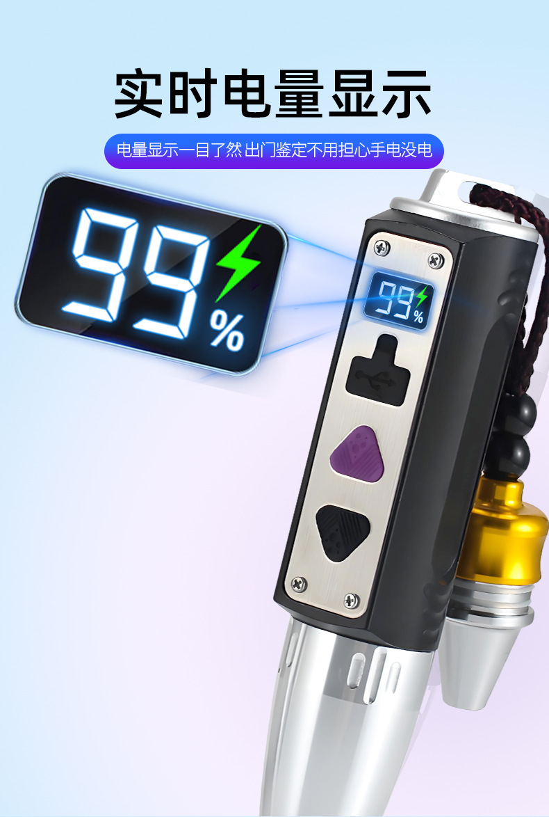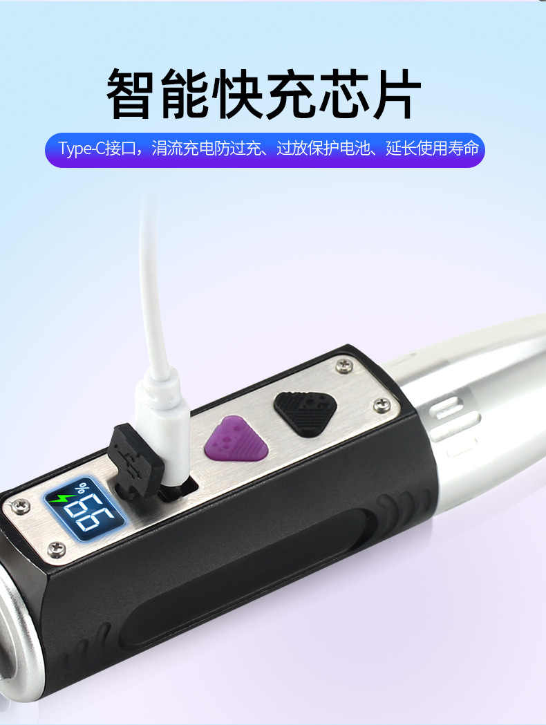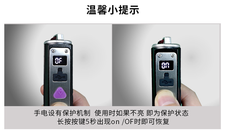 3,锁定功能:关机状态下,同时长按开关黑色键和紫色键--5秒,手电进入锁定状态--不能开机(以防装包里误按导致手电亮起)锁定成功后显示屏亮起OF慢闪三次提示,重复操作或给手电充电恢复手电正常功能--恢复成功后显示屏亮起On慢闪三次提示。