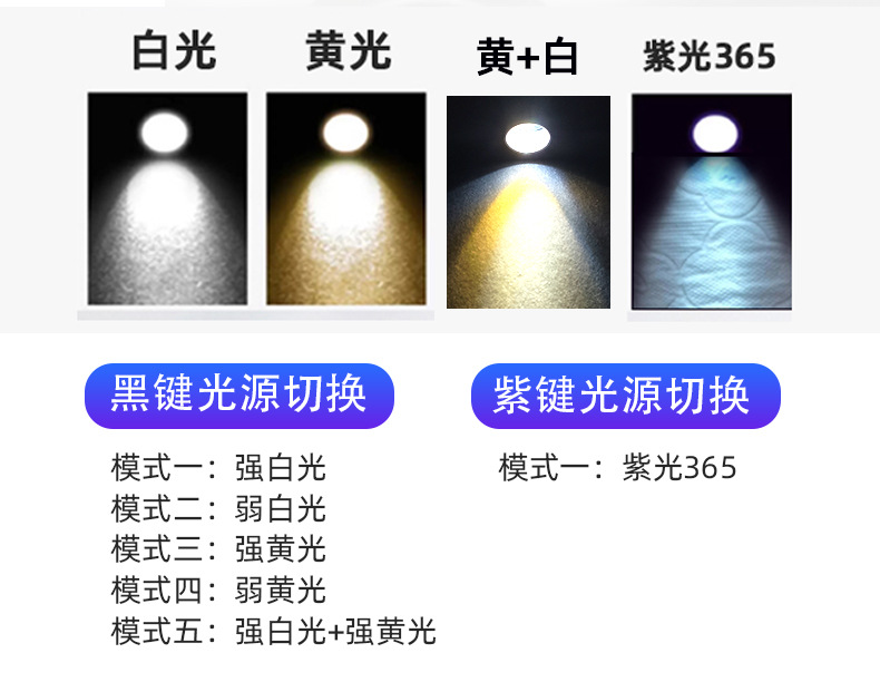 光源:【白光7000-8500K】+【黄光2800-3200K】+【紫光365nm】