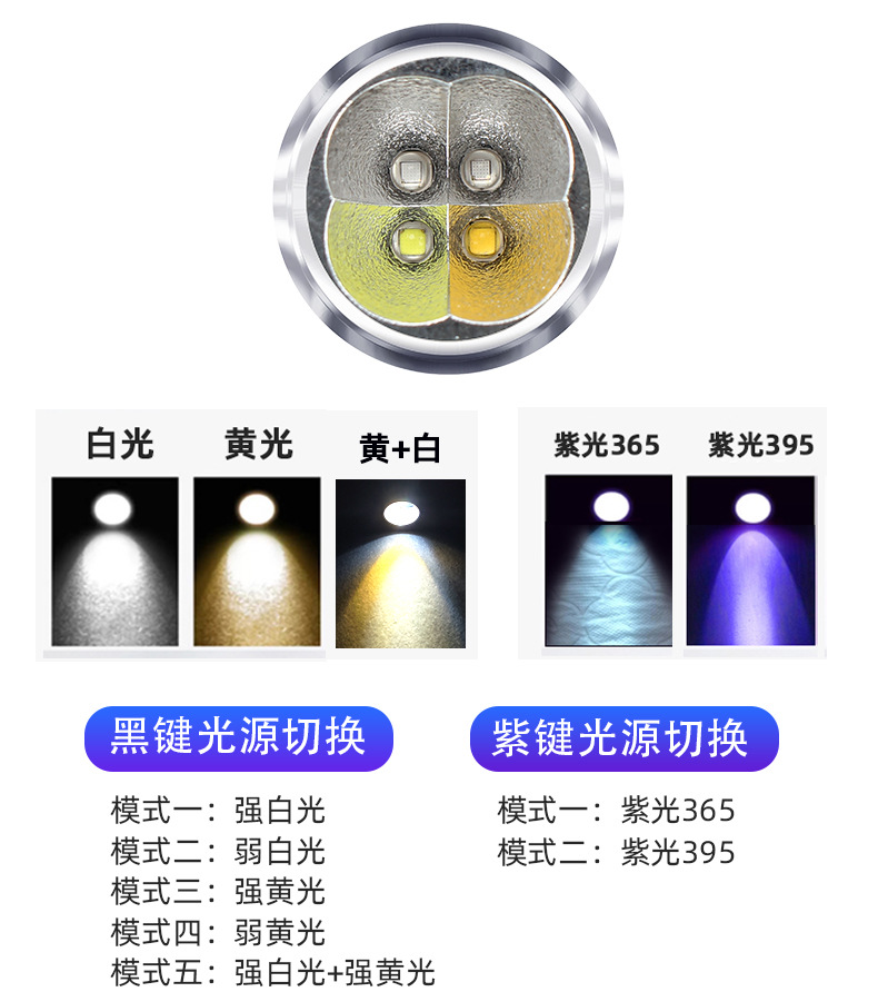 光源:【白光7000-8500K】+【黄光2800-3200K】+【紫光365nm】+【紫光395nm】