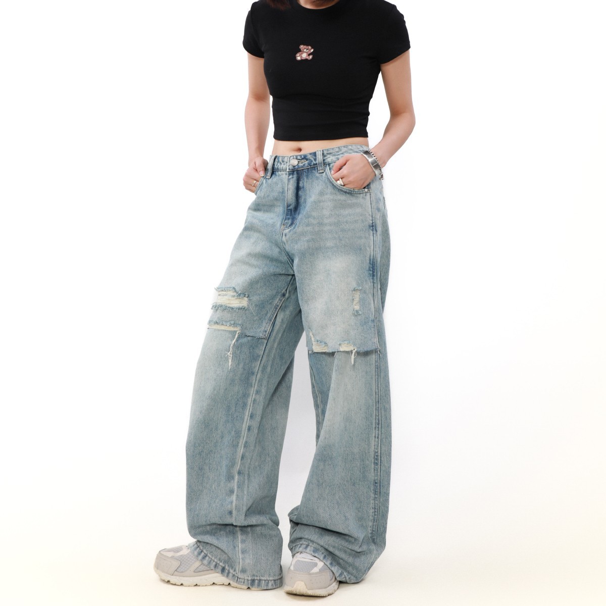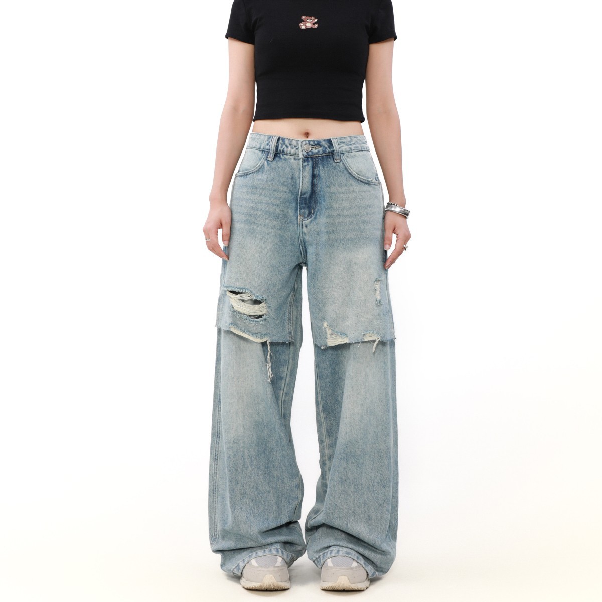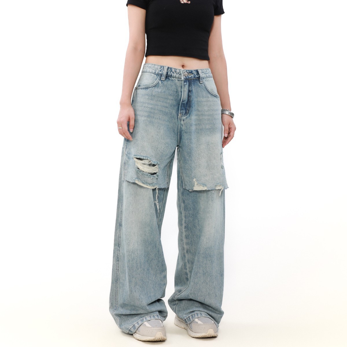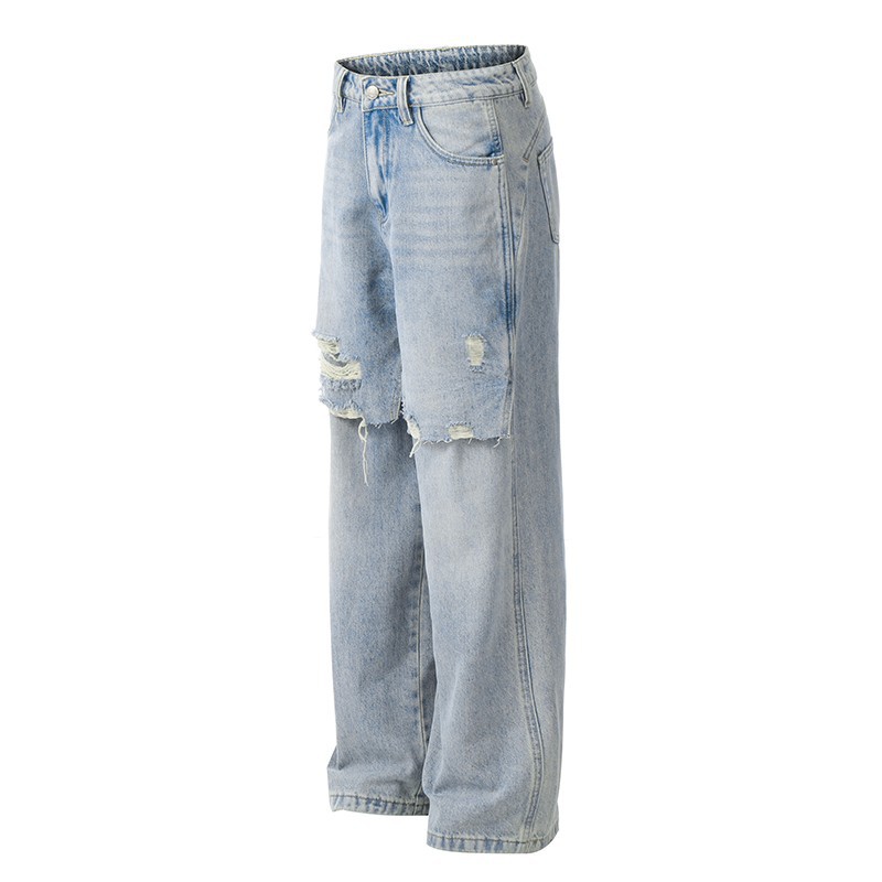 가을과 겨울 새로운 디자인 센스 틈새 하이 스트리트 스플릿 리칭 청바지 여성용 스트레이트 아메리칸 스타일 레트로 롱 바지