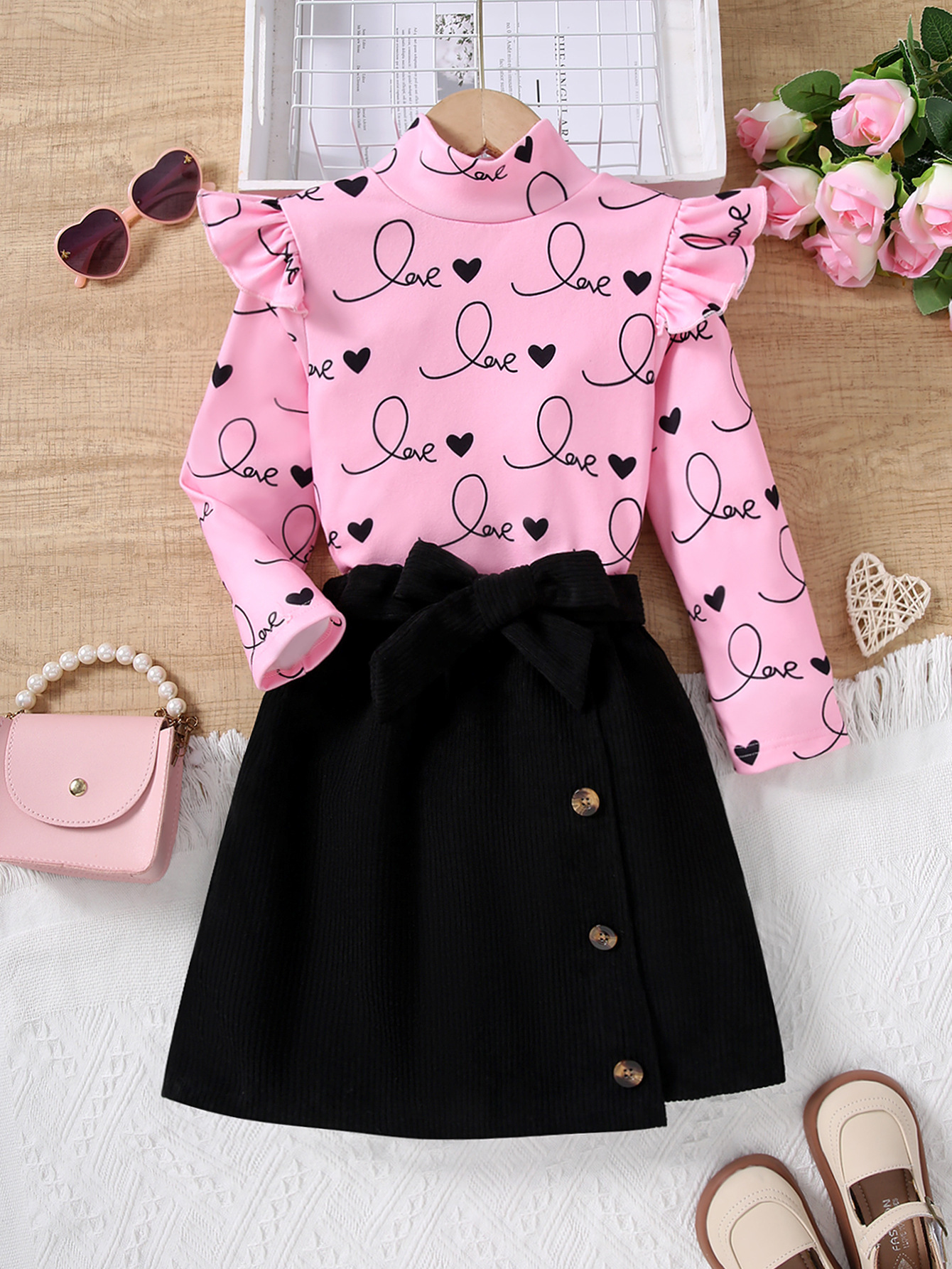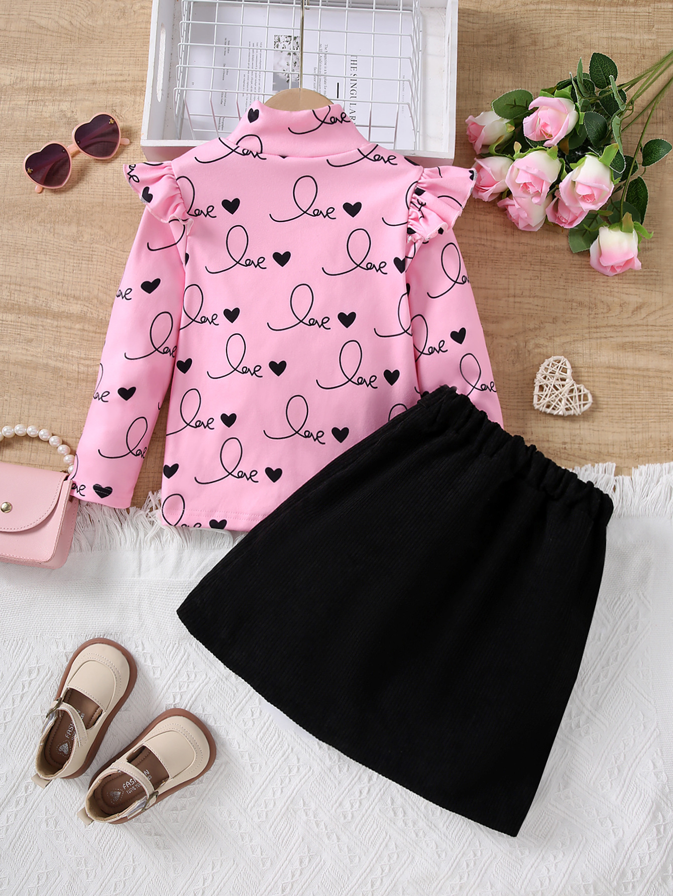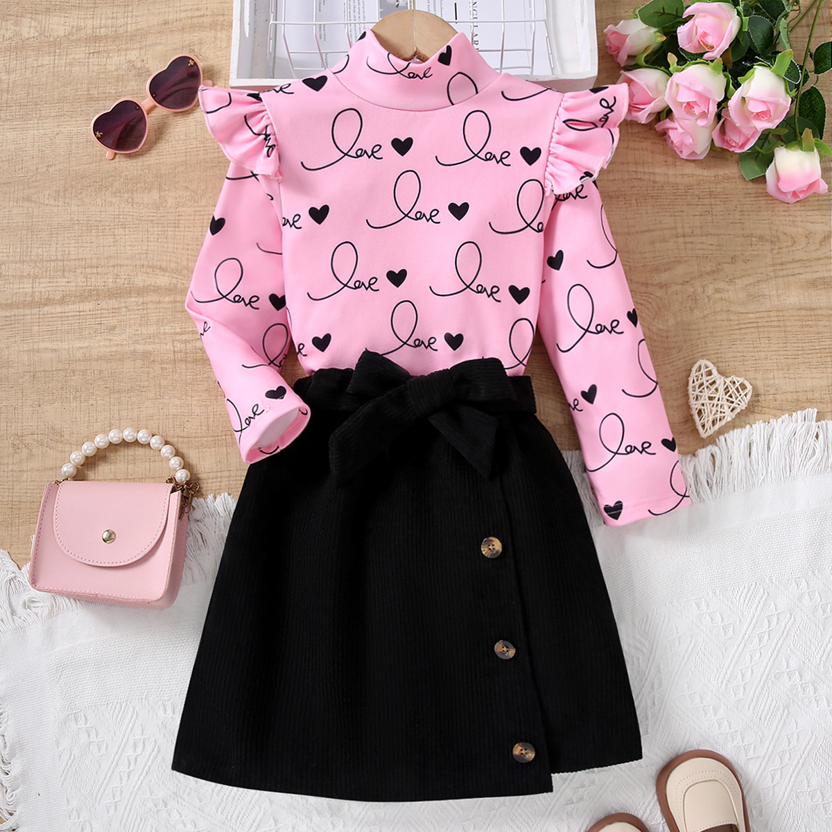 가을 겨울 여아 터틀넥 풀 프린트 하트 러플 긴팔 + 코듀로이 가짜 버튼 보우 스커트 2피스